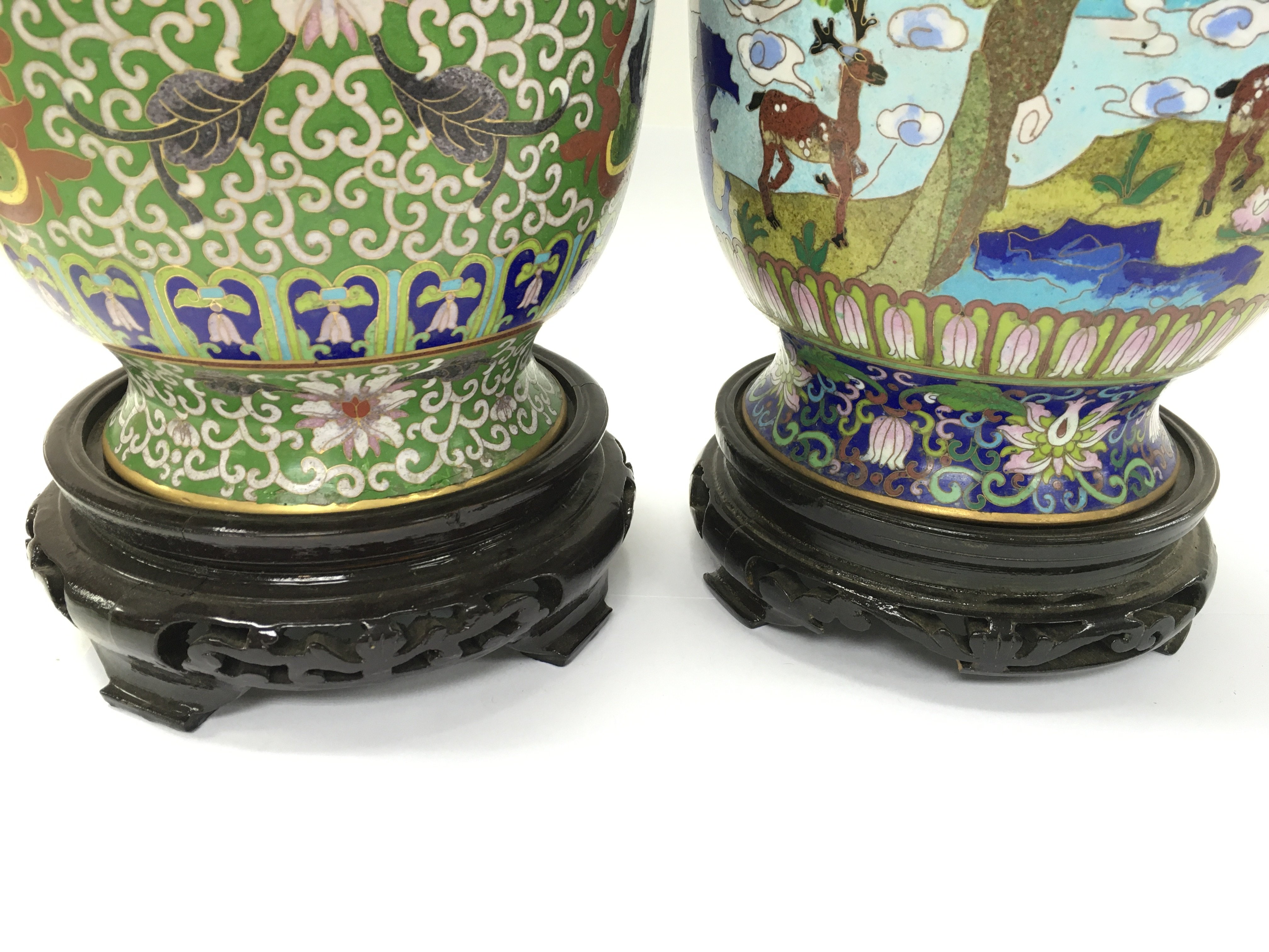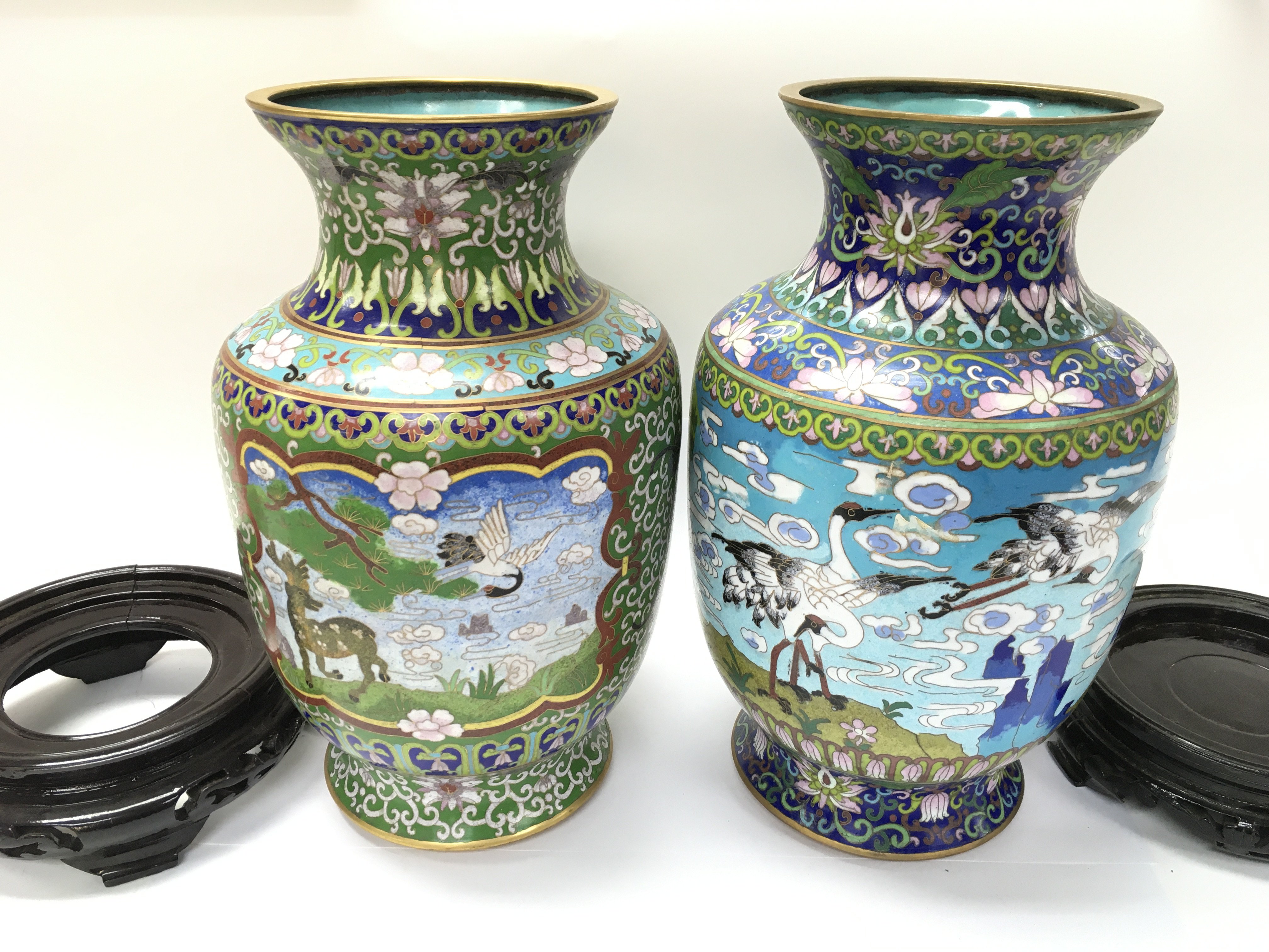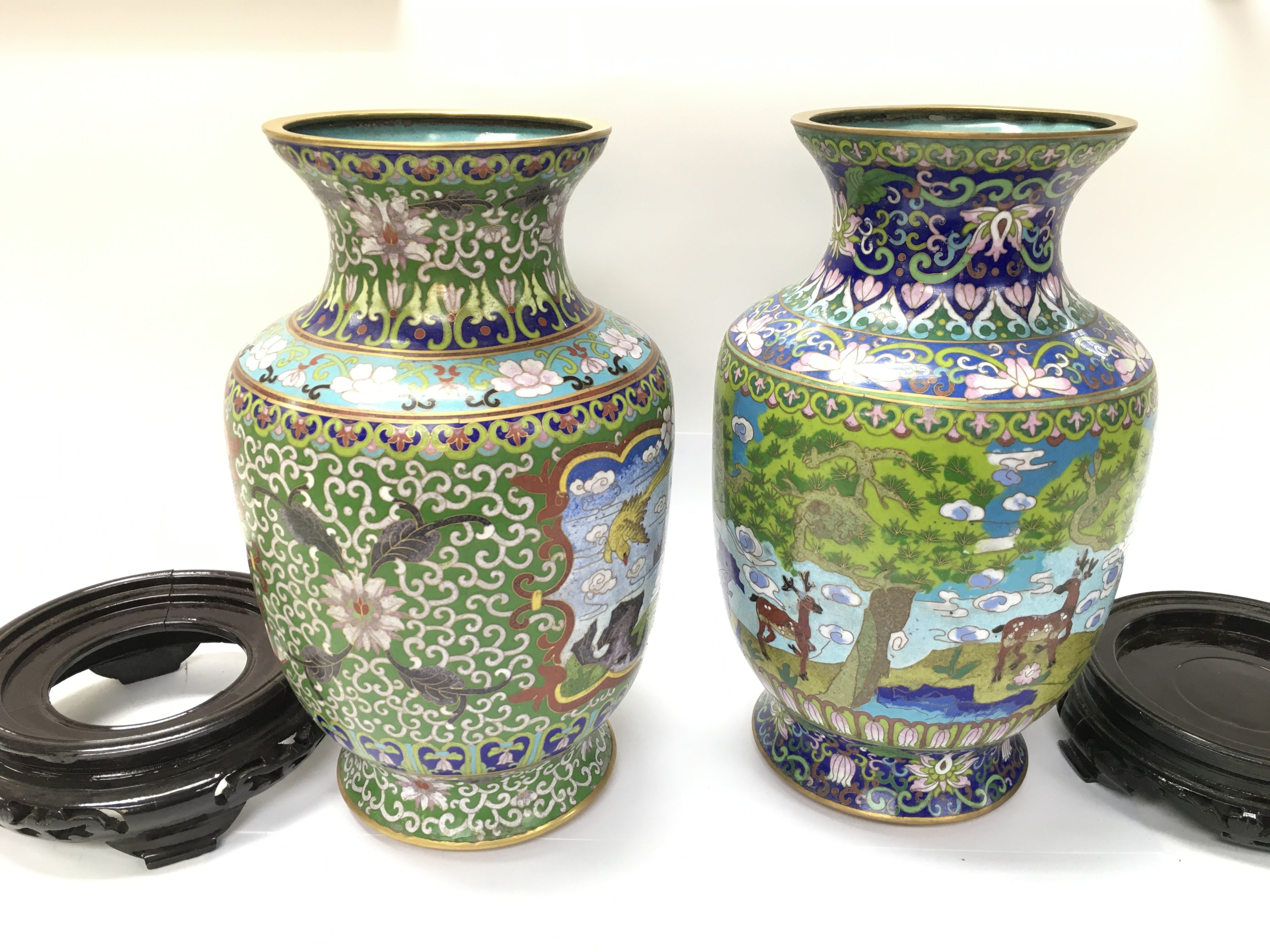 Two Chinese cloisonne enamelled vases both appear in good condition with no obvious damage. 31cm tall and approximately 18cm diameter in middle.
