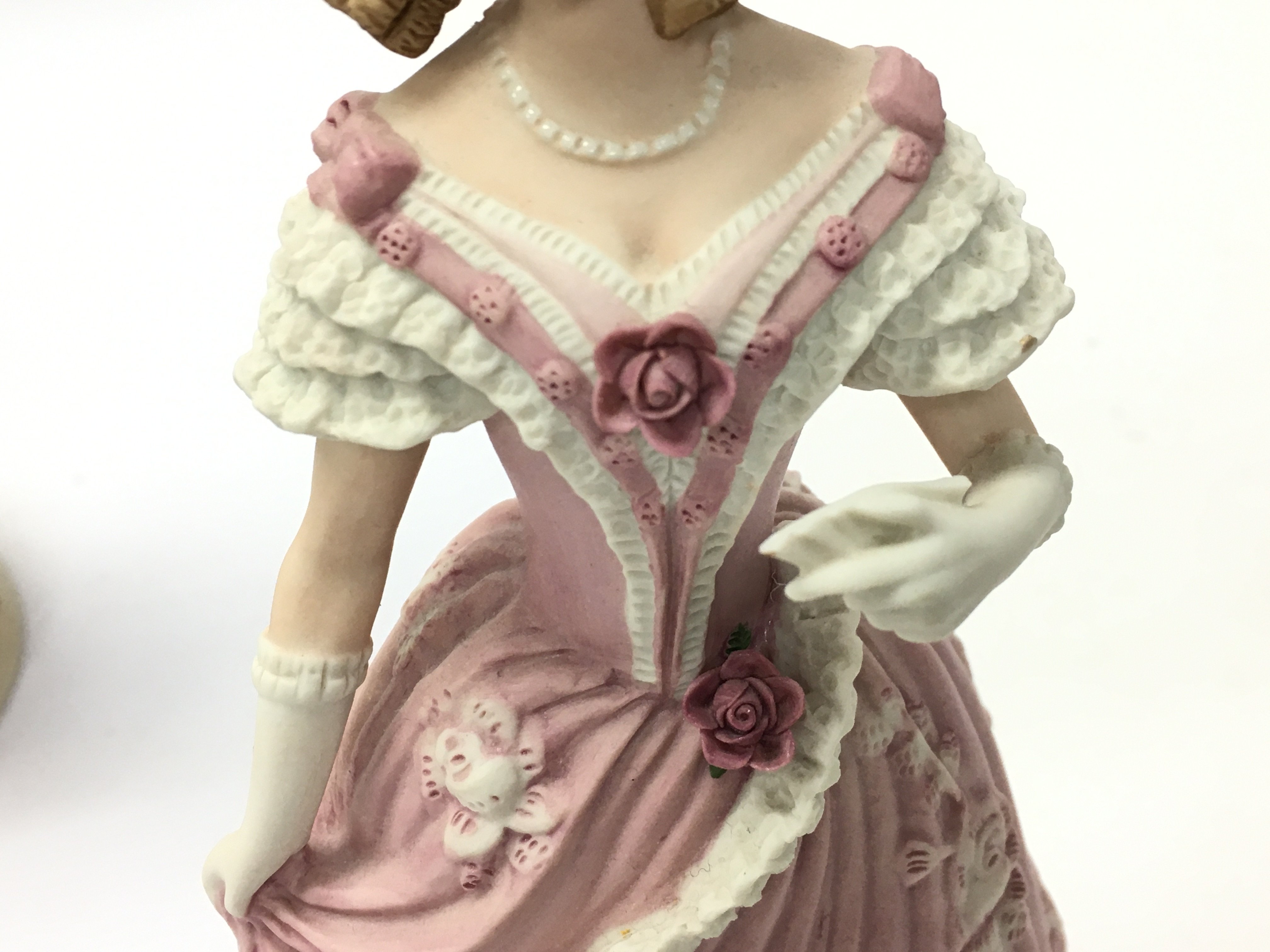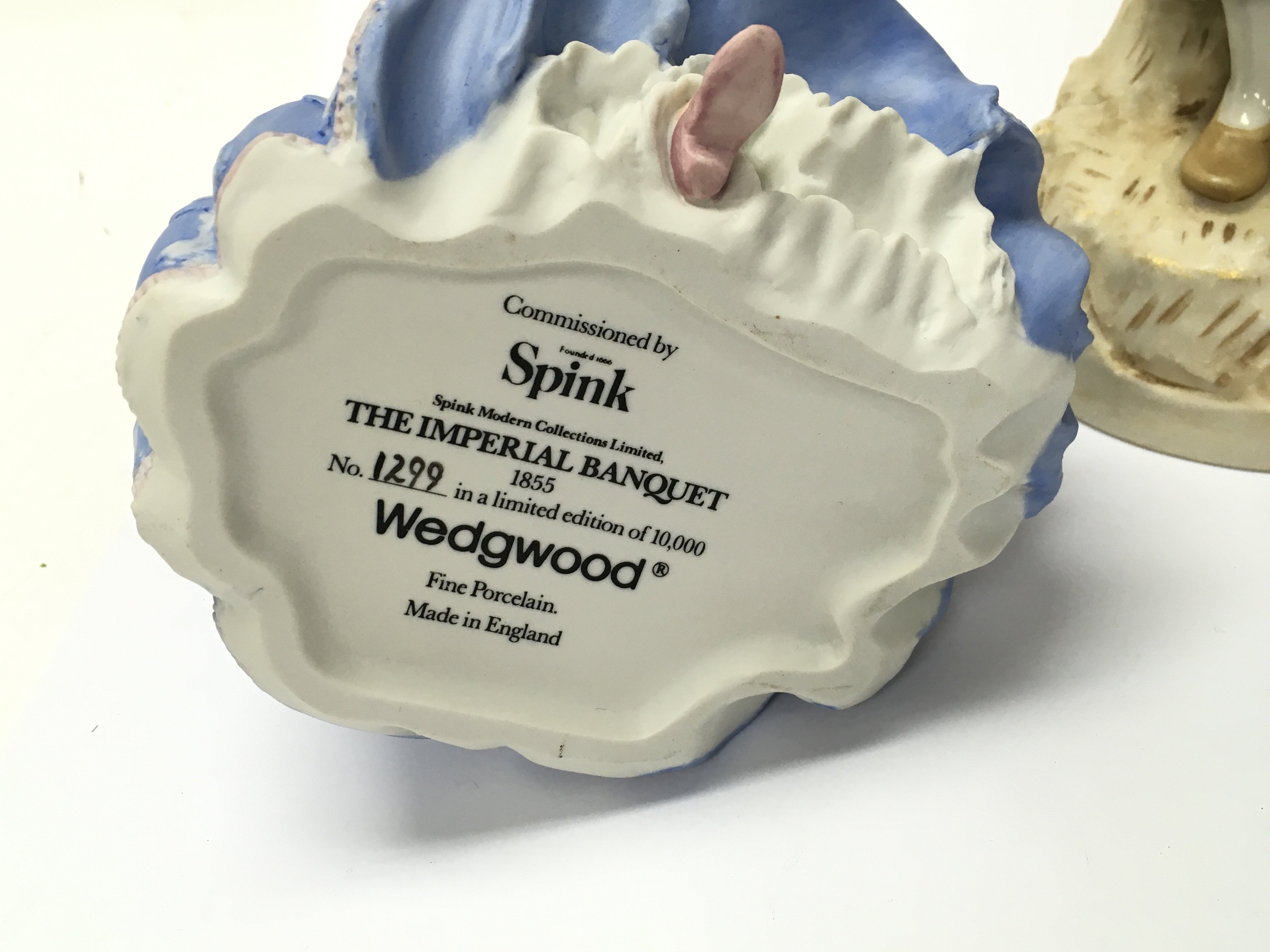 Two Wedgewood figures and a Royal Dux figure. Note damage to fan of one as pictured. Postage D