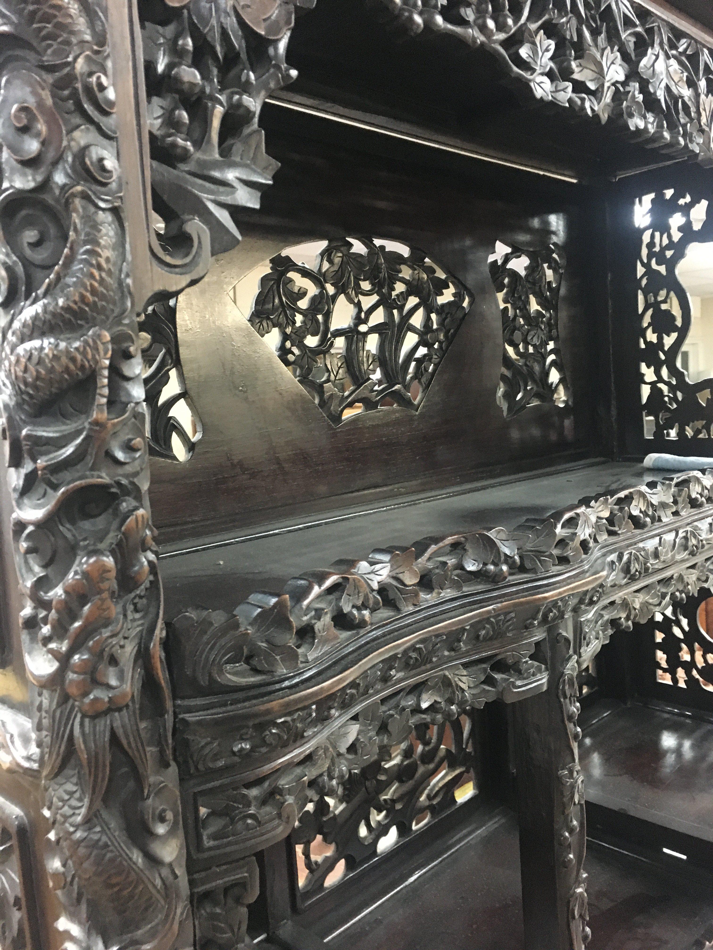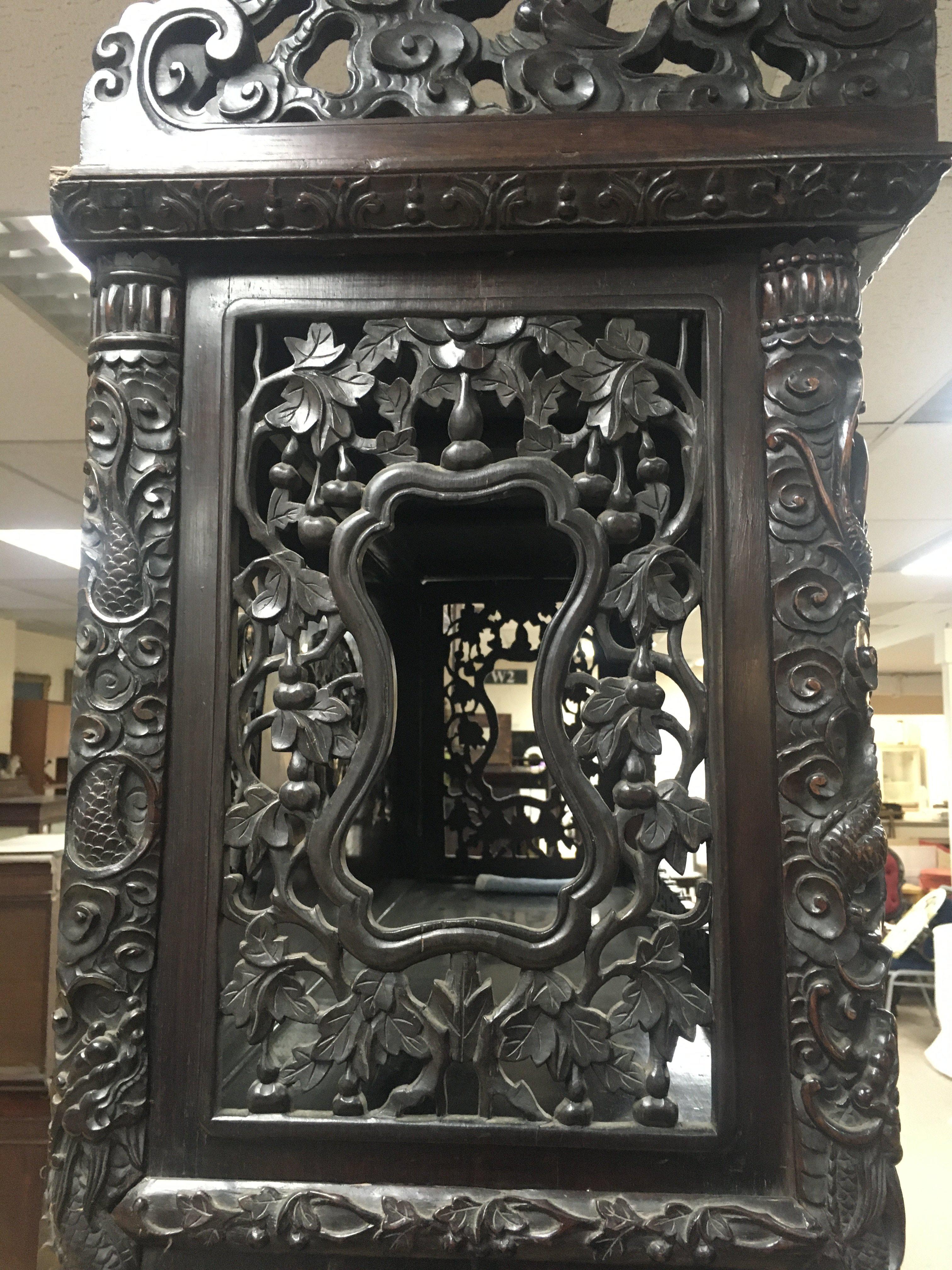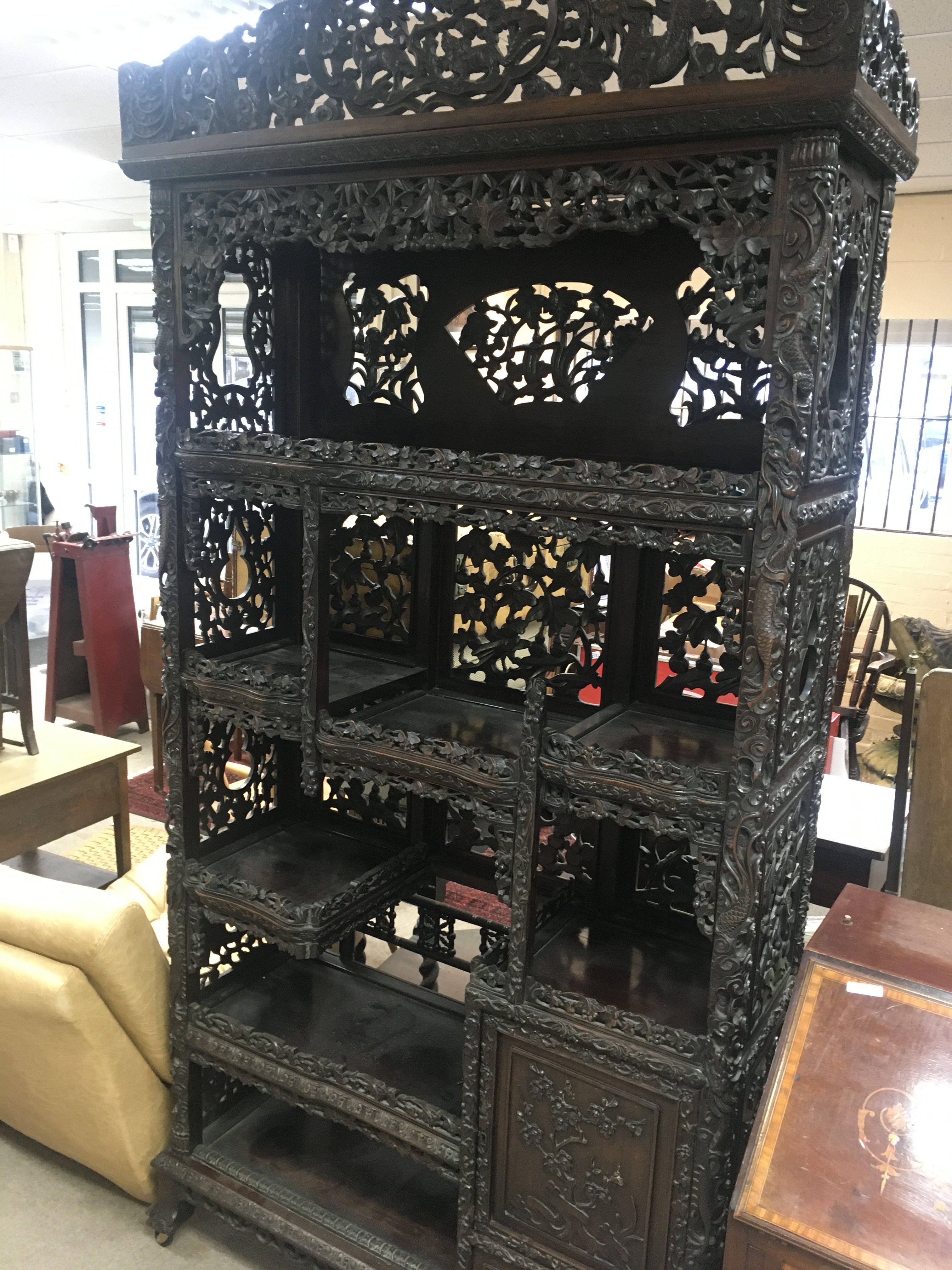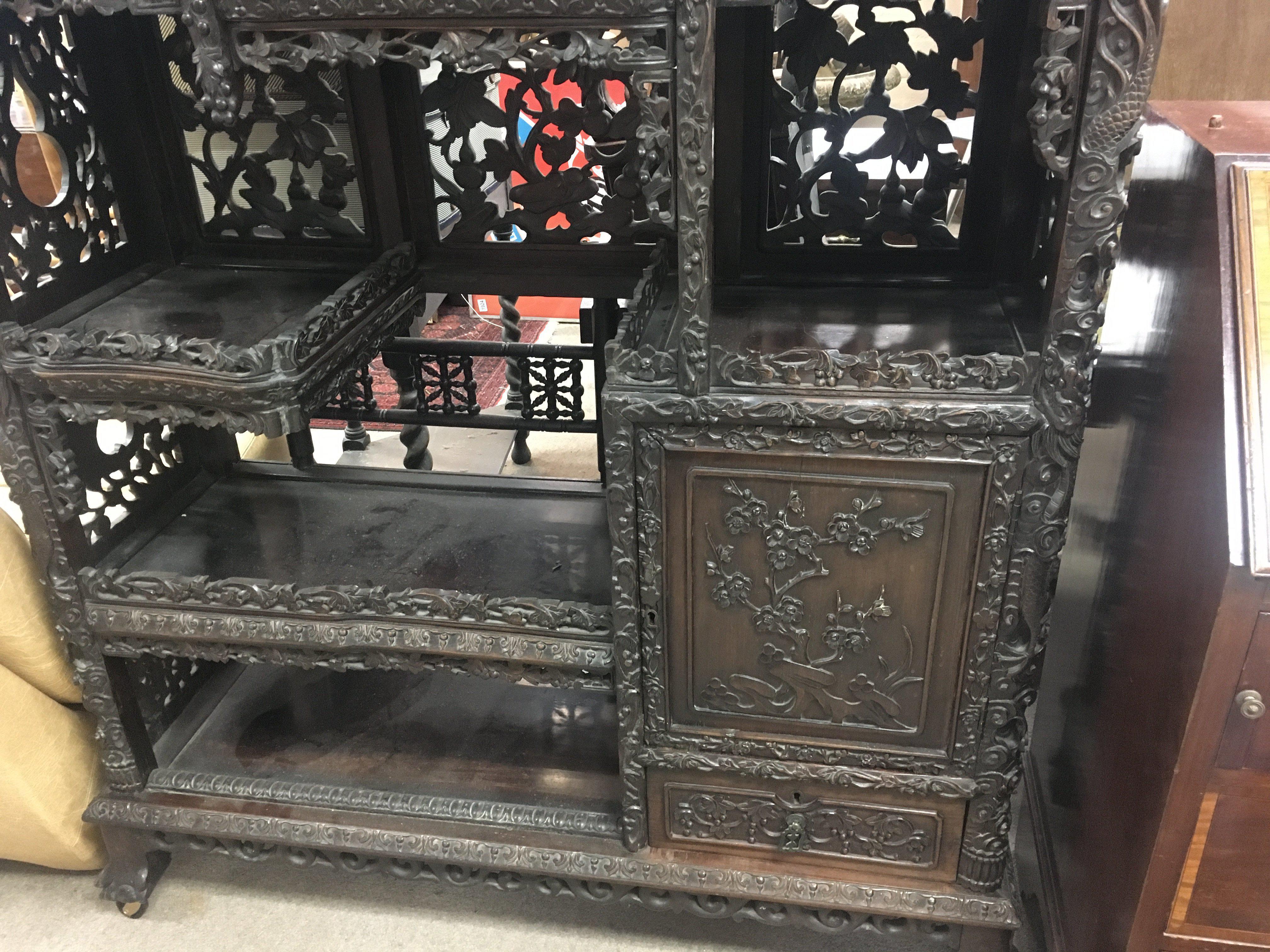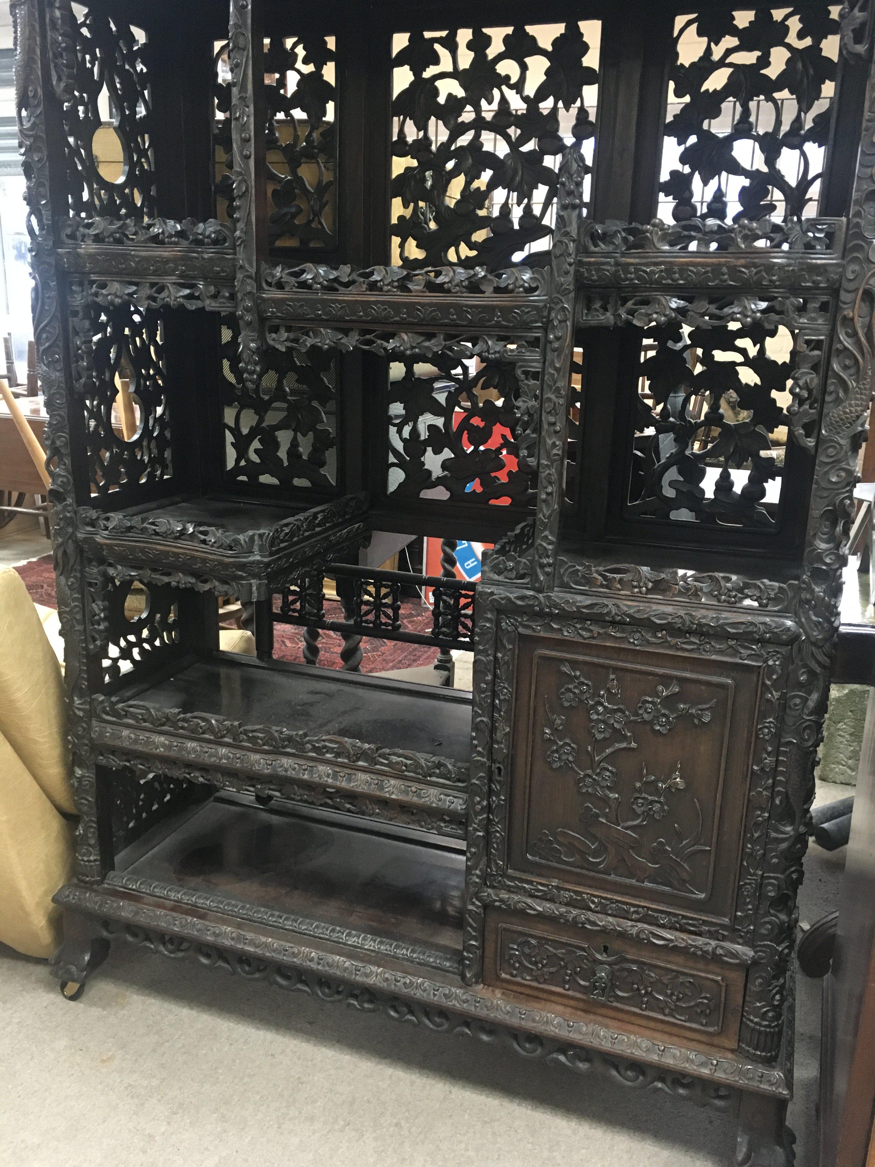 A Chinese display cabinet profusely carved with open sections single cupboard door and drawer on ball a claw feet . 104 x 220 cm