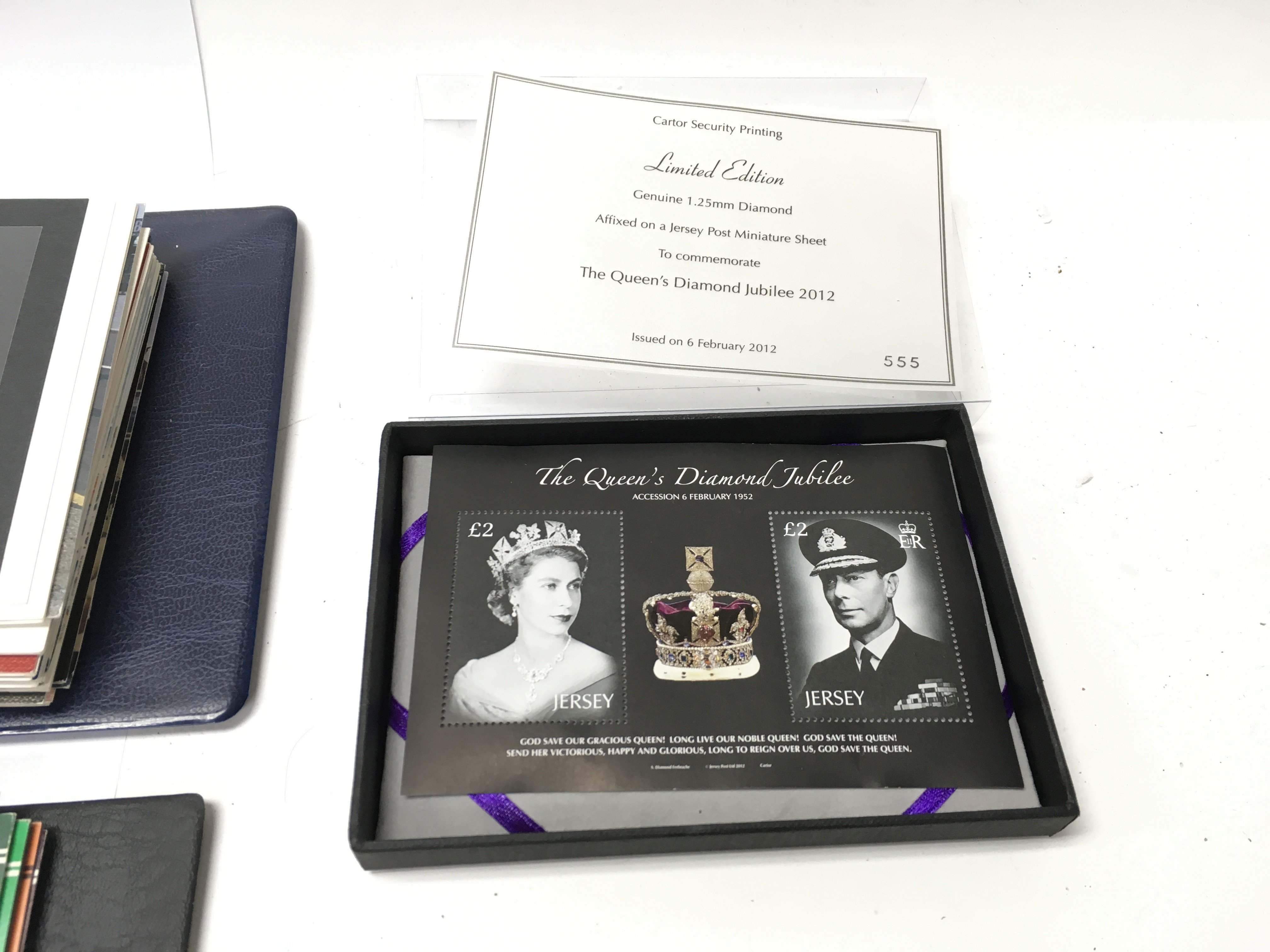 A Limited Edition queen's diamond jubilee jersey post miniature sheet along with large collection of royal mail stamp cards and other stamps. Postage B