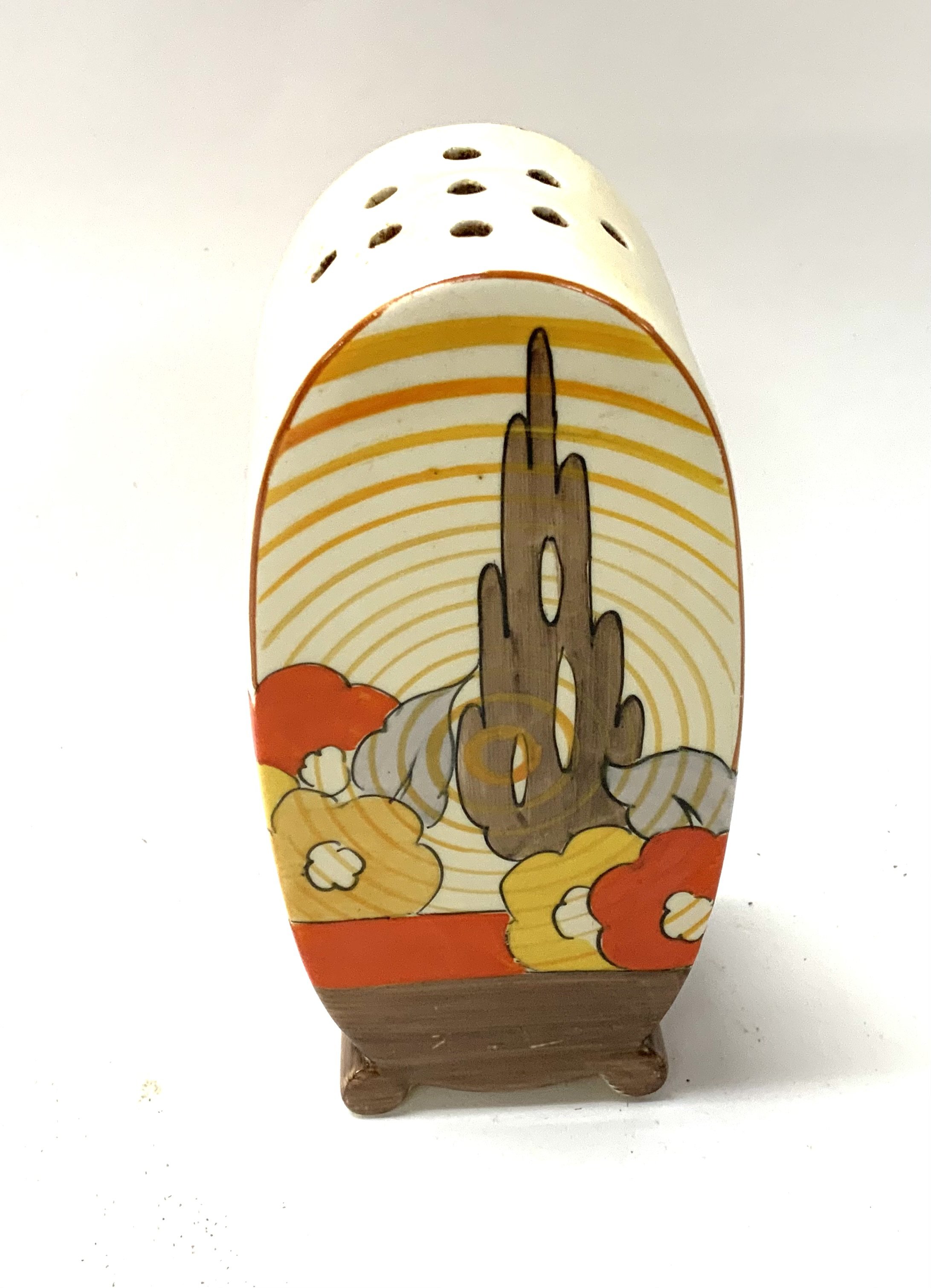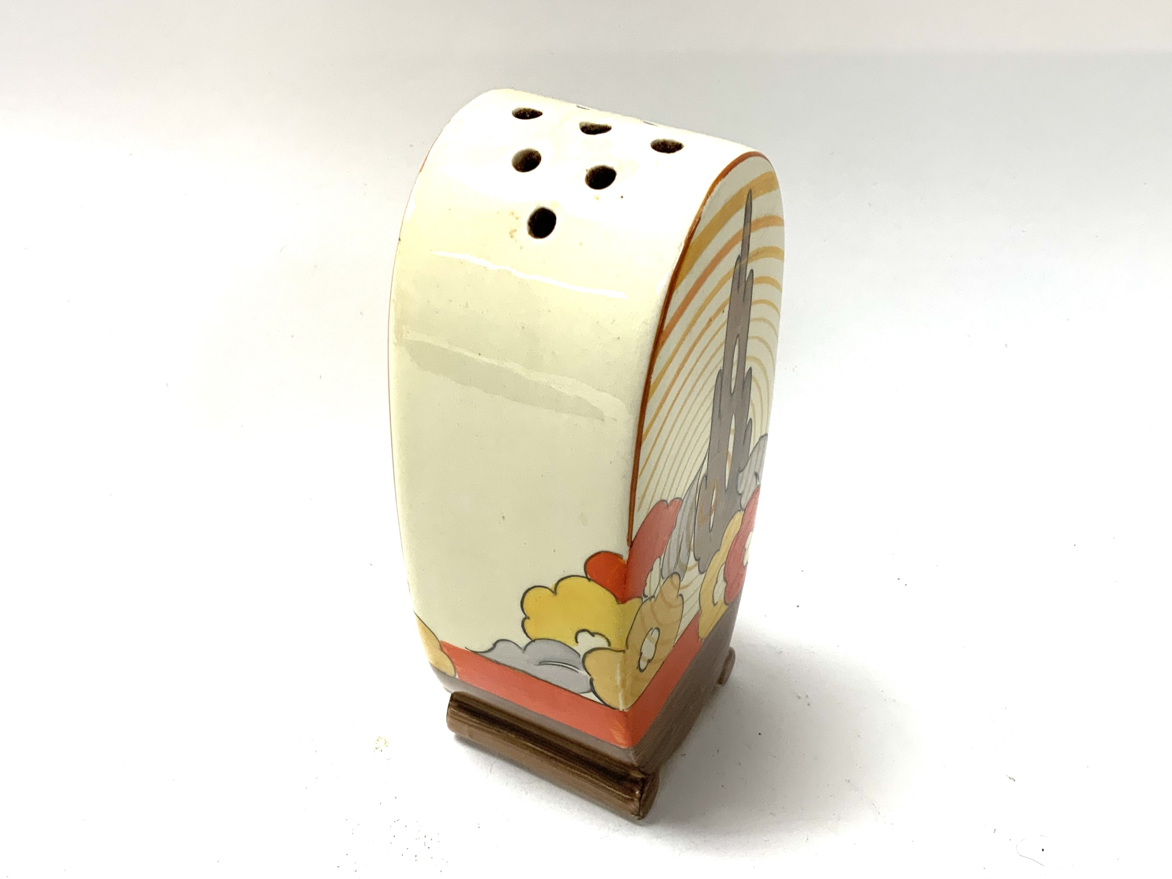 A Clarice Cliff Bonjour design sugar sifter with Capri pattern. 12.5cm, no damage or restoration. (D) (unmarked).