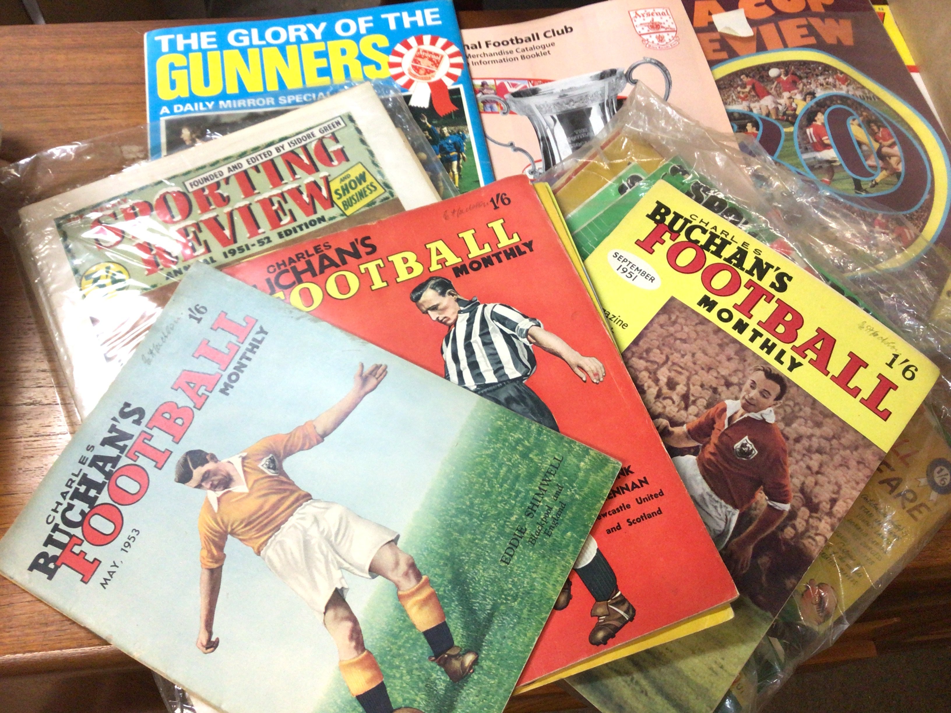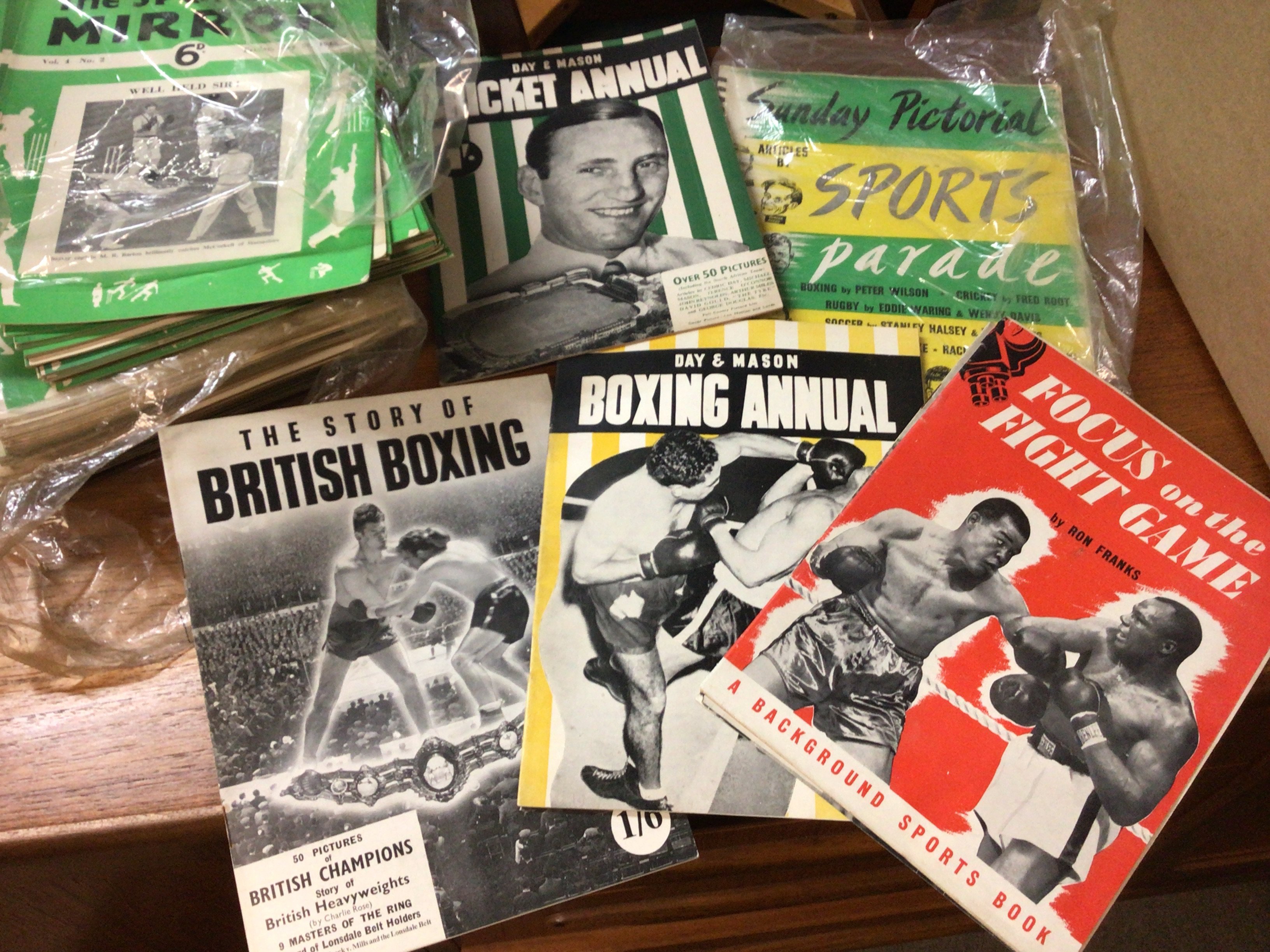 A collection of vintage football magazines includes Sport Weekly magazine, Charles Butchans Football monthly, a few boxing magazines etc