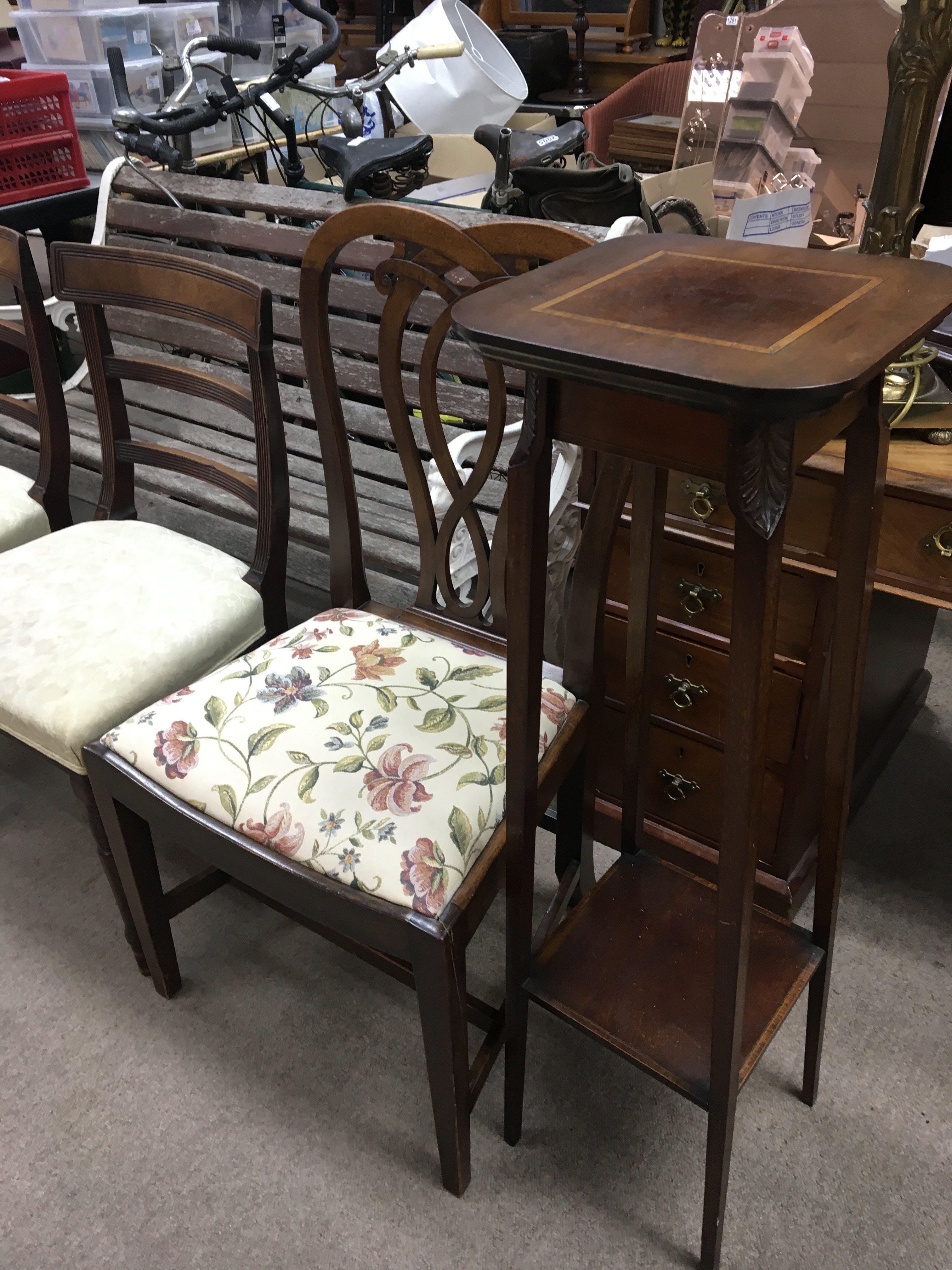 A pair of George III mahogany dining chairs with turned legs one othe late George III chair and an Edwardian plant stand (4) NO RESERVE