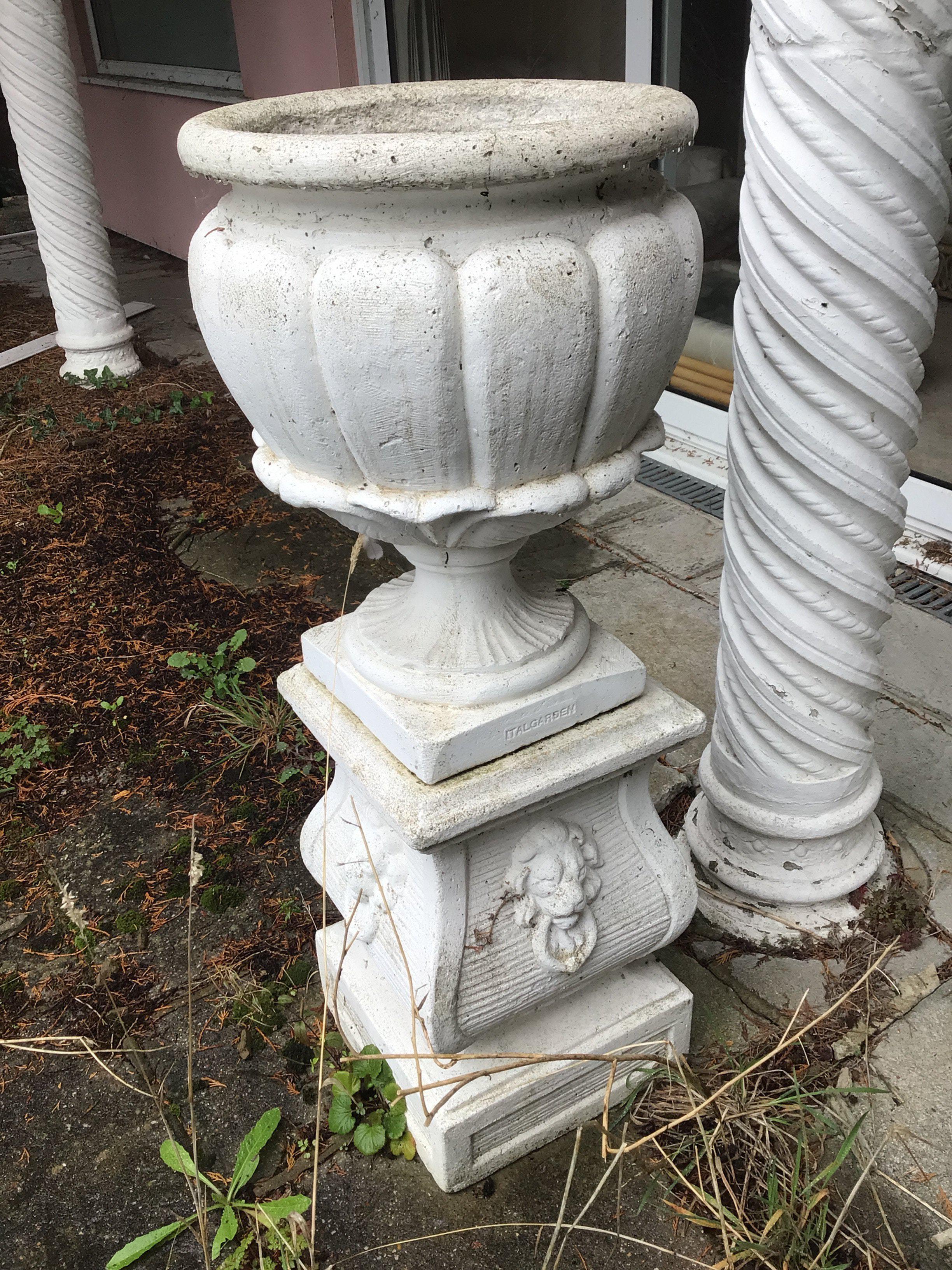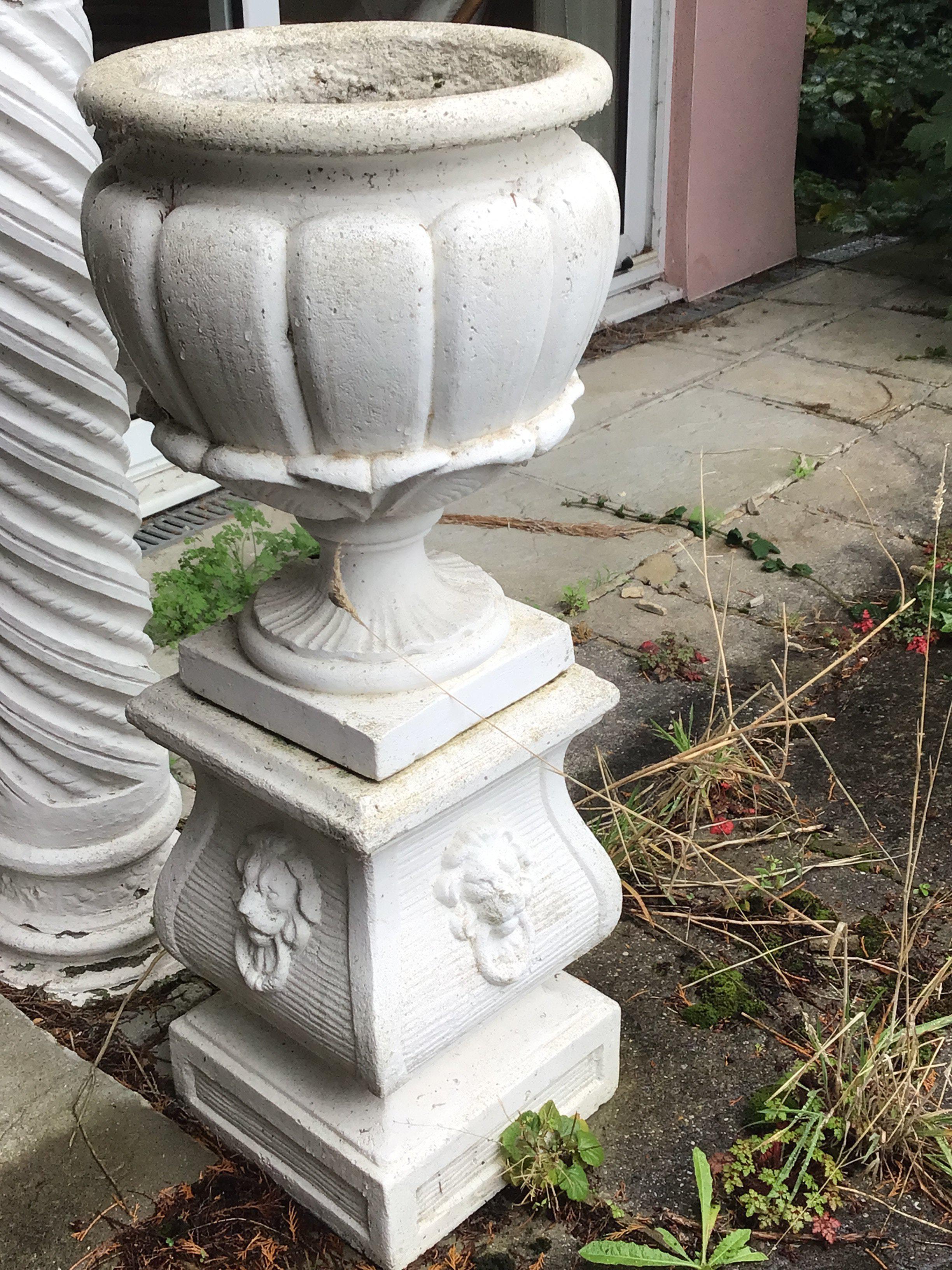 A composition garden urn and stand of classical influences with stylised acanthus leaves the base with raised lion masks good Condition and with makers stamp height 109cm sold in situ buyer to collect. NO RESERVE