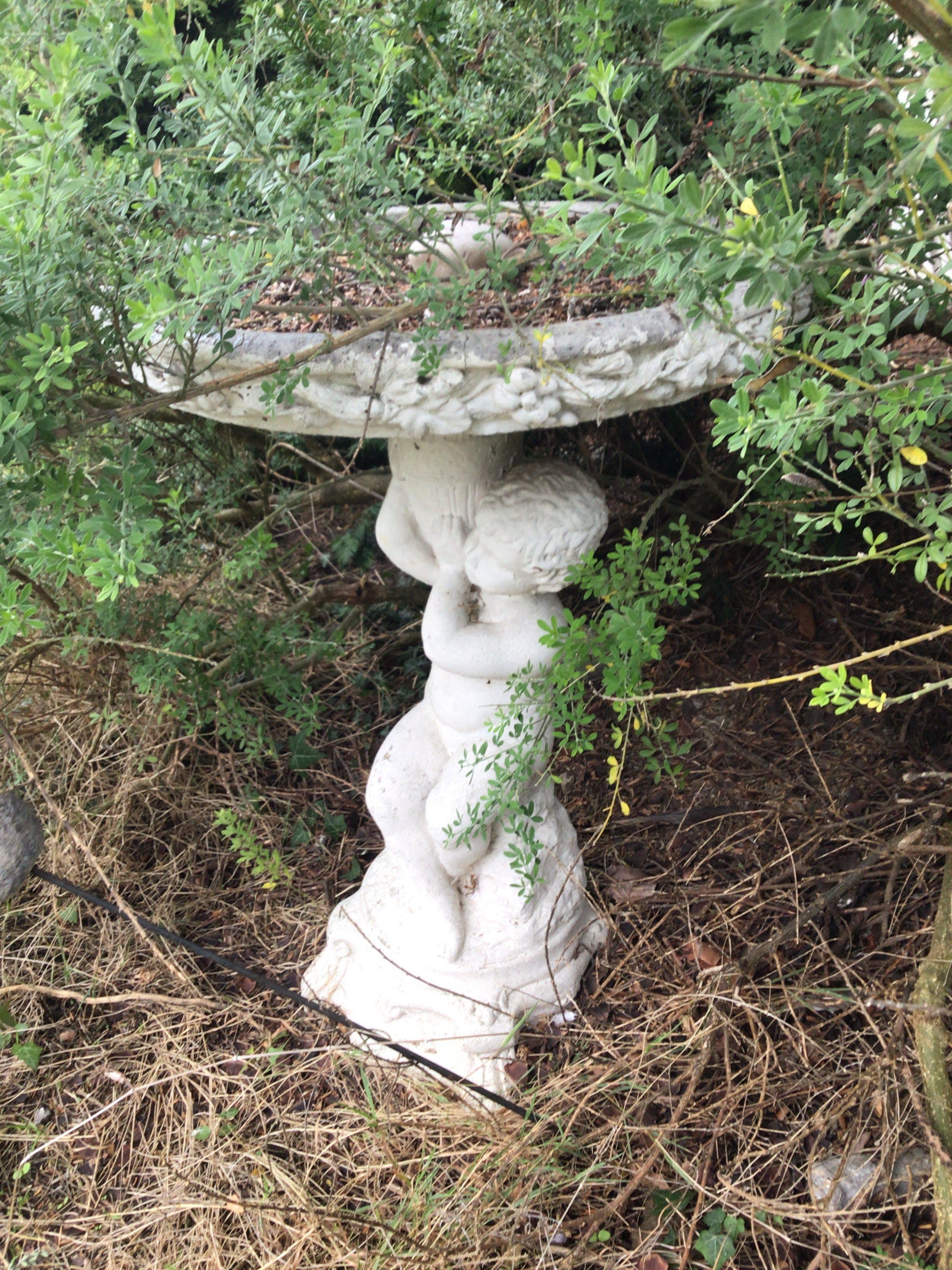 A concrete, composition, garden ornaments in the form of a putti reading a book and a bird bath Hight 73cm sold in situ good condition buyer to collect (2) NO RESERVE
