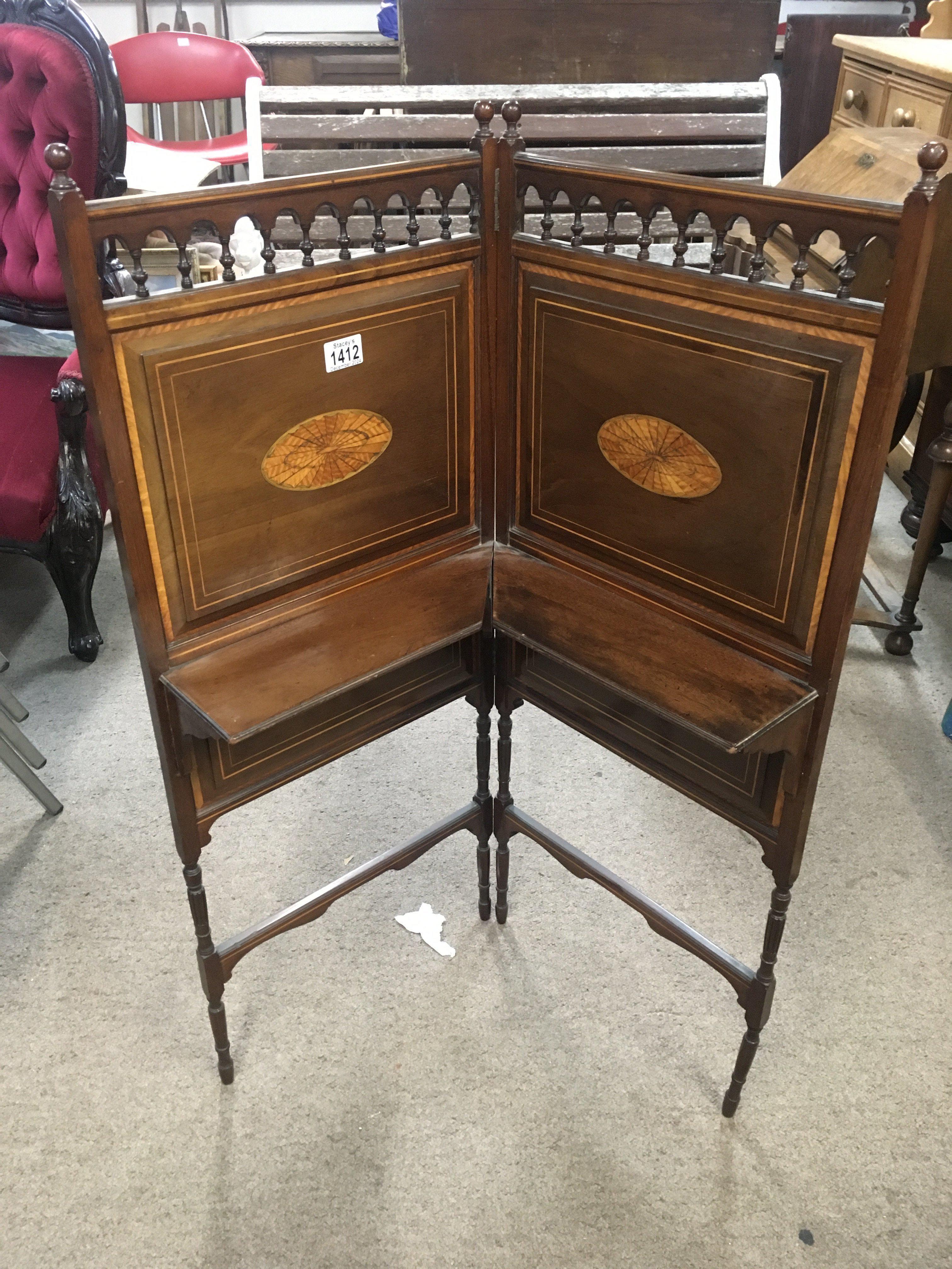 An Edwardian folding screen with mahogany inlay and a stool screen.