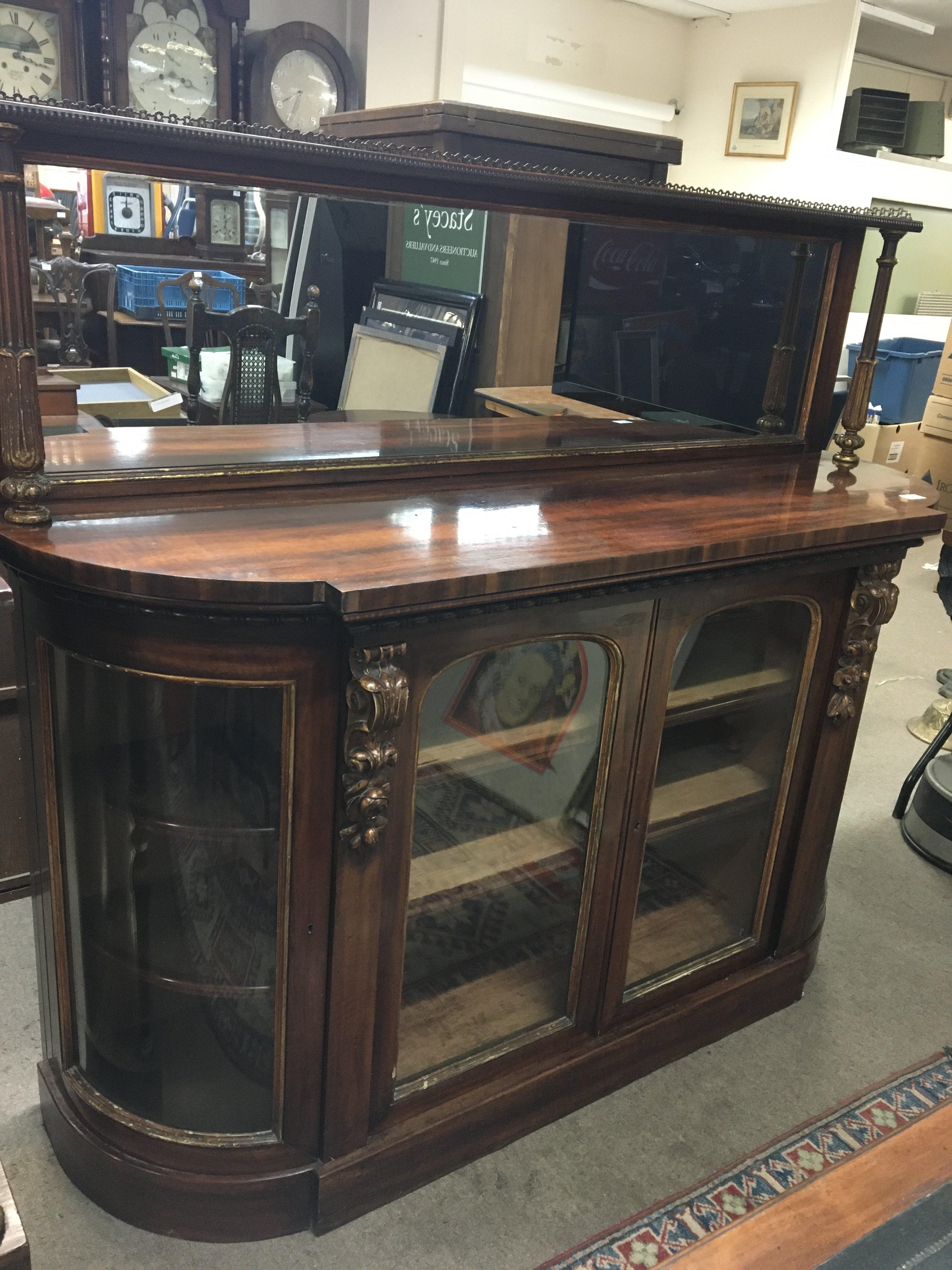 A Quality Early Victorian Walnut credenza with a raised mirrored back with gilded pillar supports above glazed doors with glazed bowed glass ends in very good original condition.158cm long height 135cm 48cm deep.