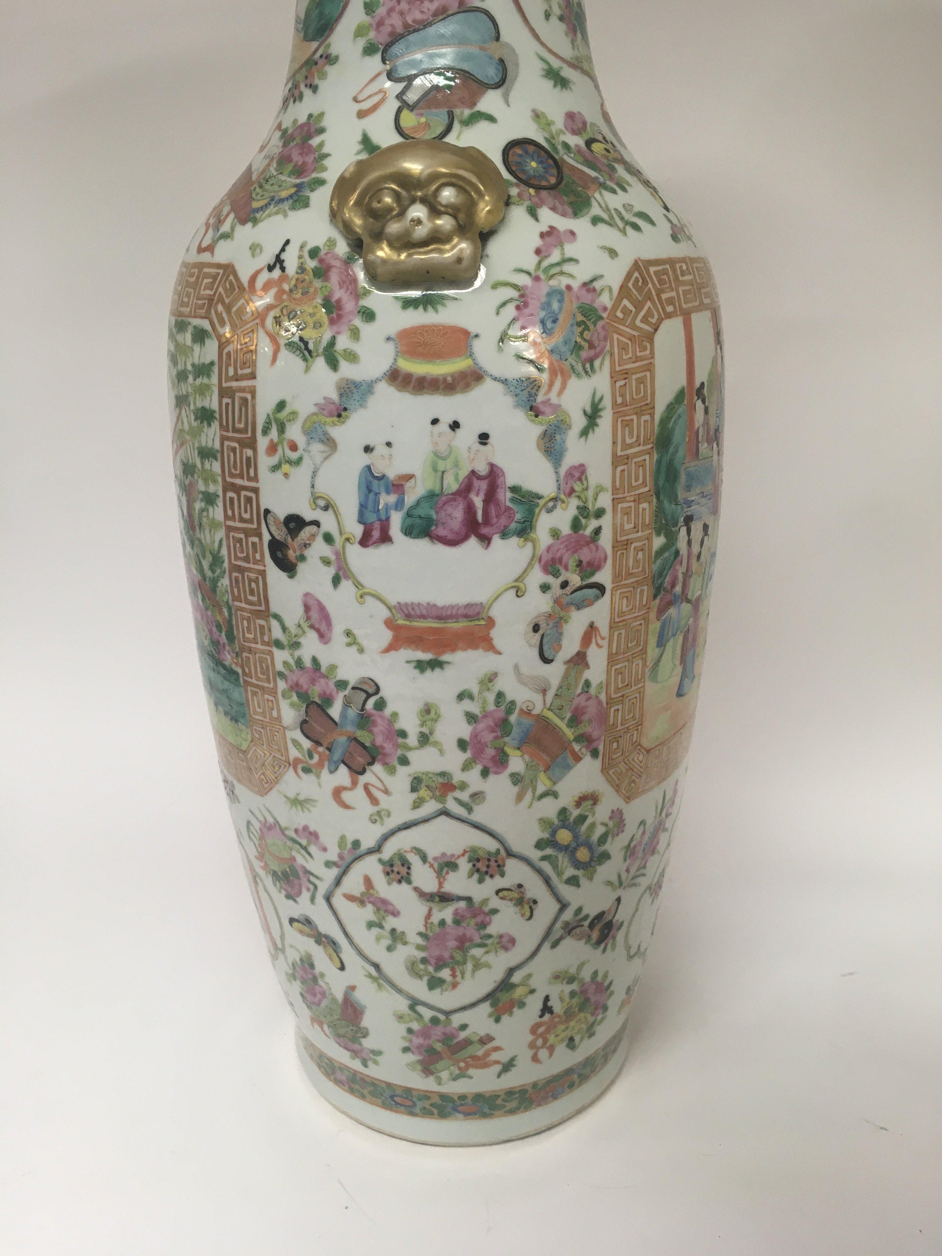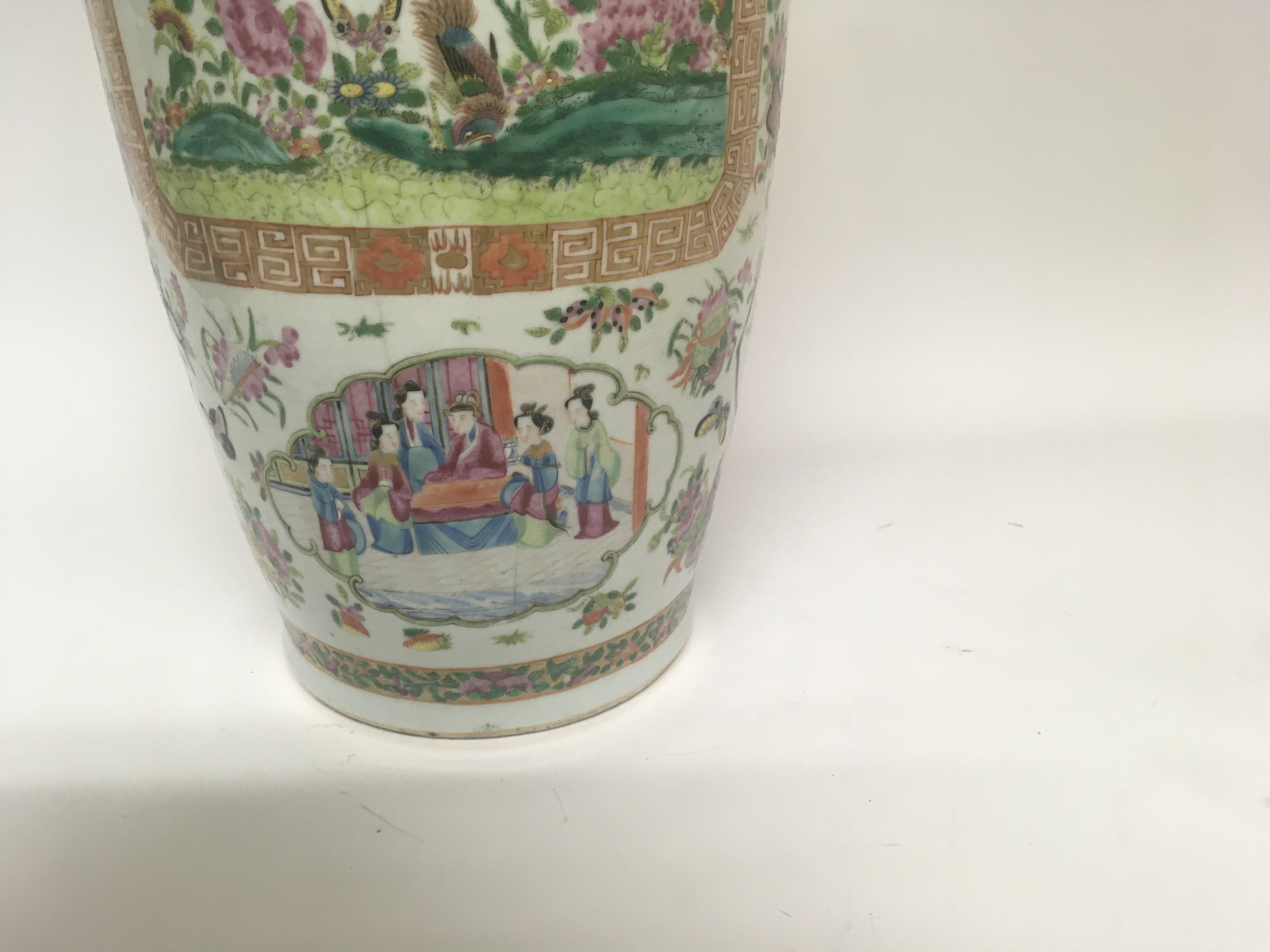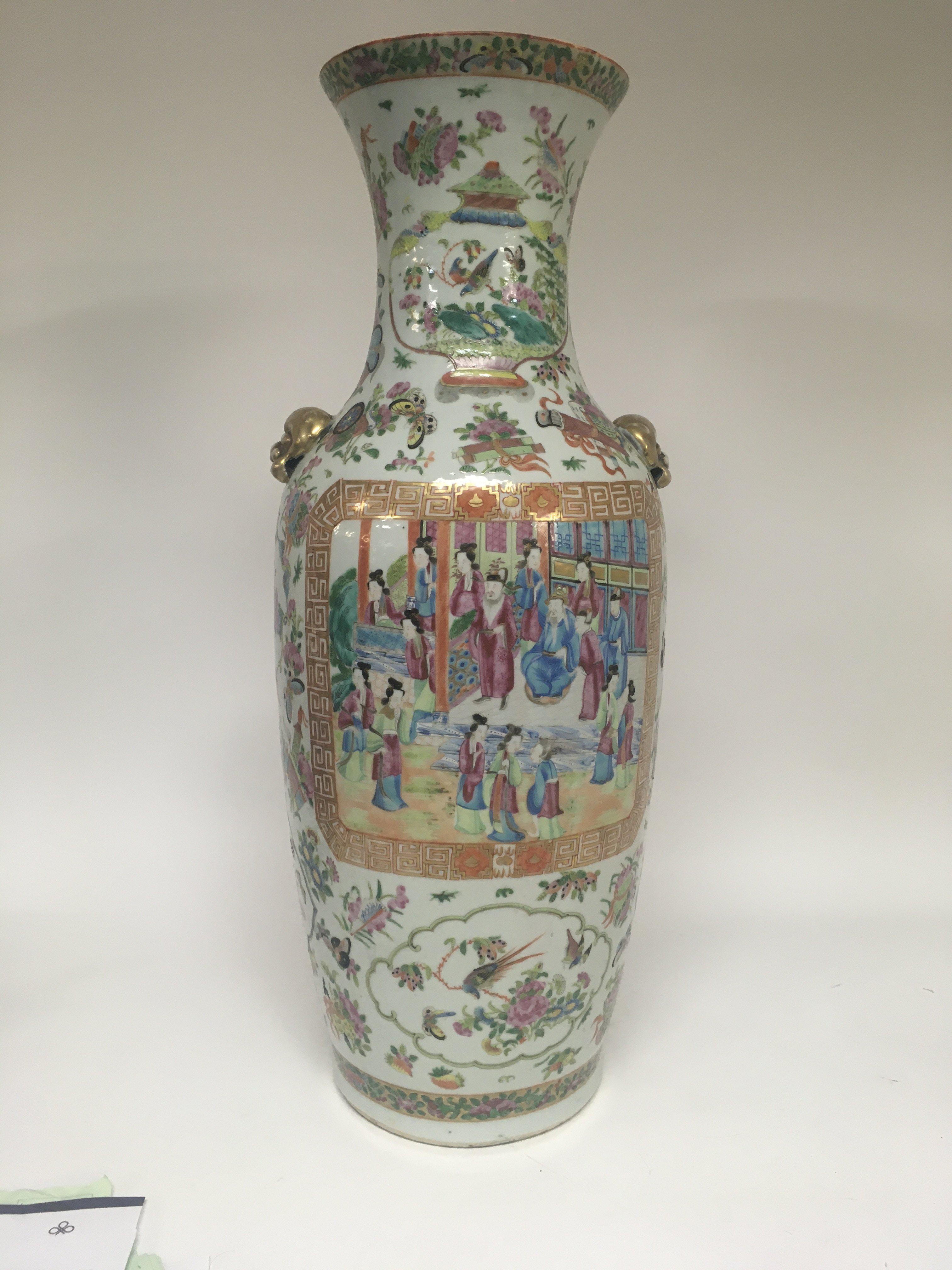 A large canton vase decorated with figures birds butterflies and flowers 62 cm . Hairline crack.