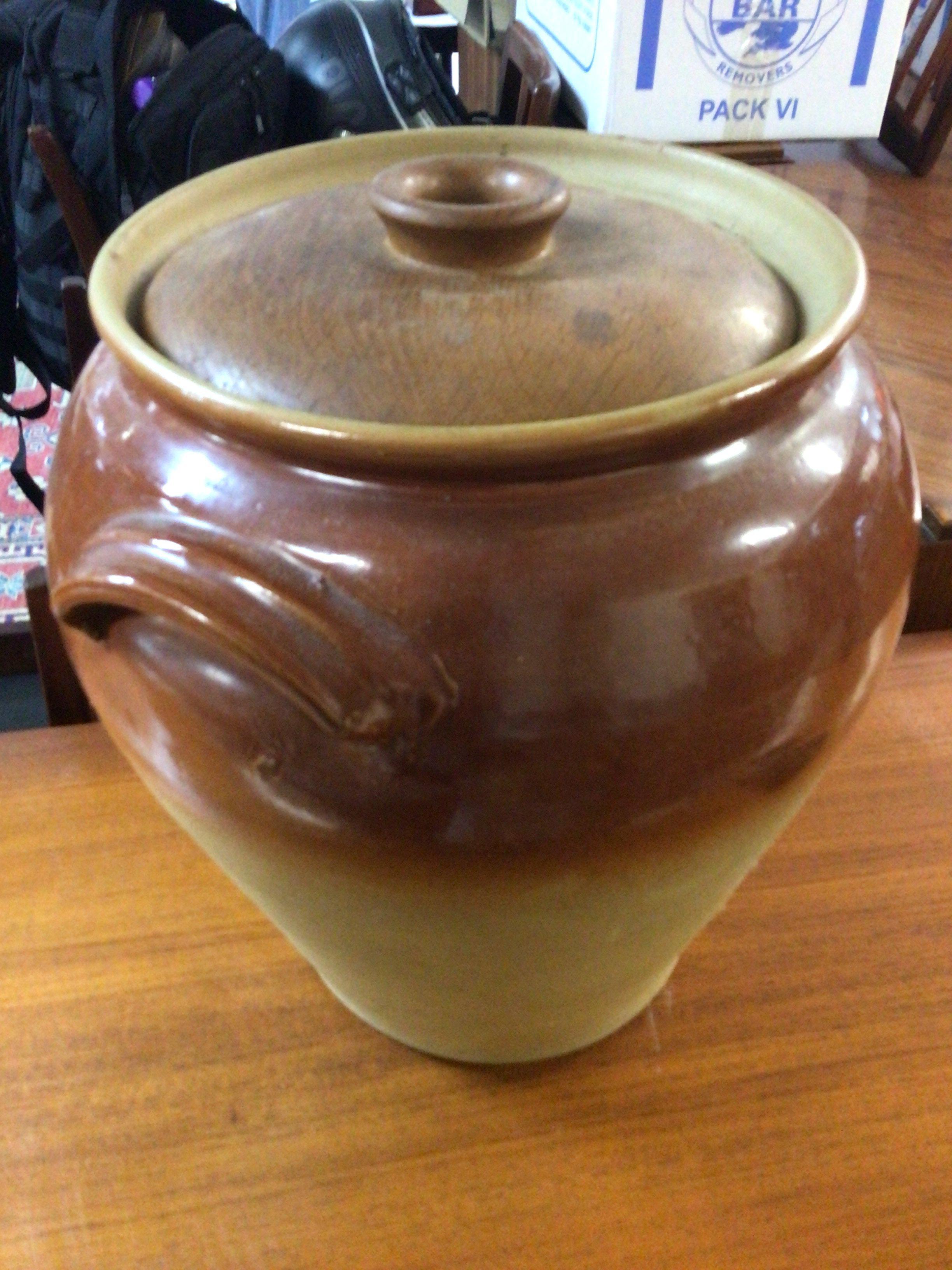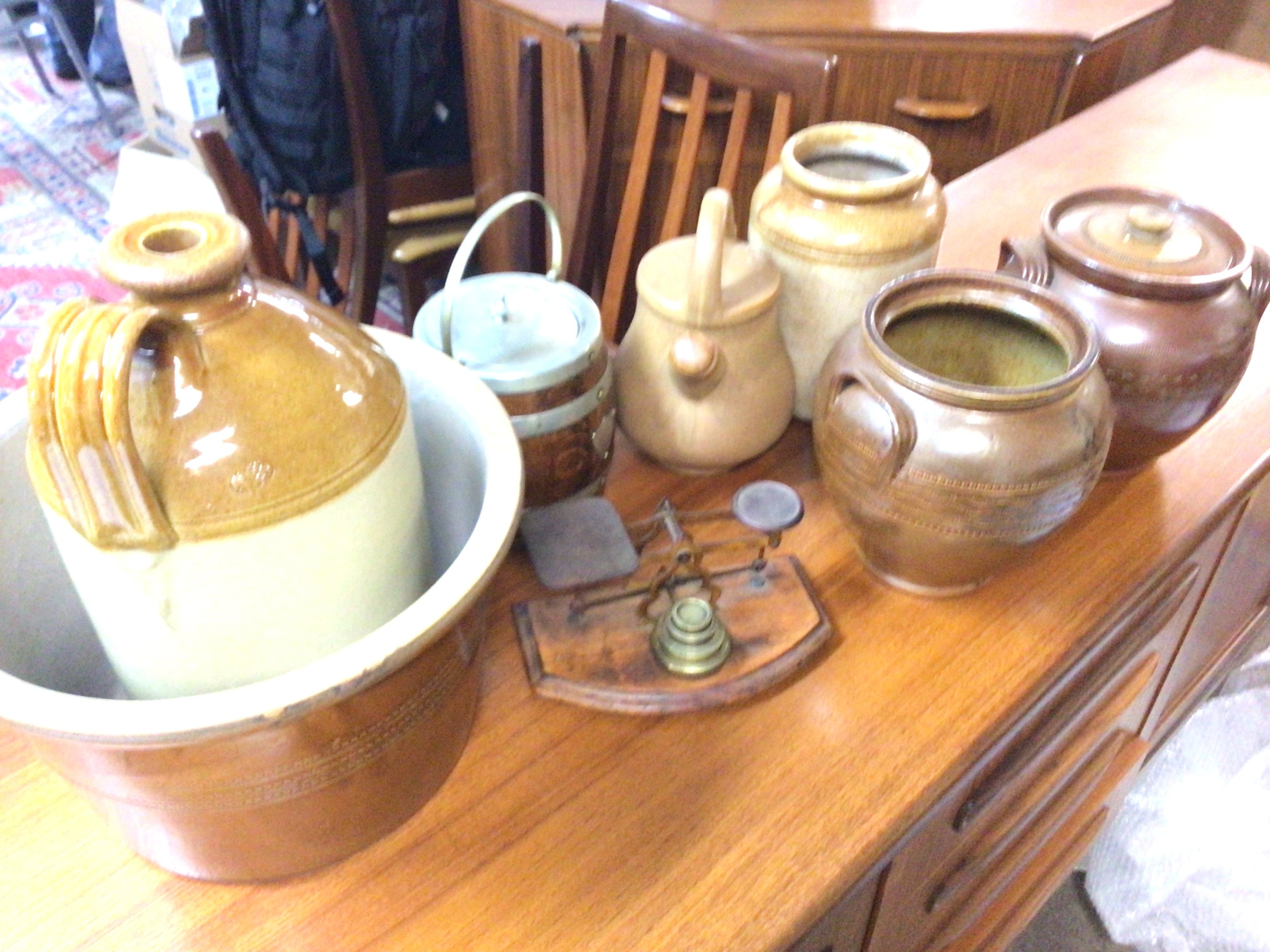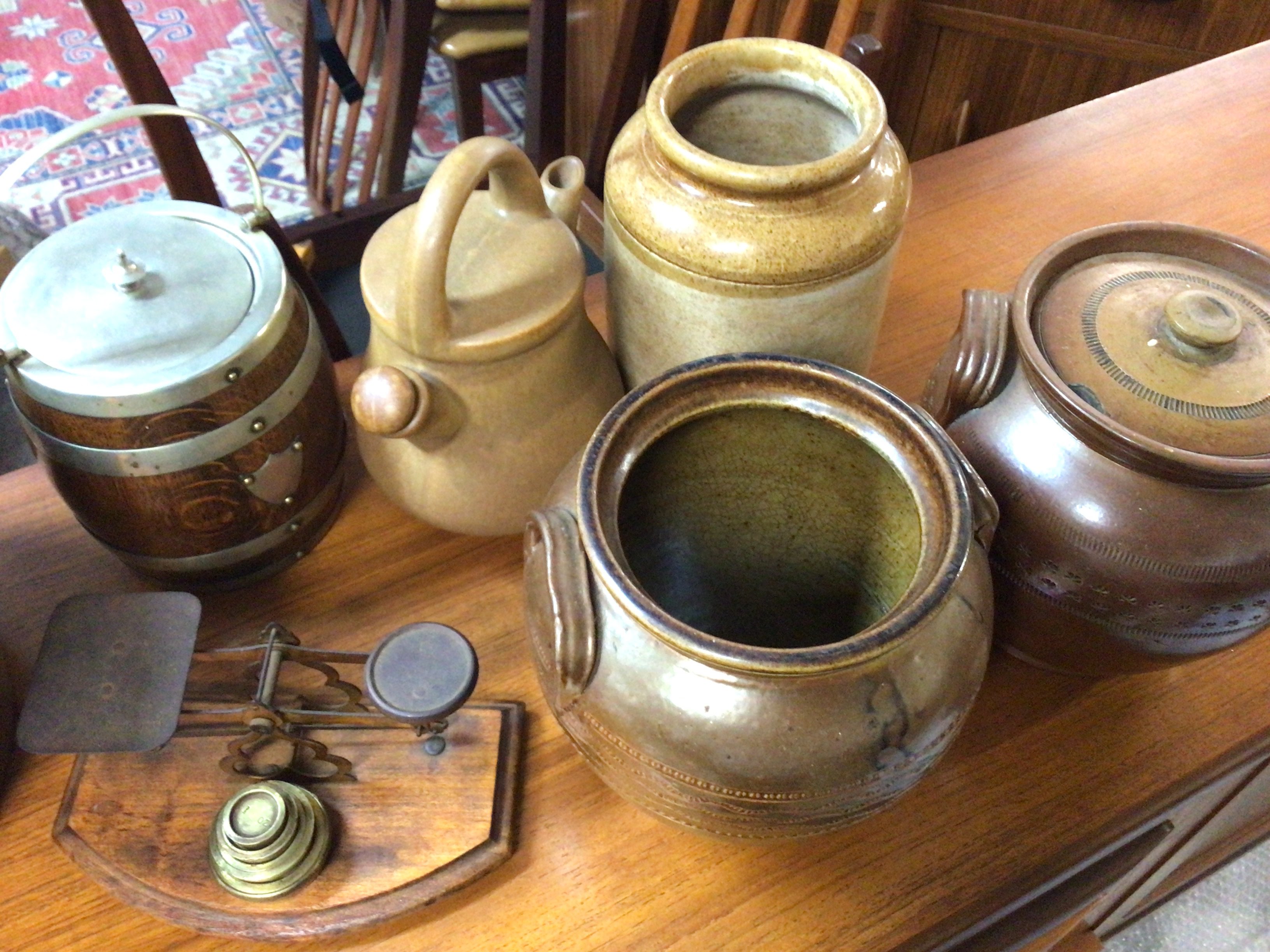 A collection of stoneware jars including a large oak lid topped jar and a set of postal scales etc. This lot cannot be posted