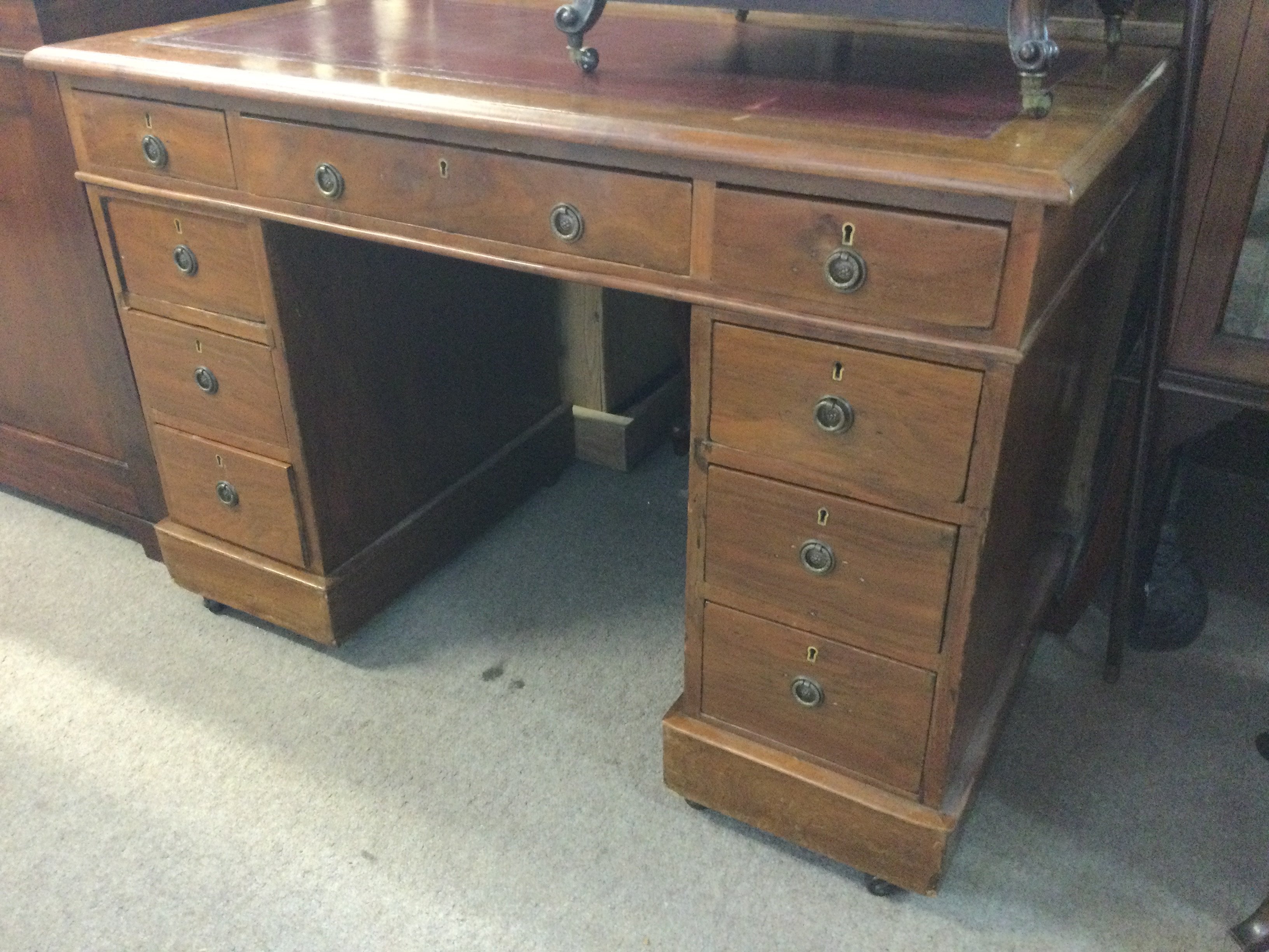A Edwardian mahogany pedestal desk fitted with seven drawers on a plinth base .105 x 55 cm. NO RESERVE