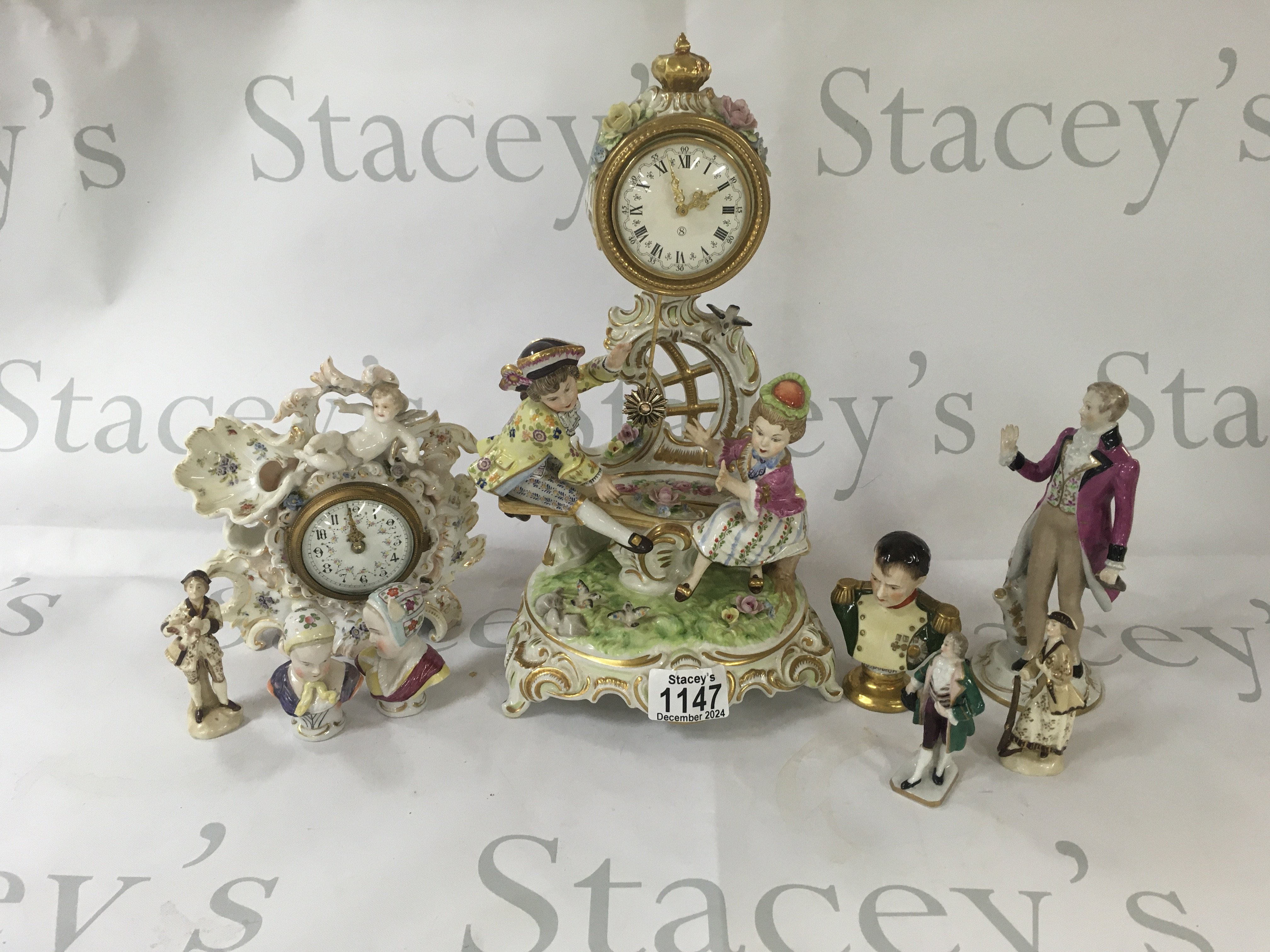 A collection of small busts with ceramic figures and a ceramic clock.