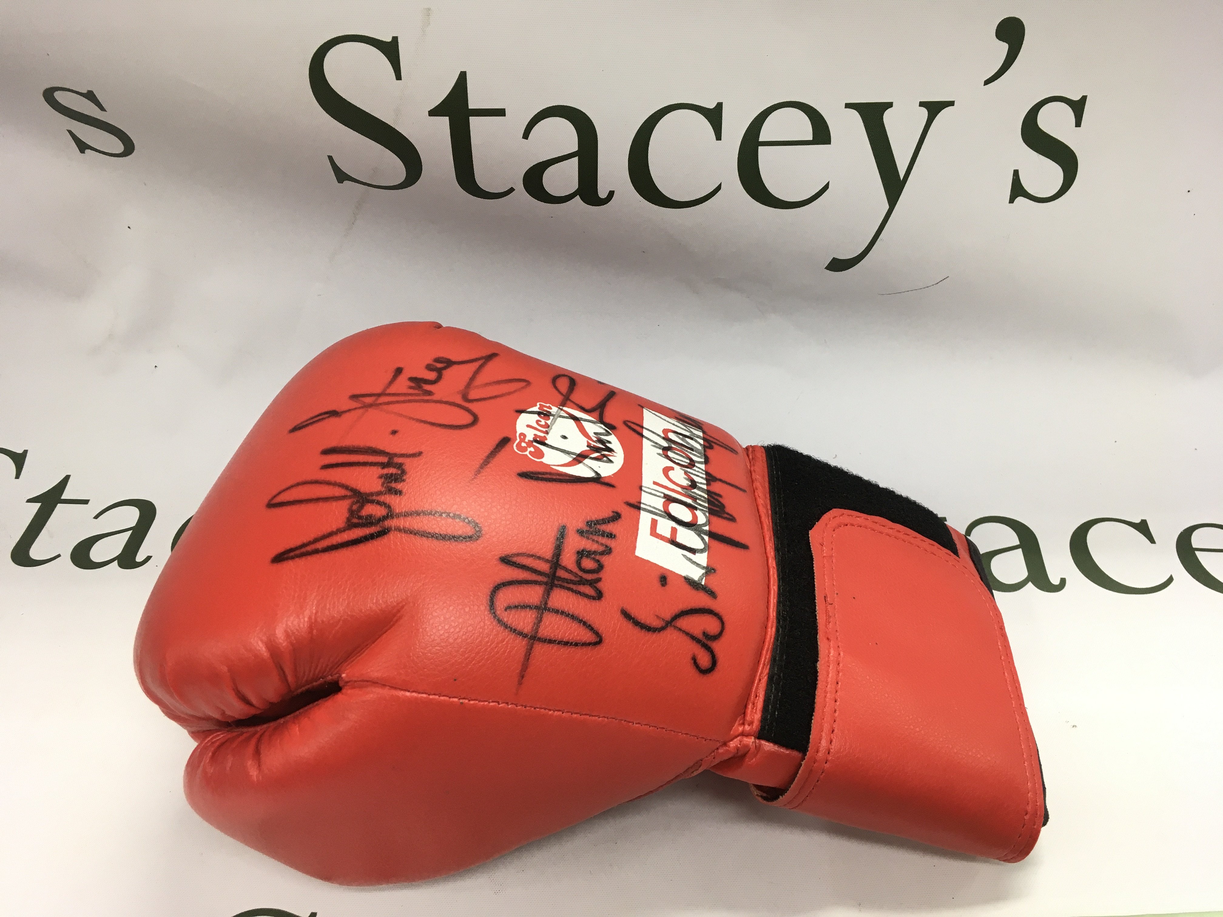 A multi signed boxing glove. Names comprising Sir Henry Cooper, John H Stracey and Alan Minter. Shipping category B.