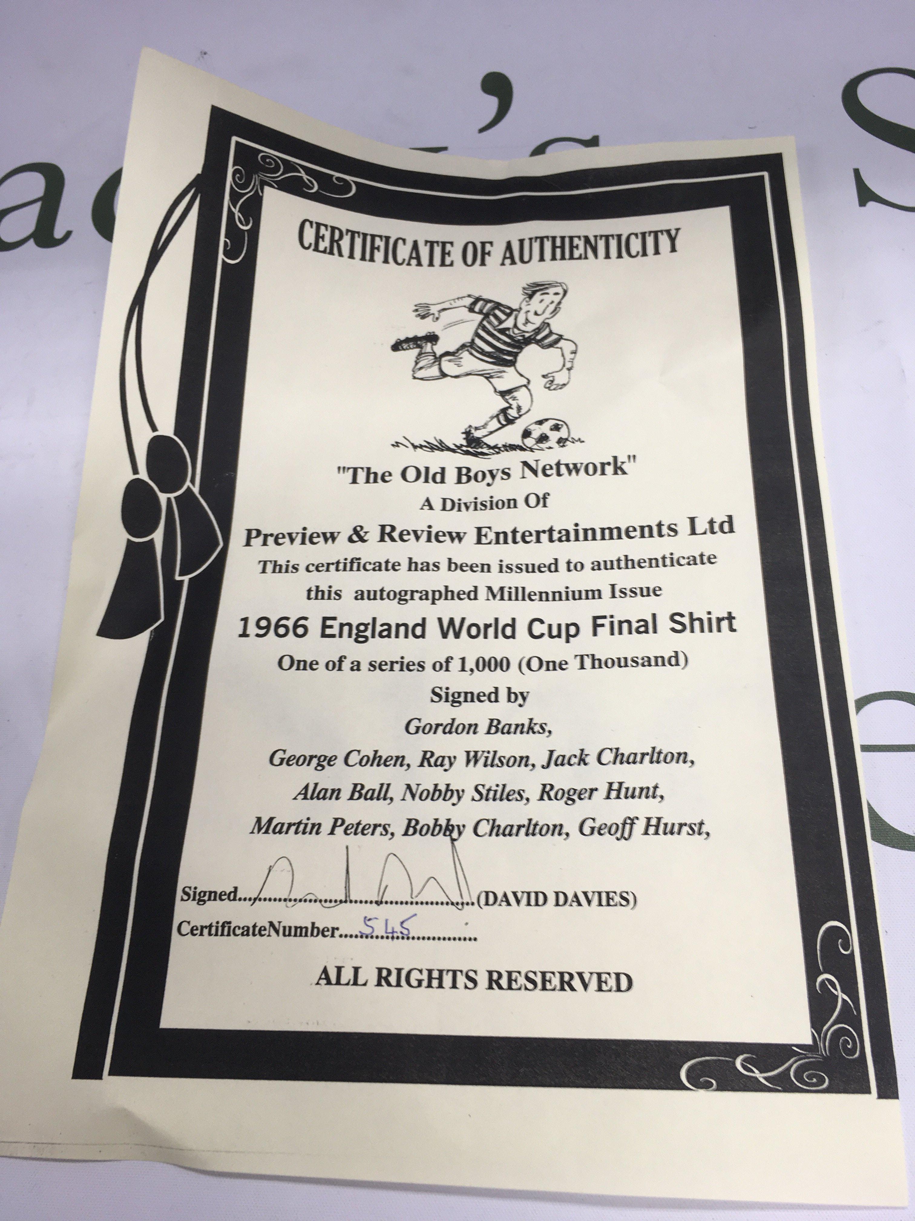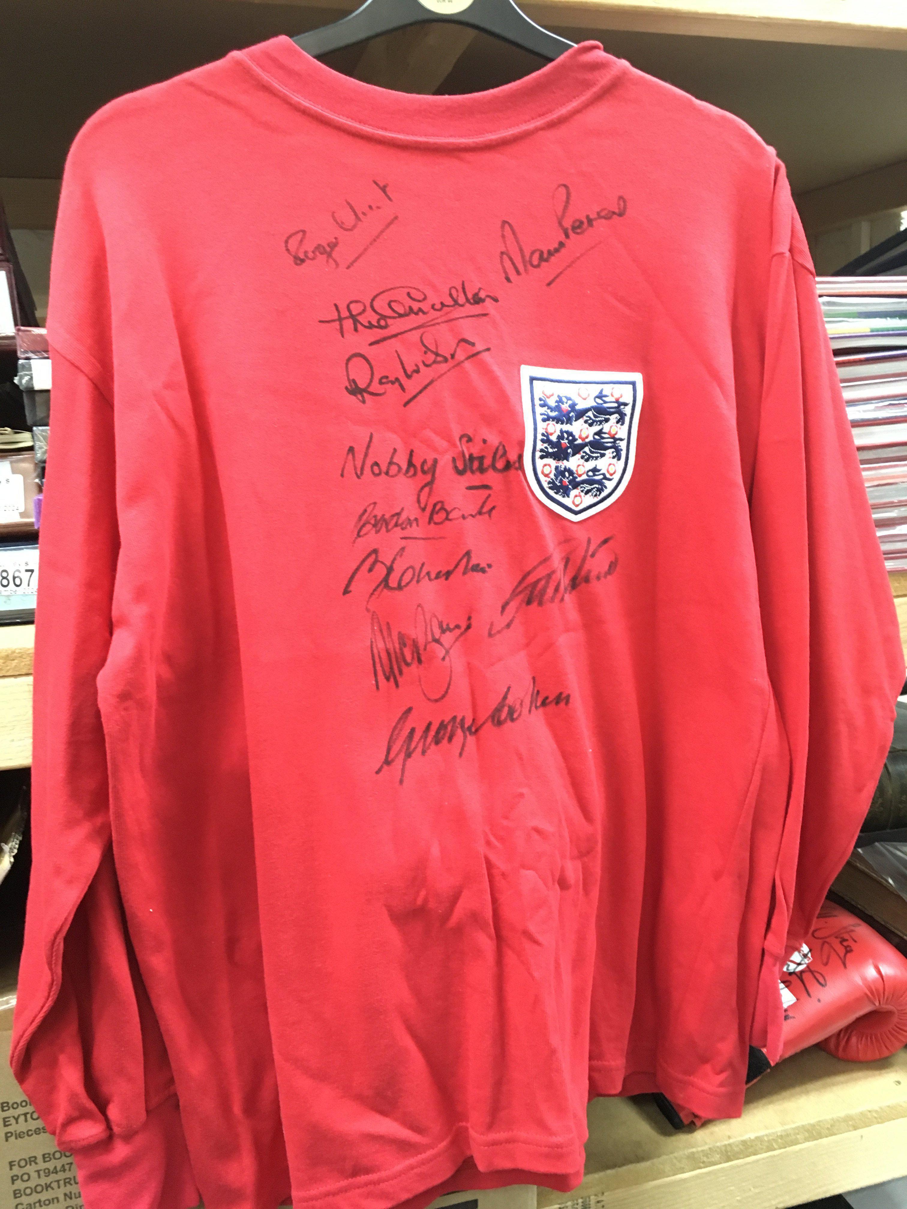 A 1966 England Football World Cup signed shirt, the replica shirt signed by 10 players in black felt (does not include Bobby Moore). Comes with COA. Shipping category B.