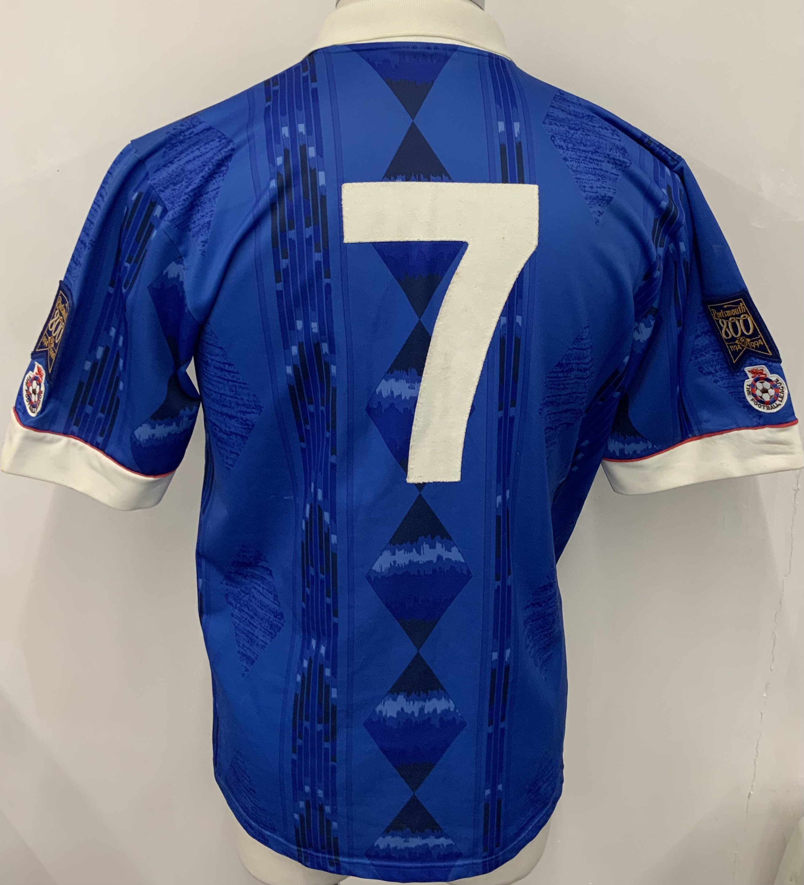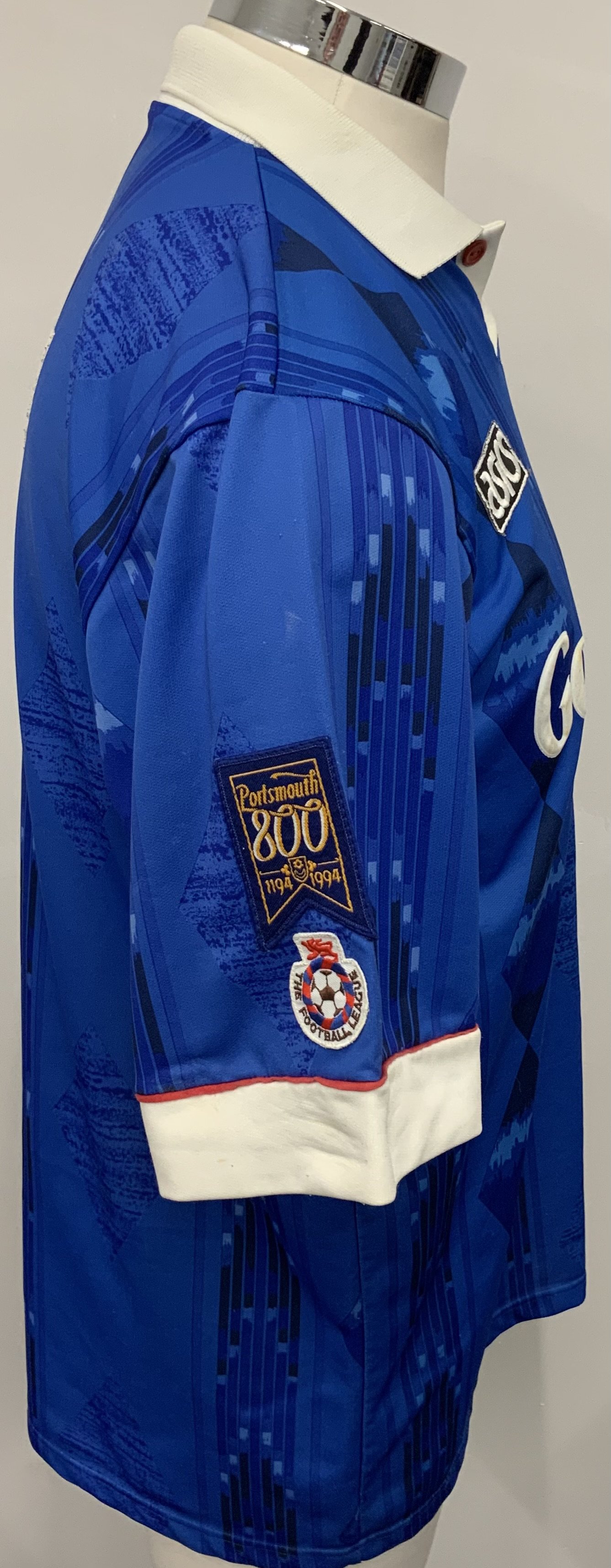 Portsmouth 1994 - 1995 Match Worn Signed Football Shirt: Blue Goodmans Asics short sleeve shirt with Football League badging to arms and 1194-1994 800 years. Number 7 to rear.