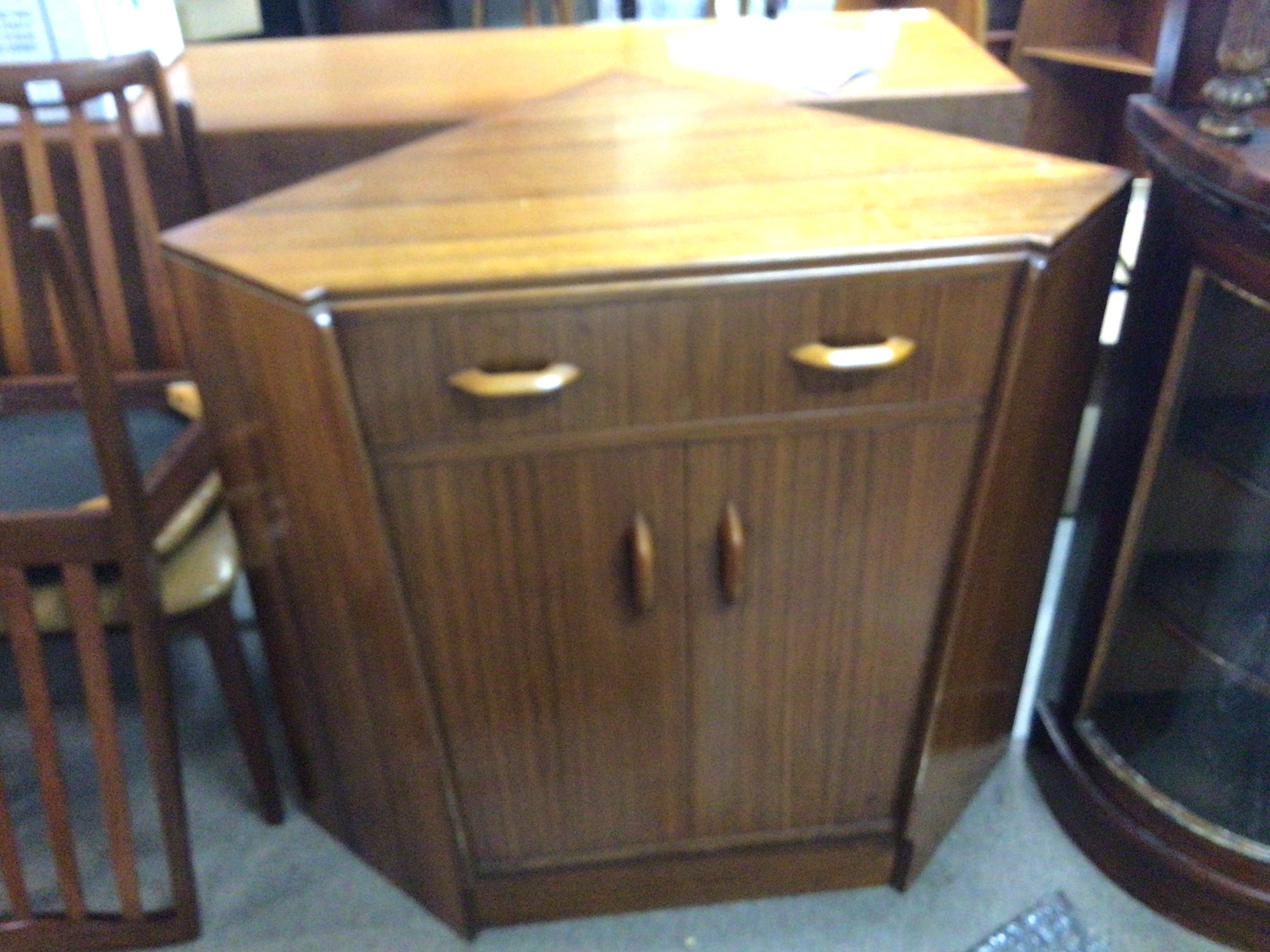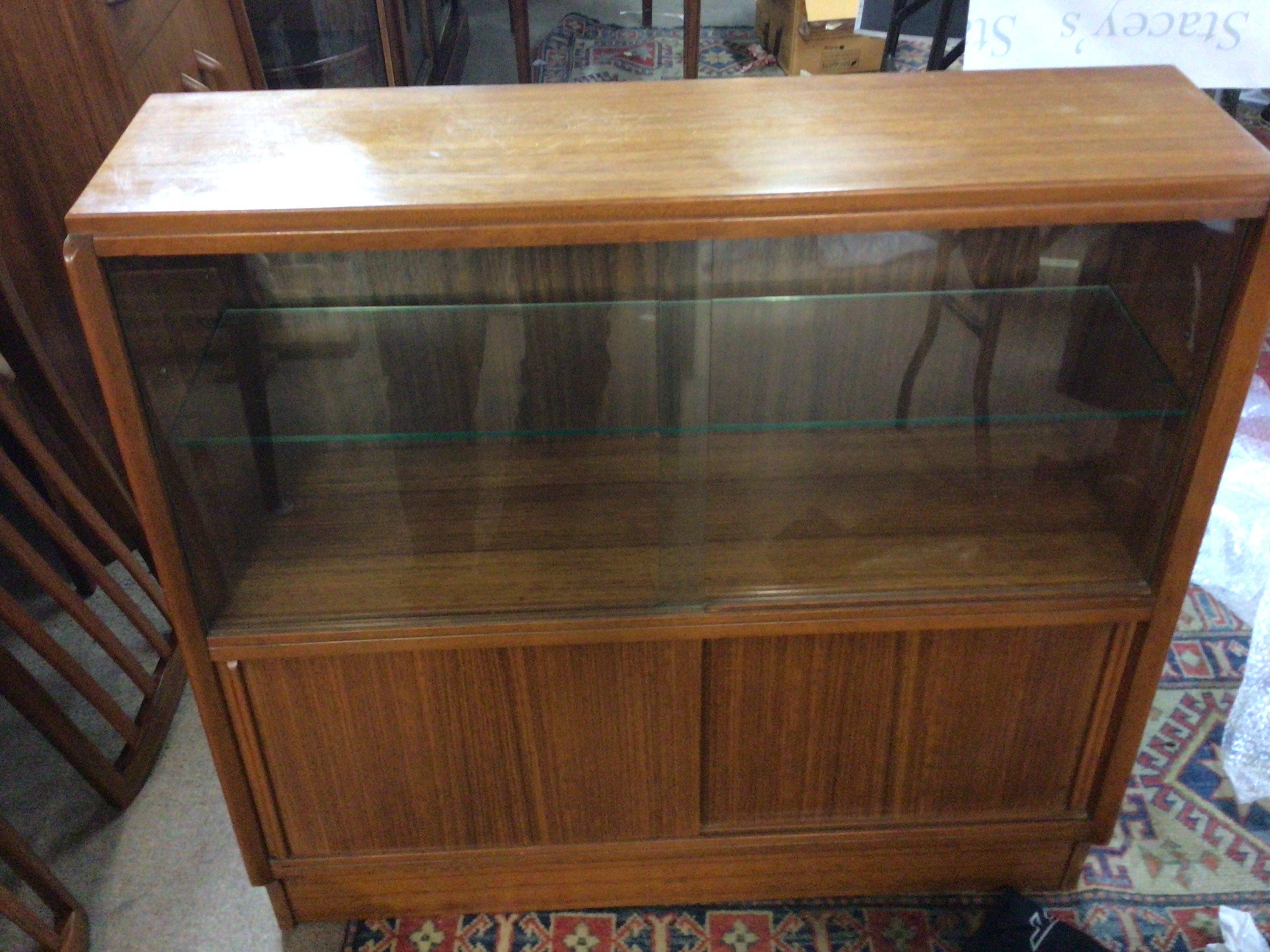 G-Plan Mid century design glass and teak bookcase and a corner desk bureau , dimensions 33x92x85cm