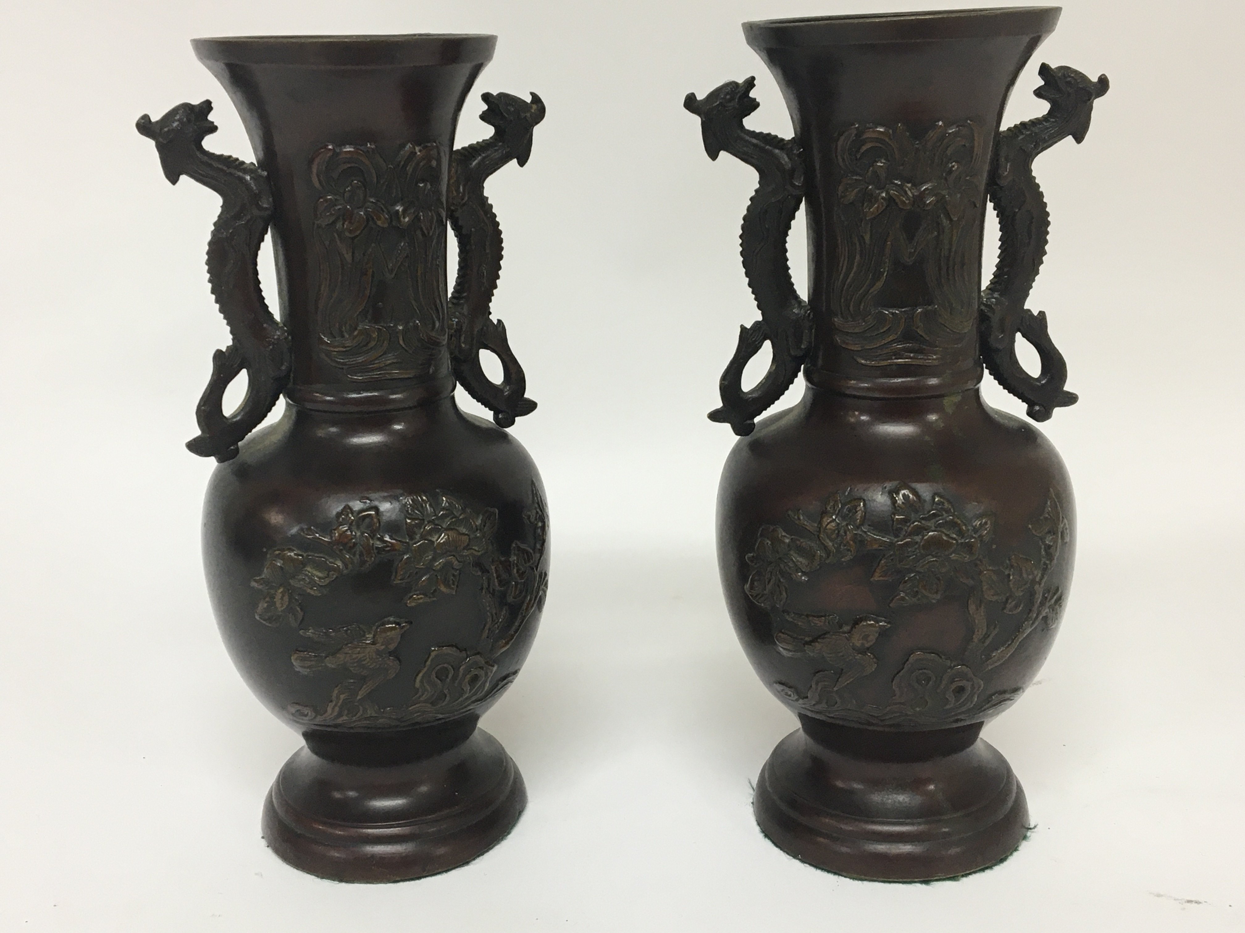 A pair of Japanese late 19th century vases with raised decoration and side handles in the form of dragons. Height 20cm. NO RESERVE