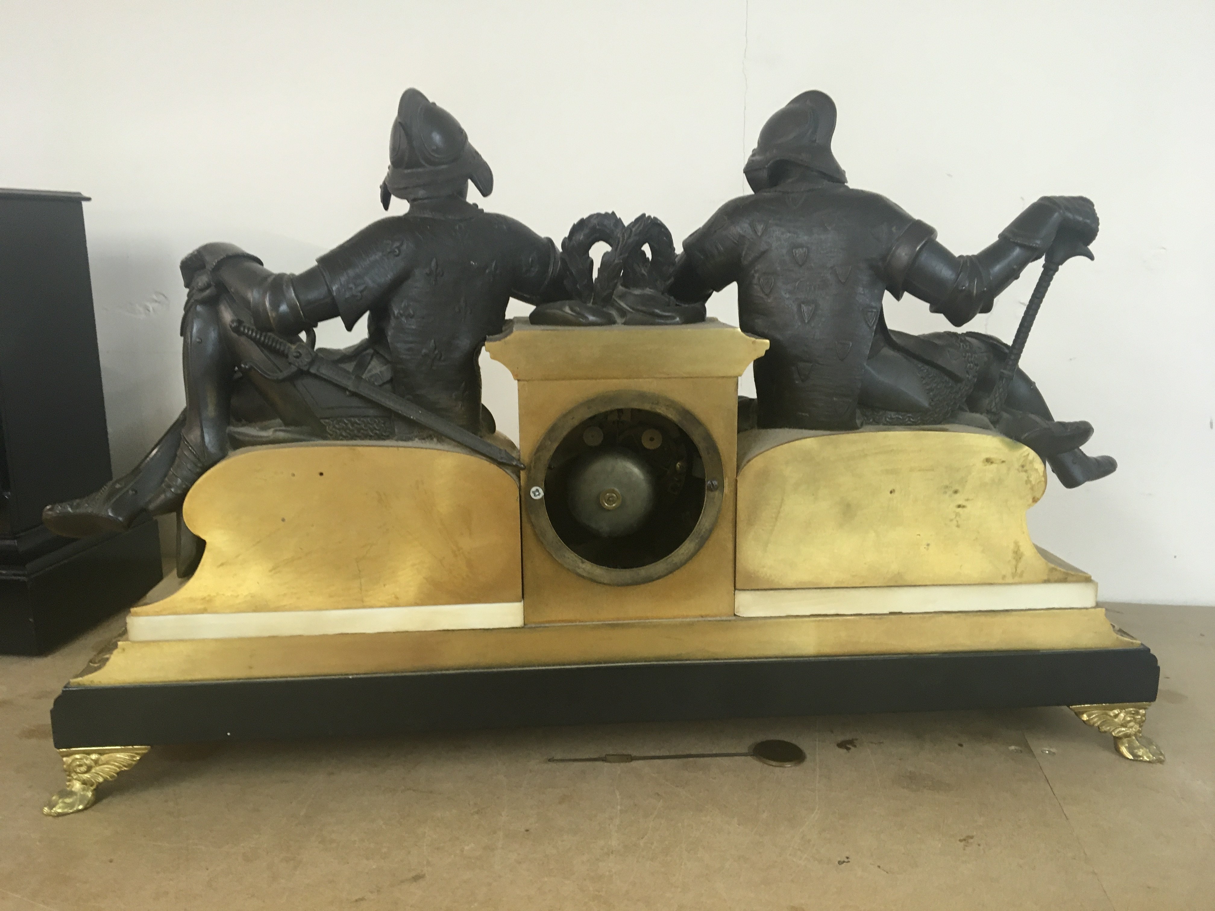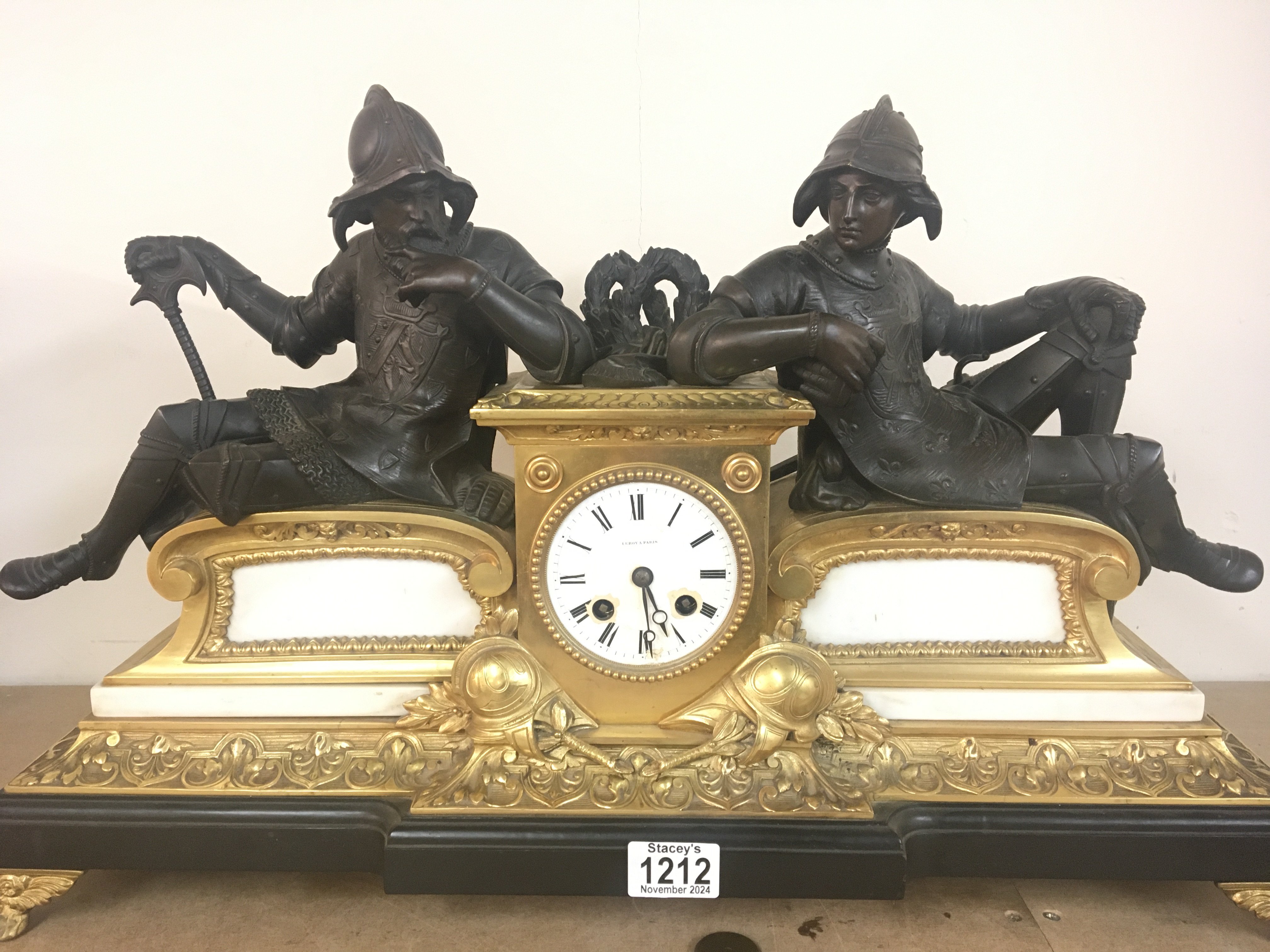 A late 19th century French mantel clock maker LeRoy Paris the gilt metal a d marble vase surmounted with figures of soldiers in armour the movement silk suspension striking on a bell and with makers stamp and numbered 471. With pendulum not seen working. 60cm wide 40cm high