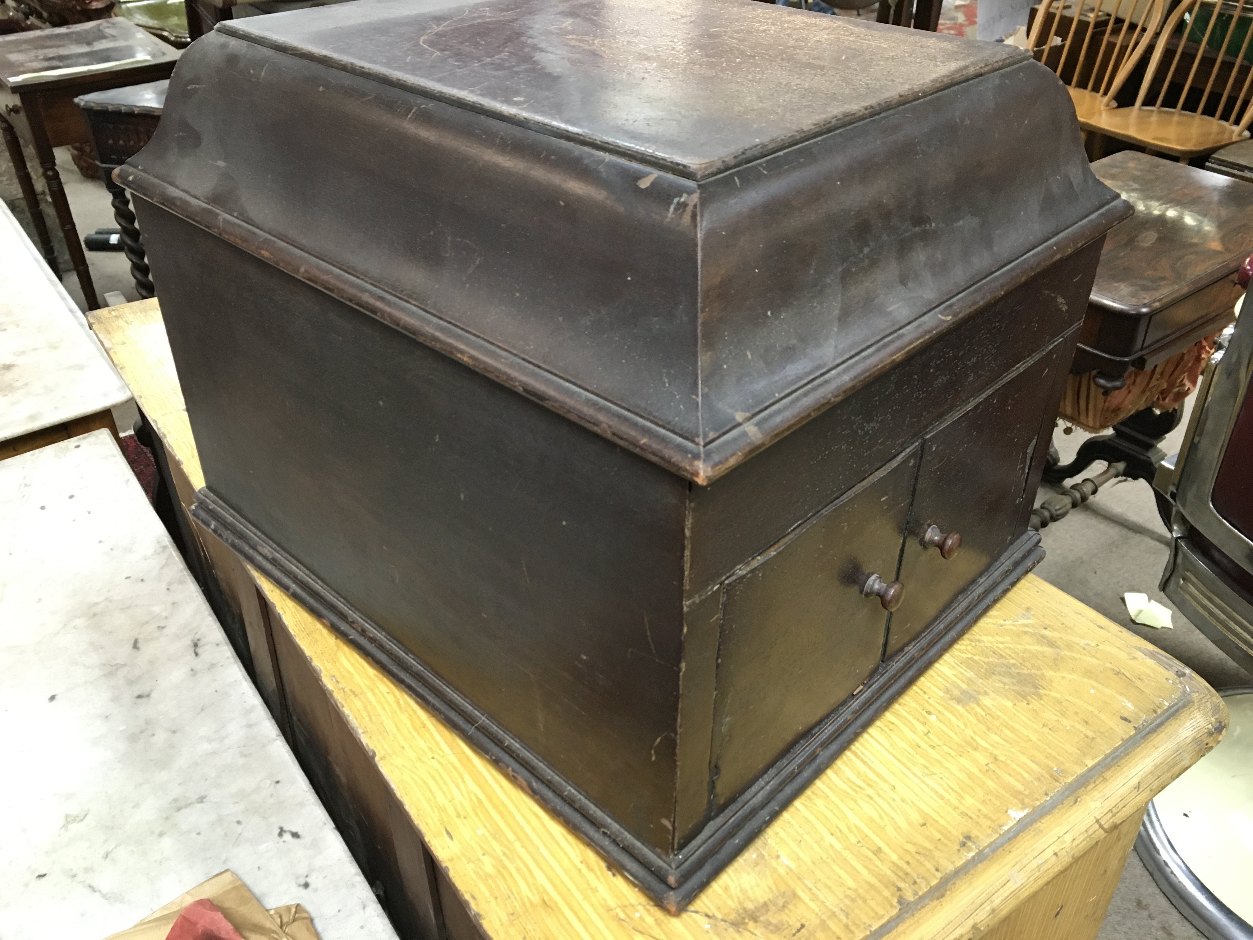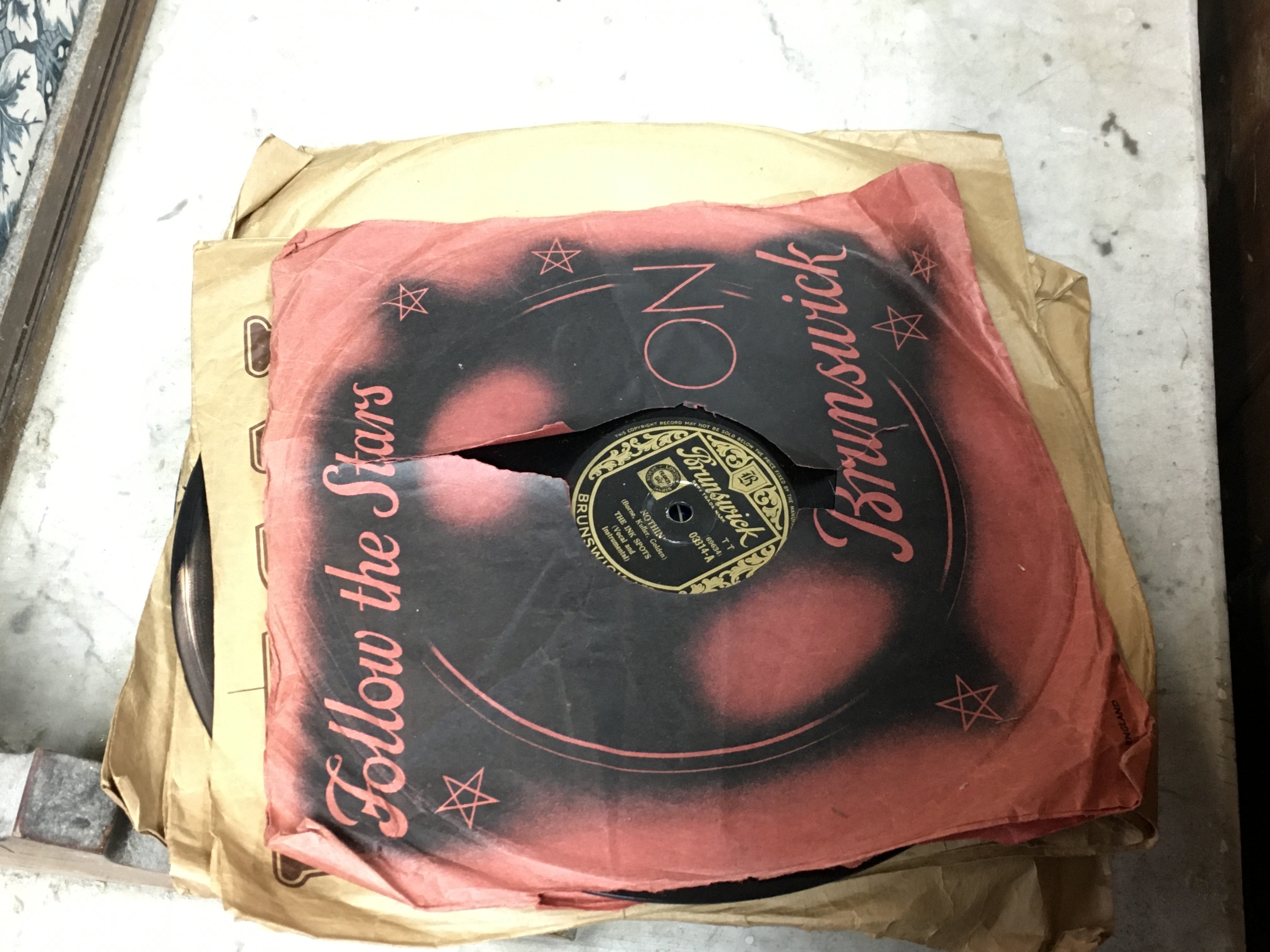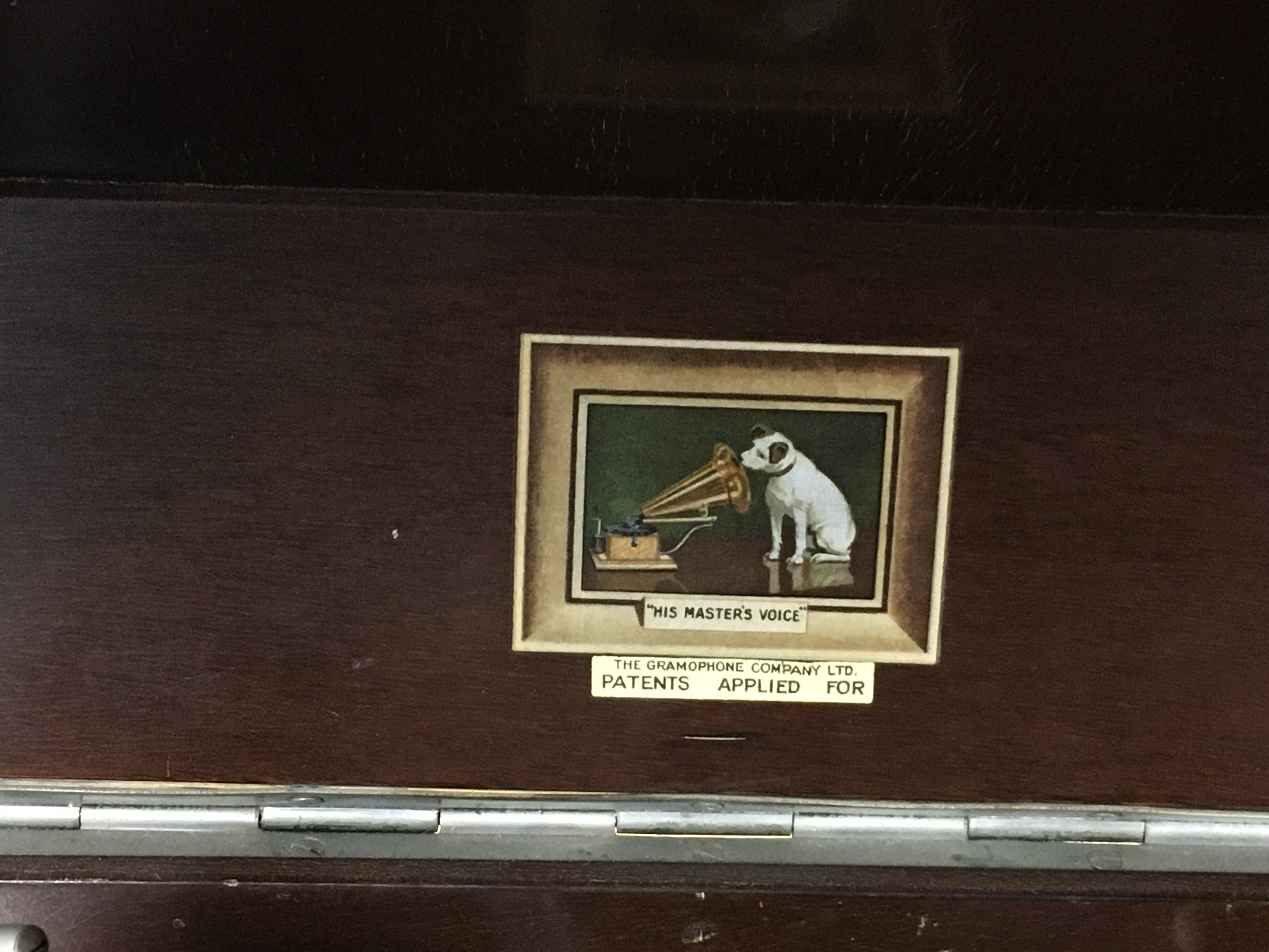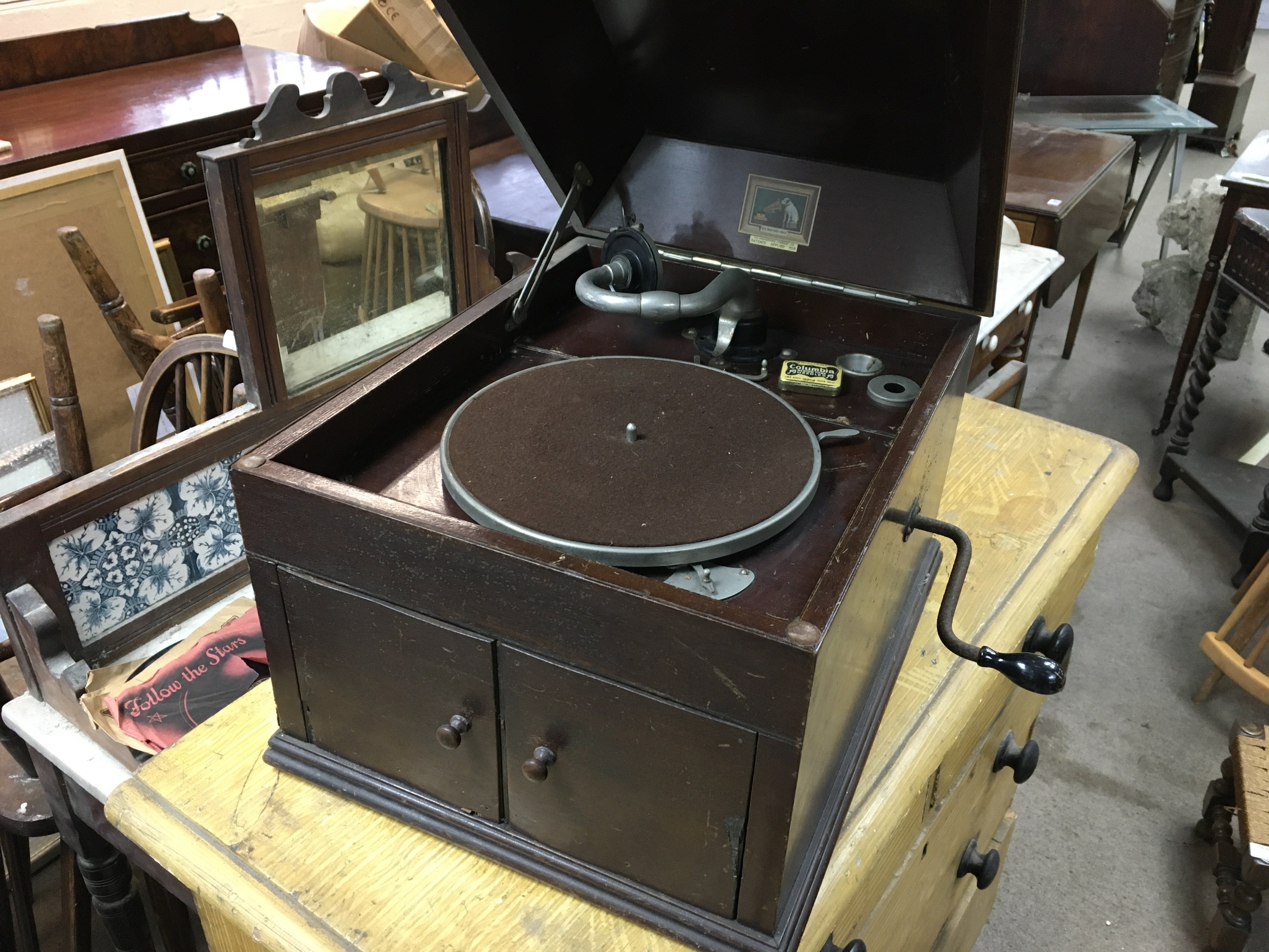 HMV gramophone with needles and a few vinyls. 38cm wide 46 deep and 35 high. Postage D