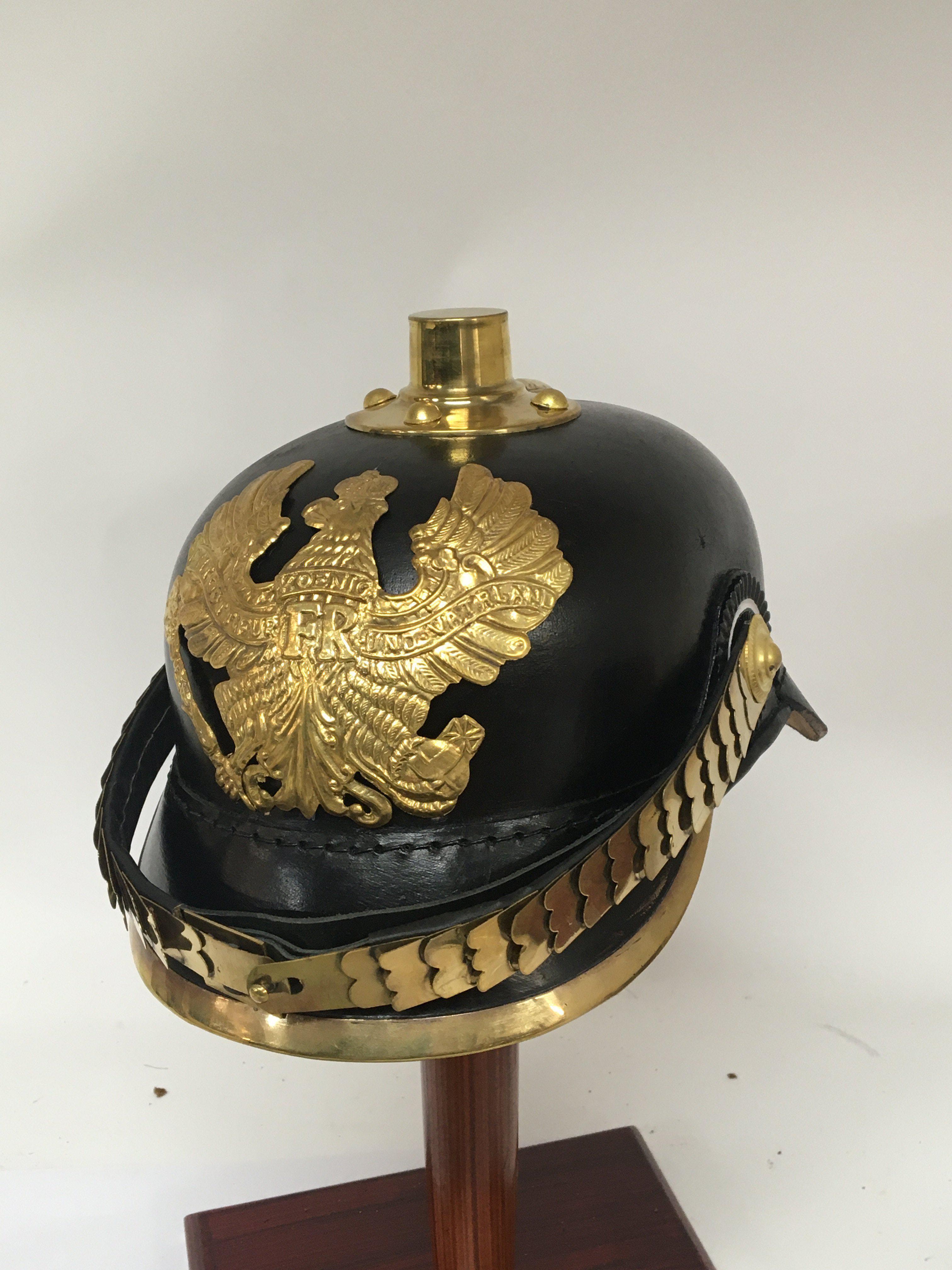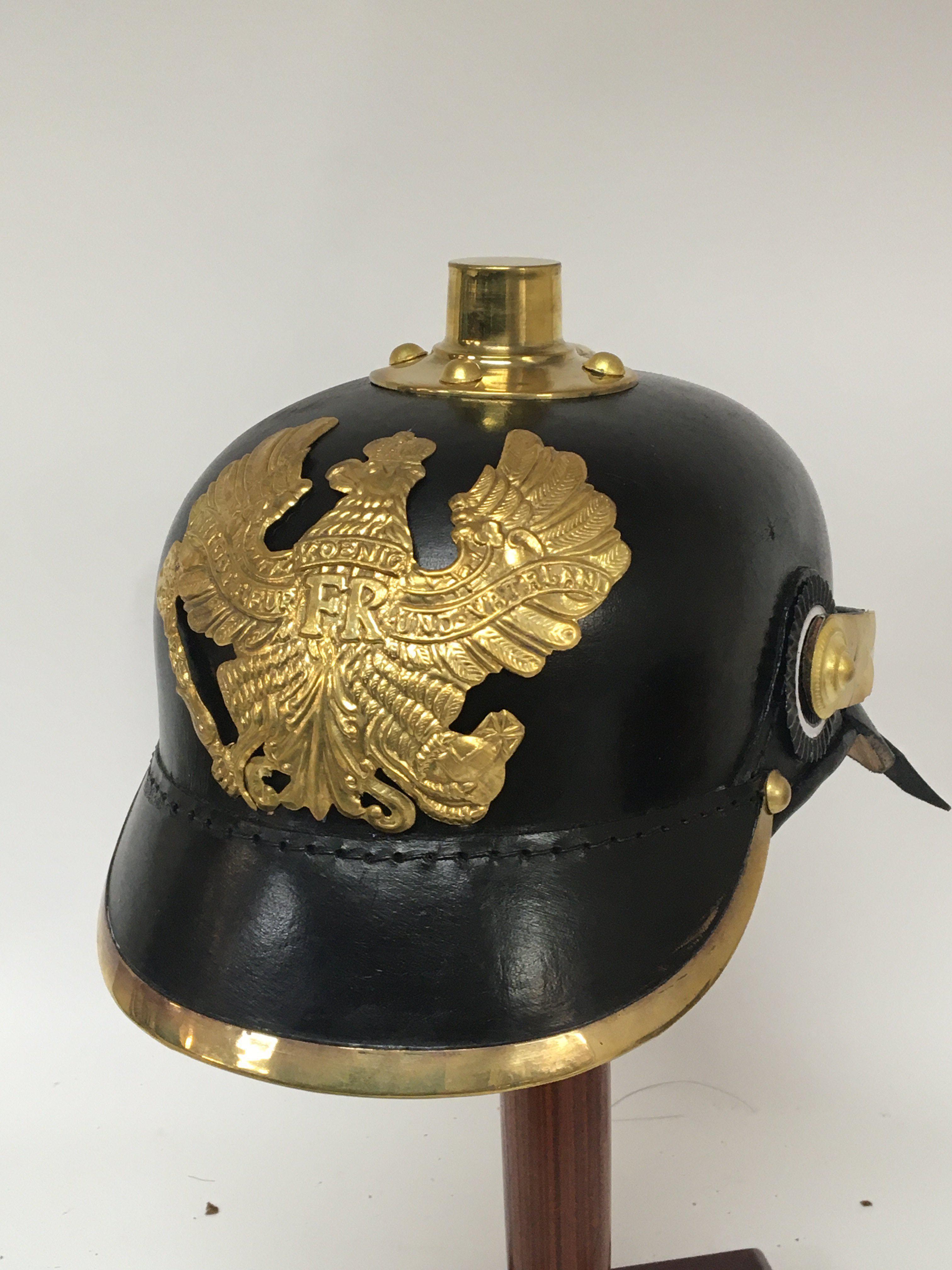 A reproduction German I world war Pickelhaube helmet.with brass fittings on leather. NO RESERVE