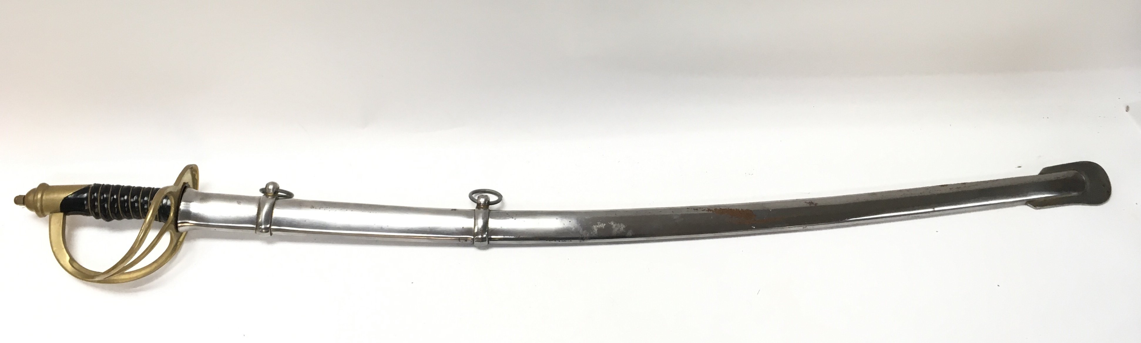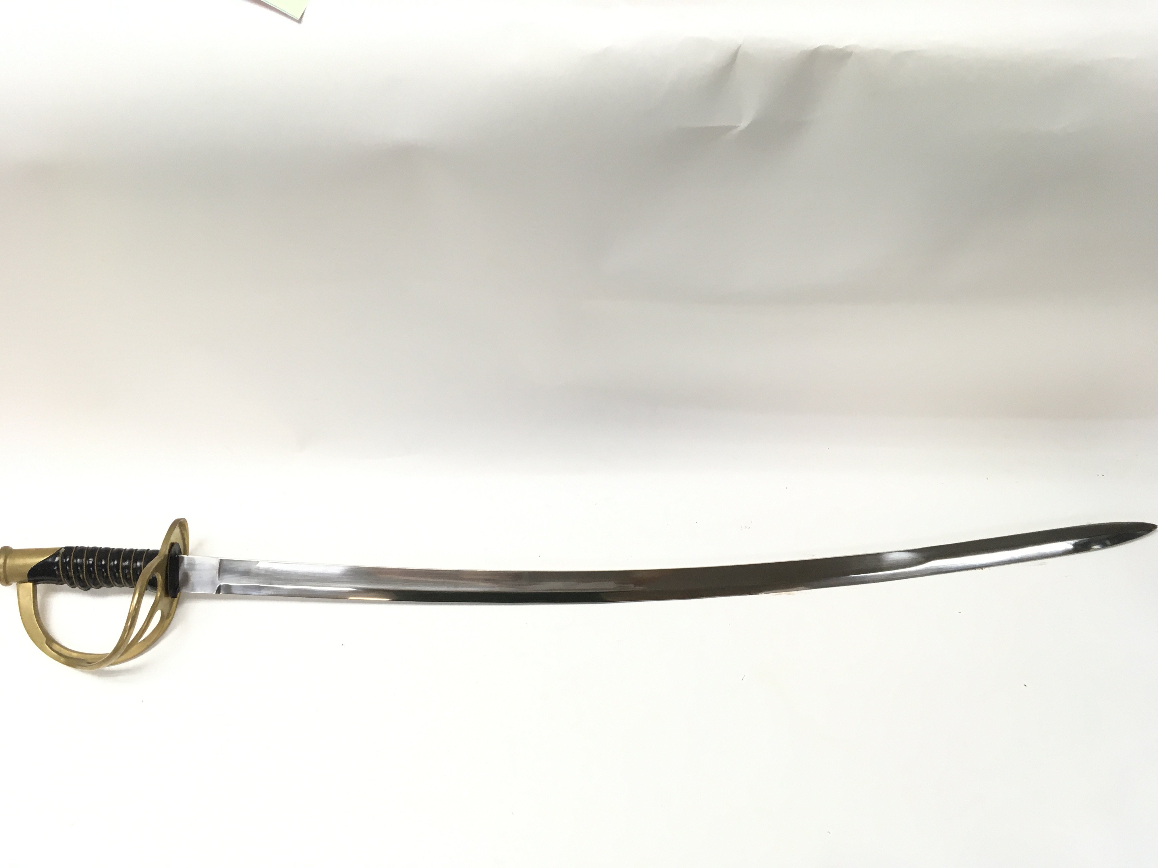 A reproduction 19th century cavalry sword with a chrome scabbard, brass hilt and a black leather grip. Blade 86cm. Total length 110cm. This lot cannot be posted