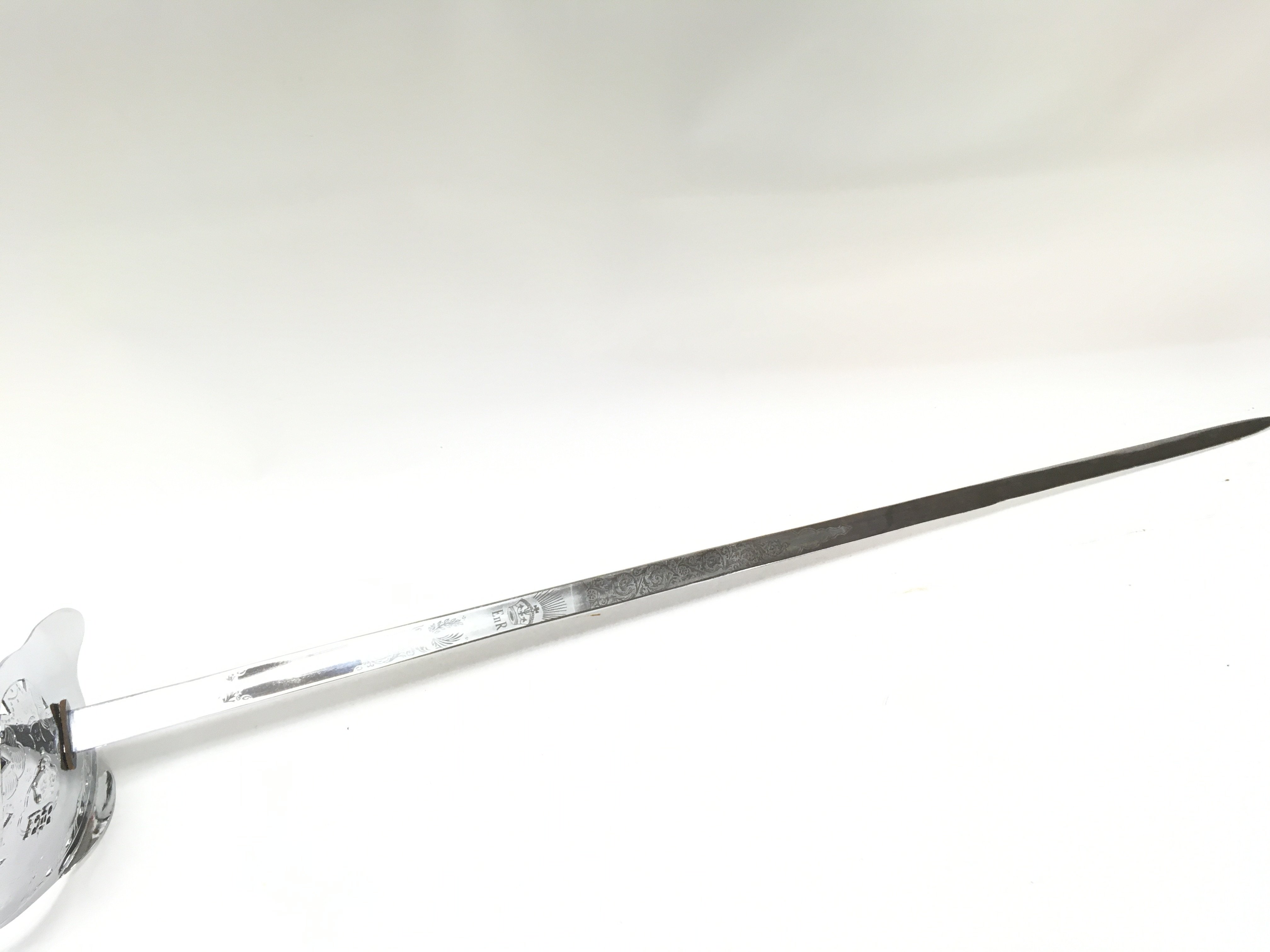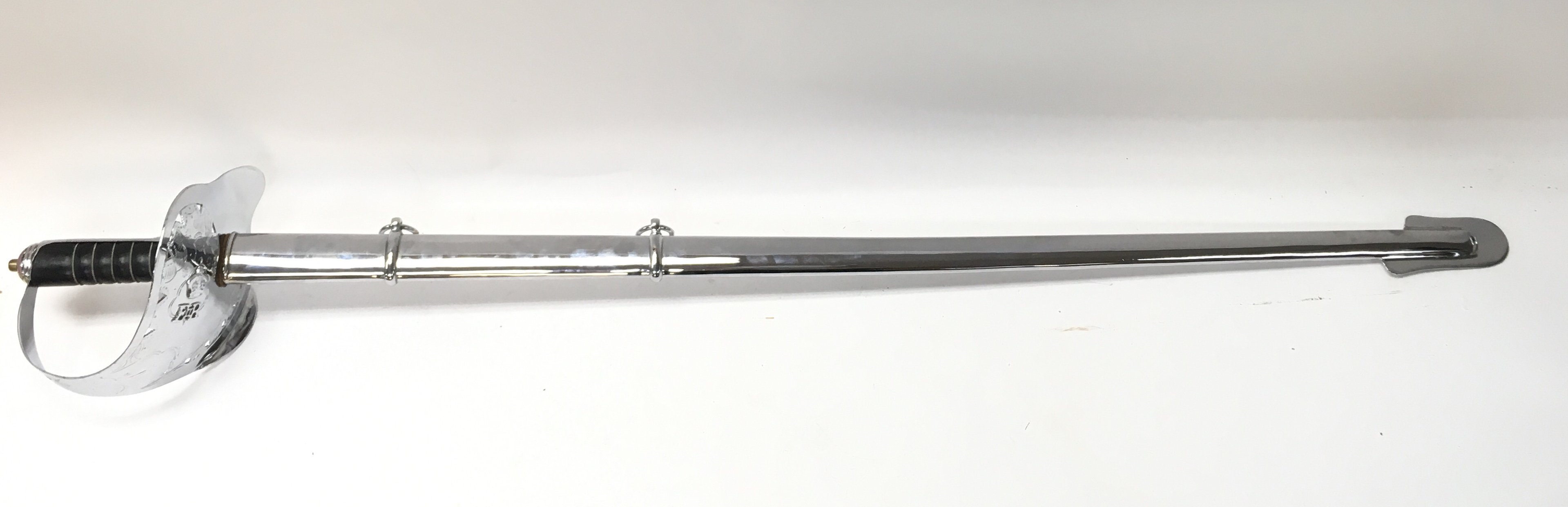 A 19th century sword with a large chrome hand guard and scabbard, black leather grip. Blade 87cm long
