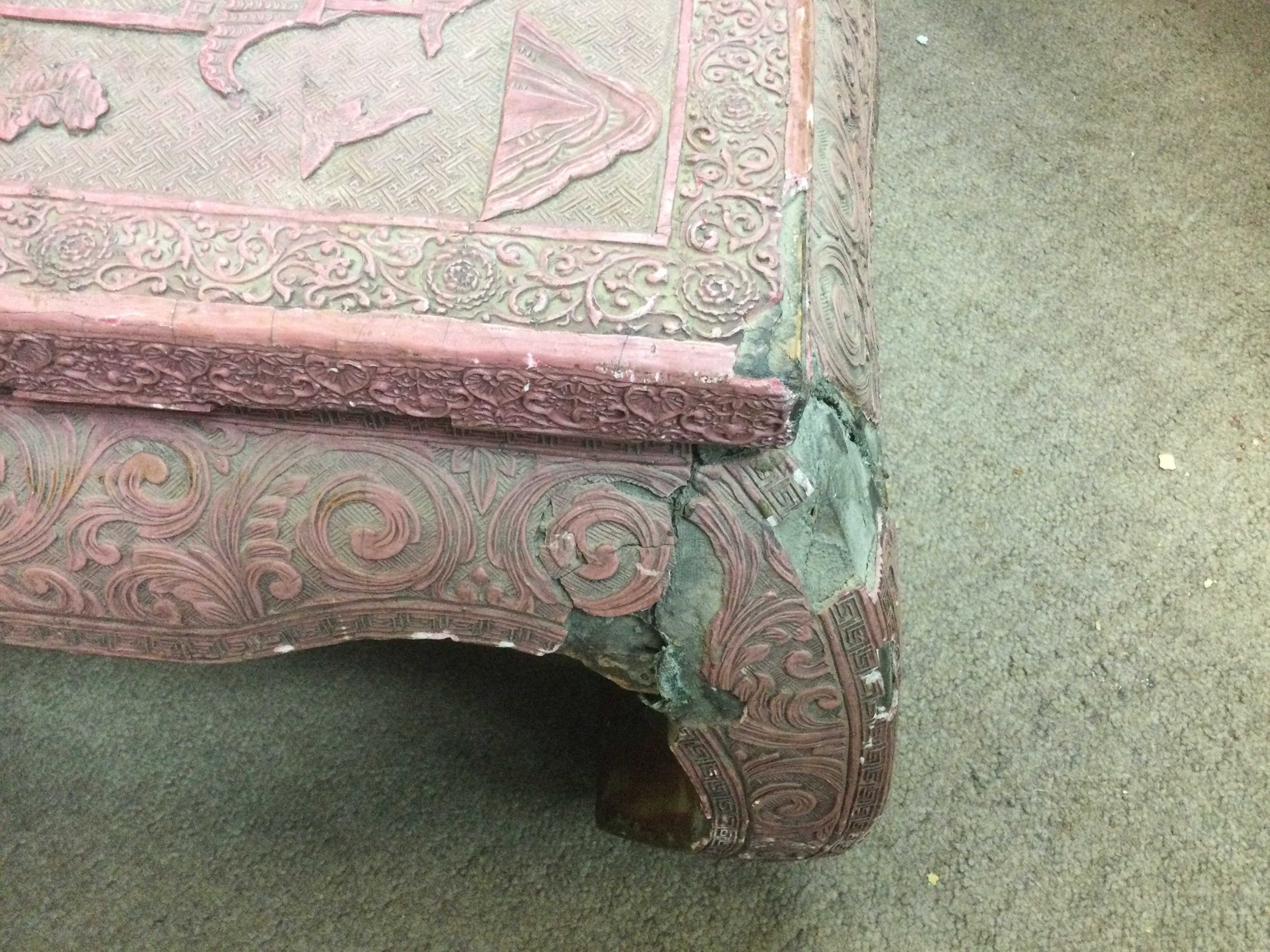 A highly decorative cinnabar low table, top diameter approx 90cm. Some damage. Shipping category D. NO RESERVE
