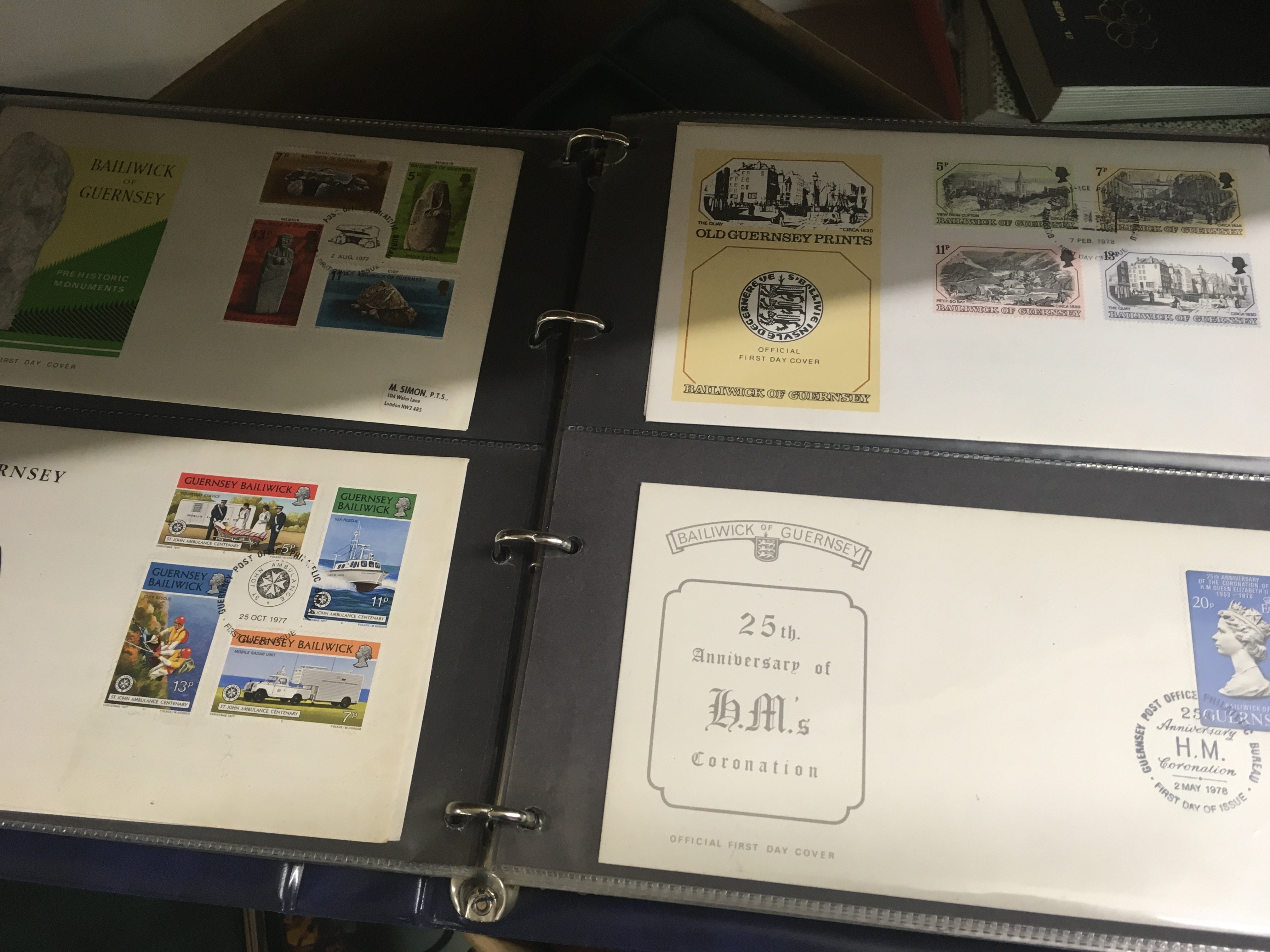 A Collection of seven Albums of stamps including Isle of Man , Guernsey and jersey. I with first day covers