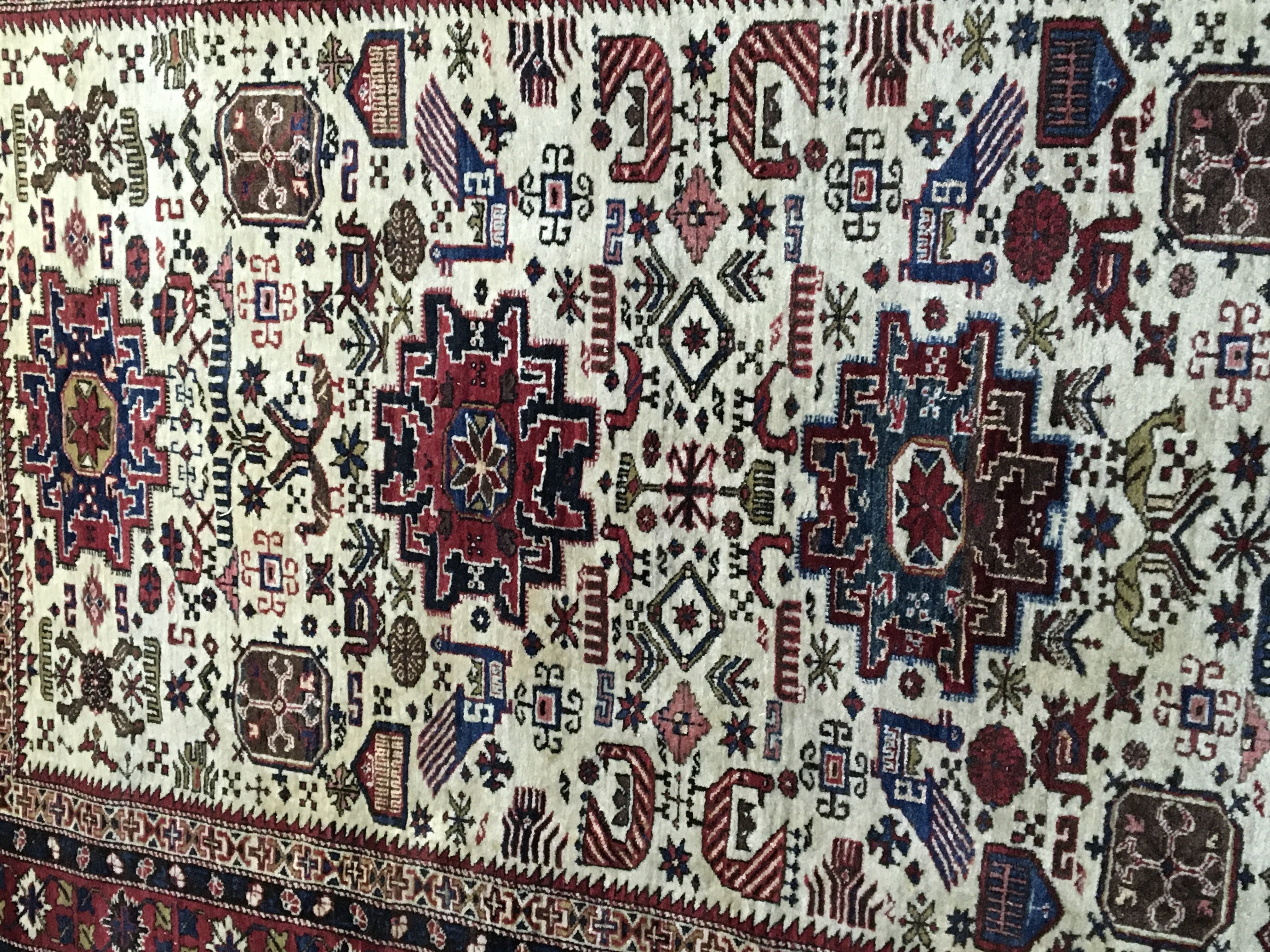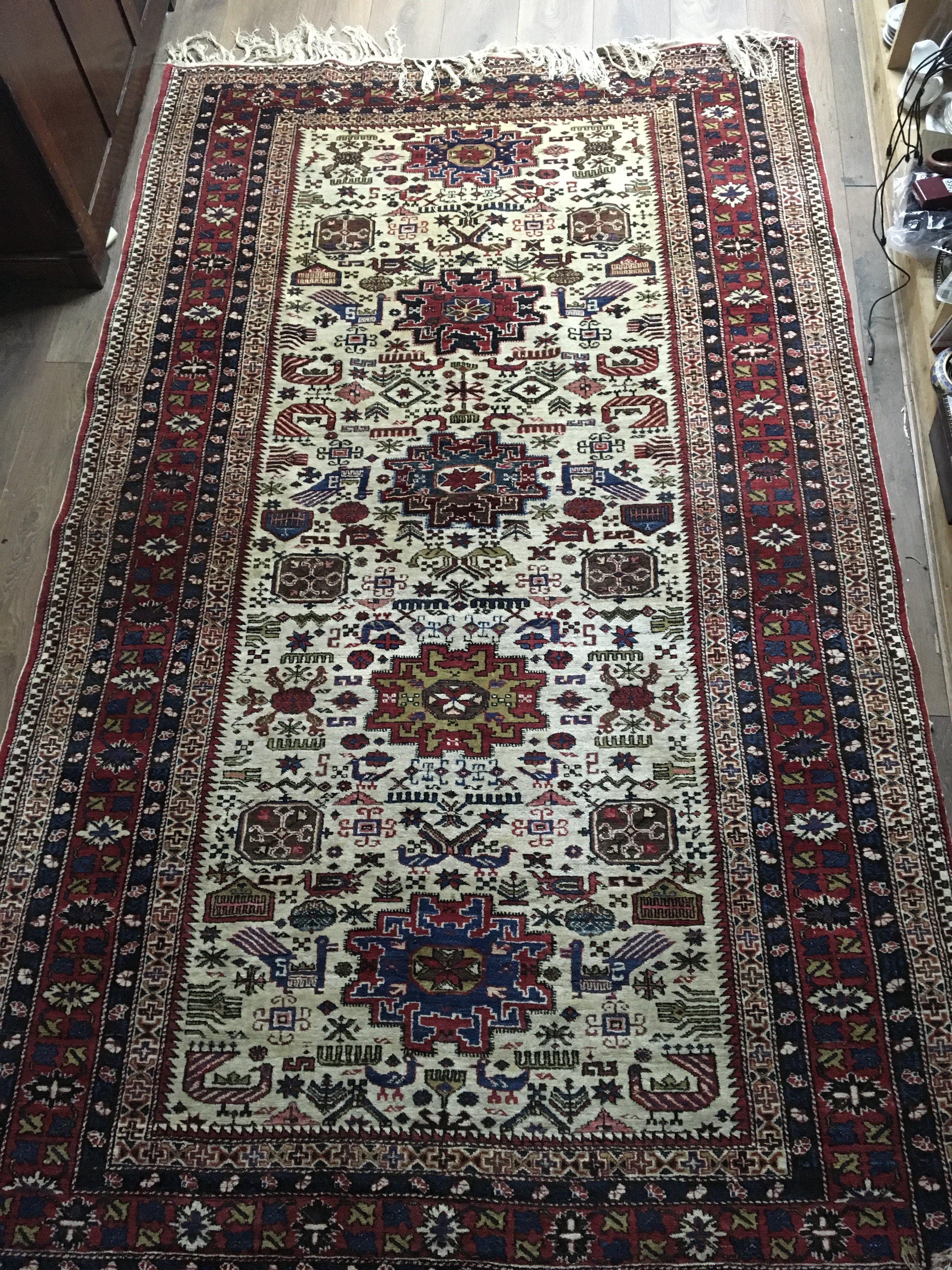 A Pair of Persian hand knotted rugs with a pattern including exotic birds and symbols on an ivory ground with a repeat pattern boarder. 162x270cm approximately. (2)