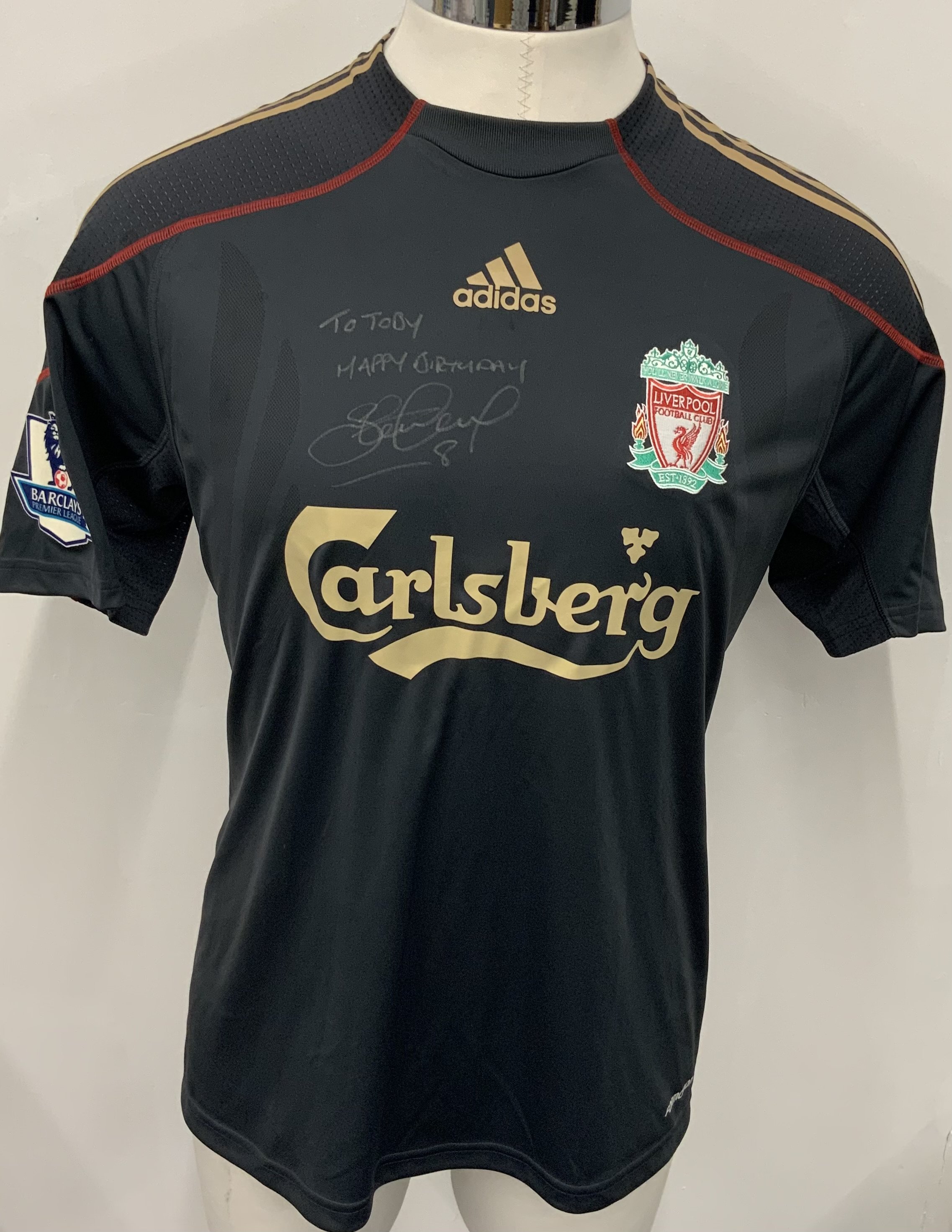 Liverpool 2009 - 2010 Match Worn Signed Football Shirt: Black Carlsberg Adidas short sleeve shirt with gold and red trim. Number 8 Gerrard to rear. Signed and dedicated to front by Gerrard.
