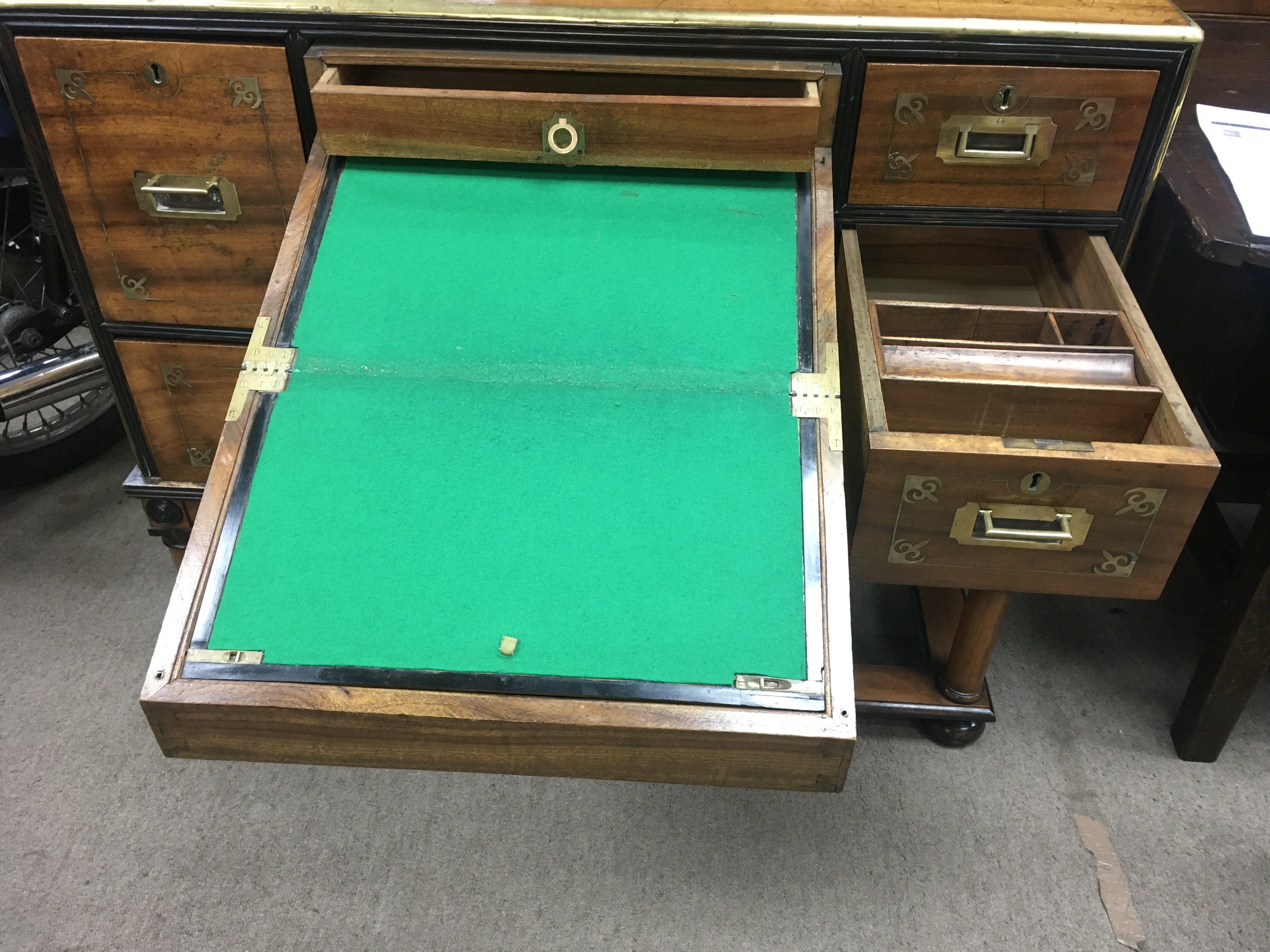 A mahogany brass bound campaign secretaire with five drawers and desk compartment on Stand . 100 cm x 50 cm Height 92 cm .