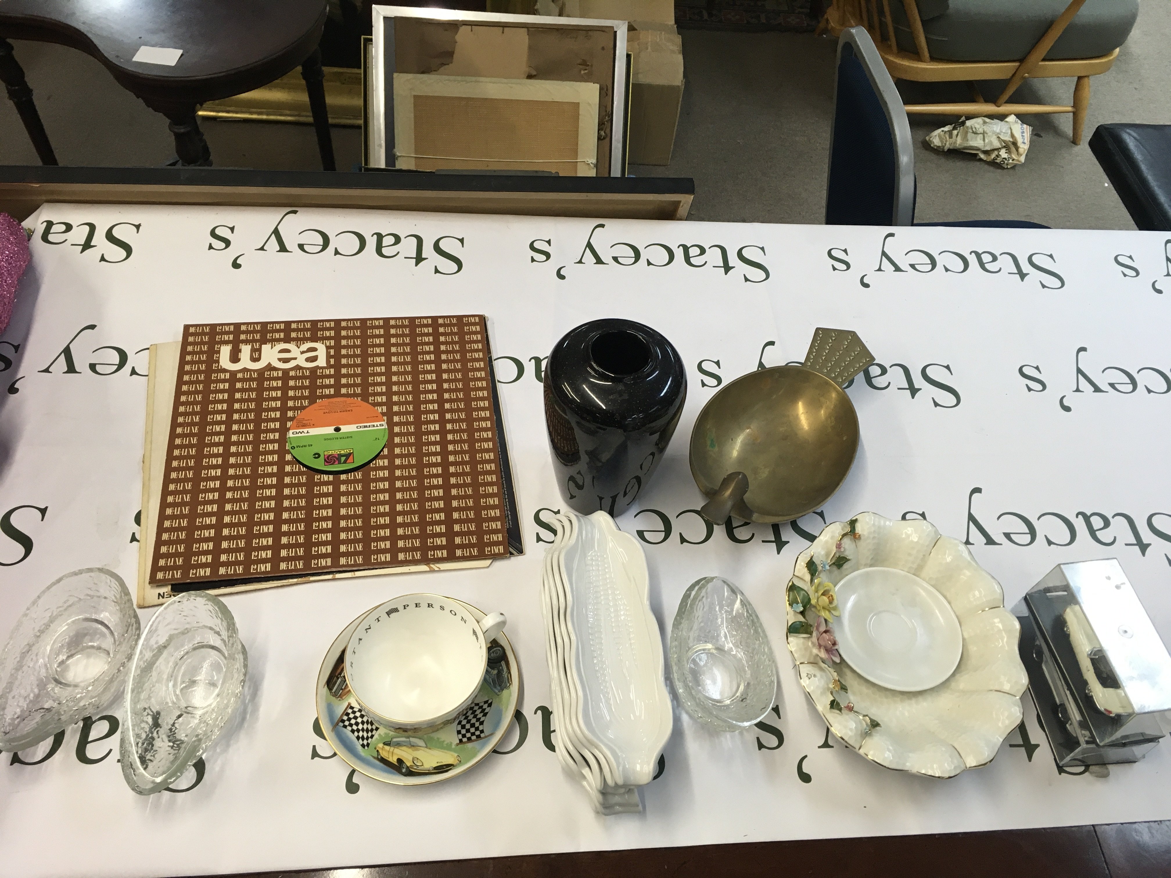 A Collection of assorted items including a Royal Worcester vintage car plate and cup, brass duck bowl, West German vase, collector of Vinyl records including Sister sledge, Tom Scott, Ray Martin, large silver plate tray. NO RESERVE