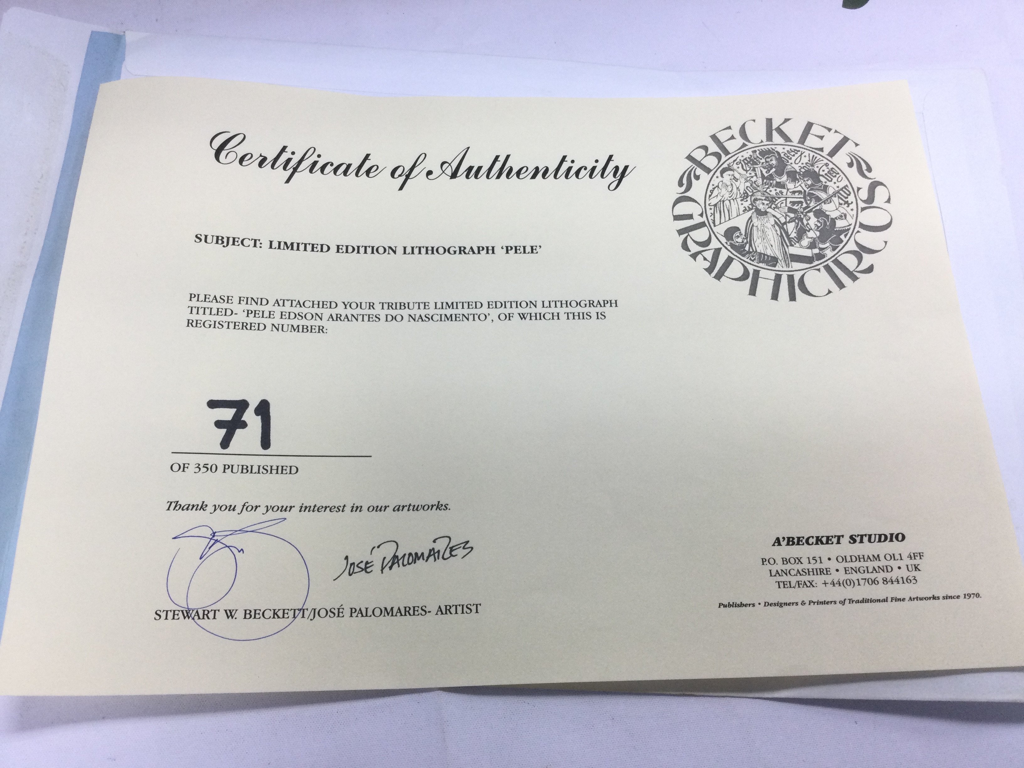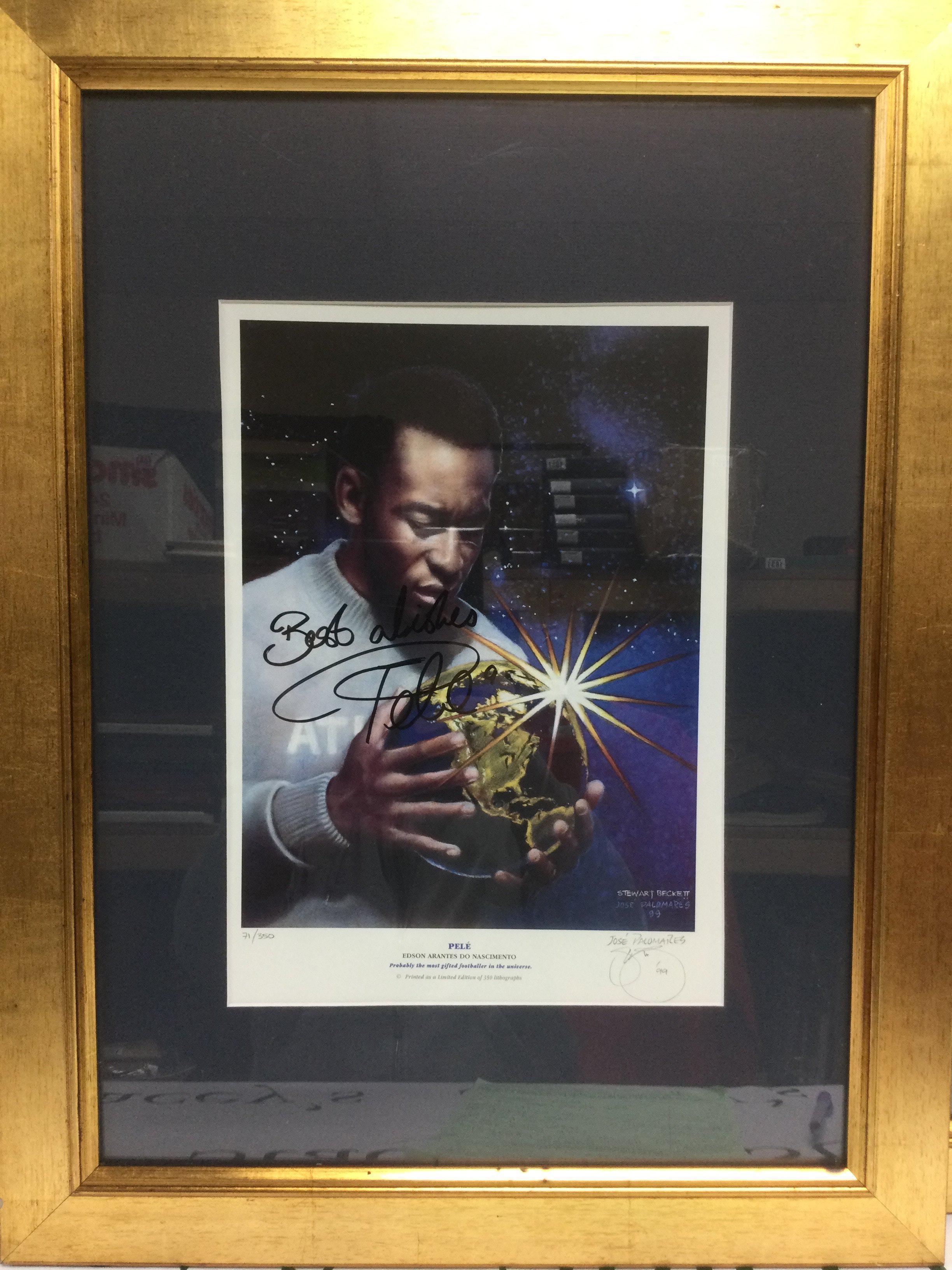 A framed and glazed limited edition signed print of Pele, numbered 71/350, approx 45cm x 59cm. Comes with COA. Shipping category D.