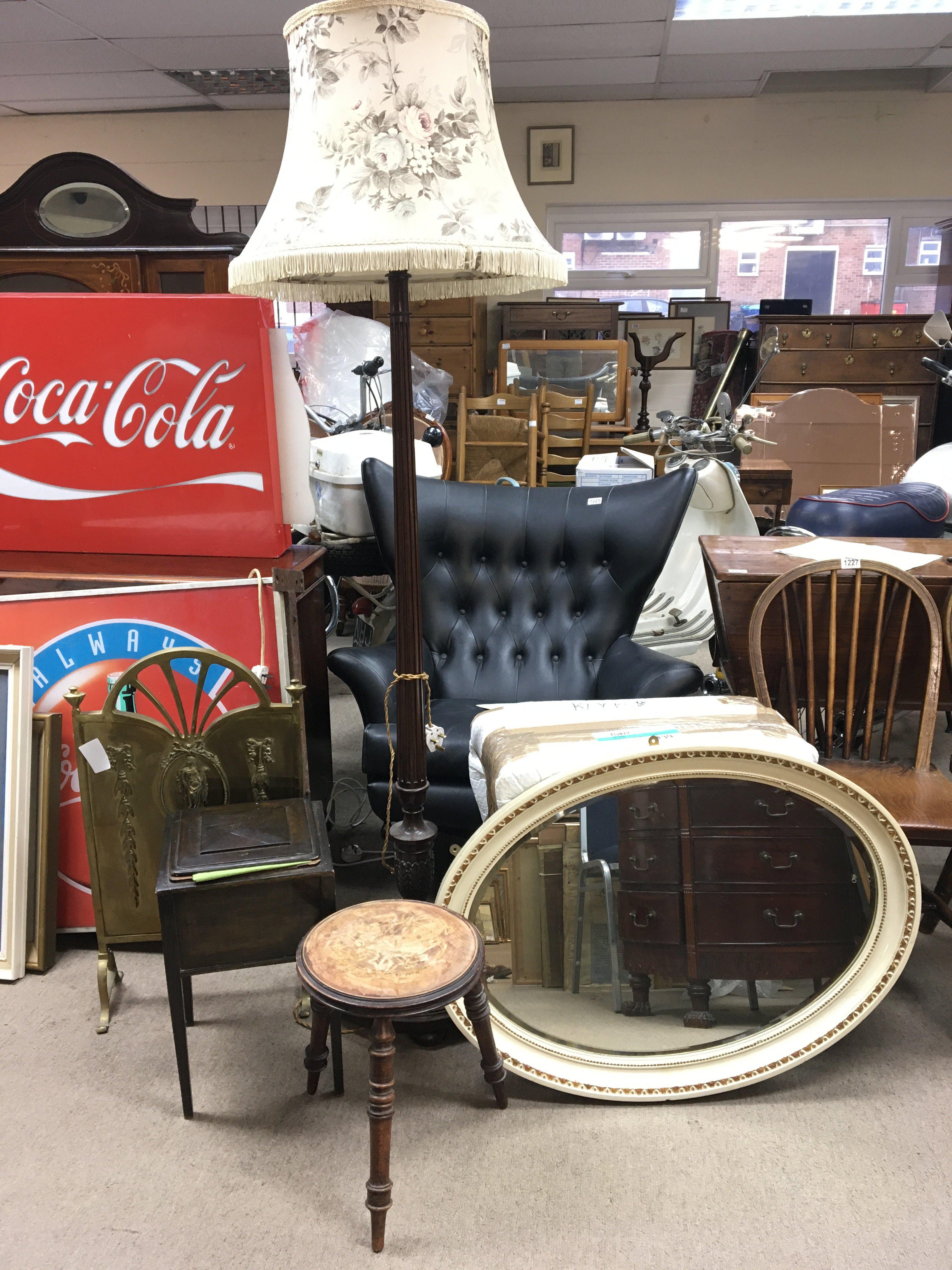 A Mahogany standard lamp with fluted Column a brass fire screen a white painted oval mirror mahogany work box and a small stool (5) NO RESERVE