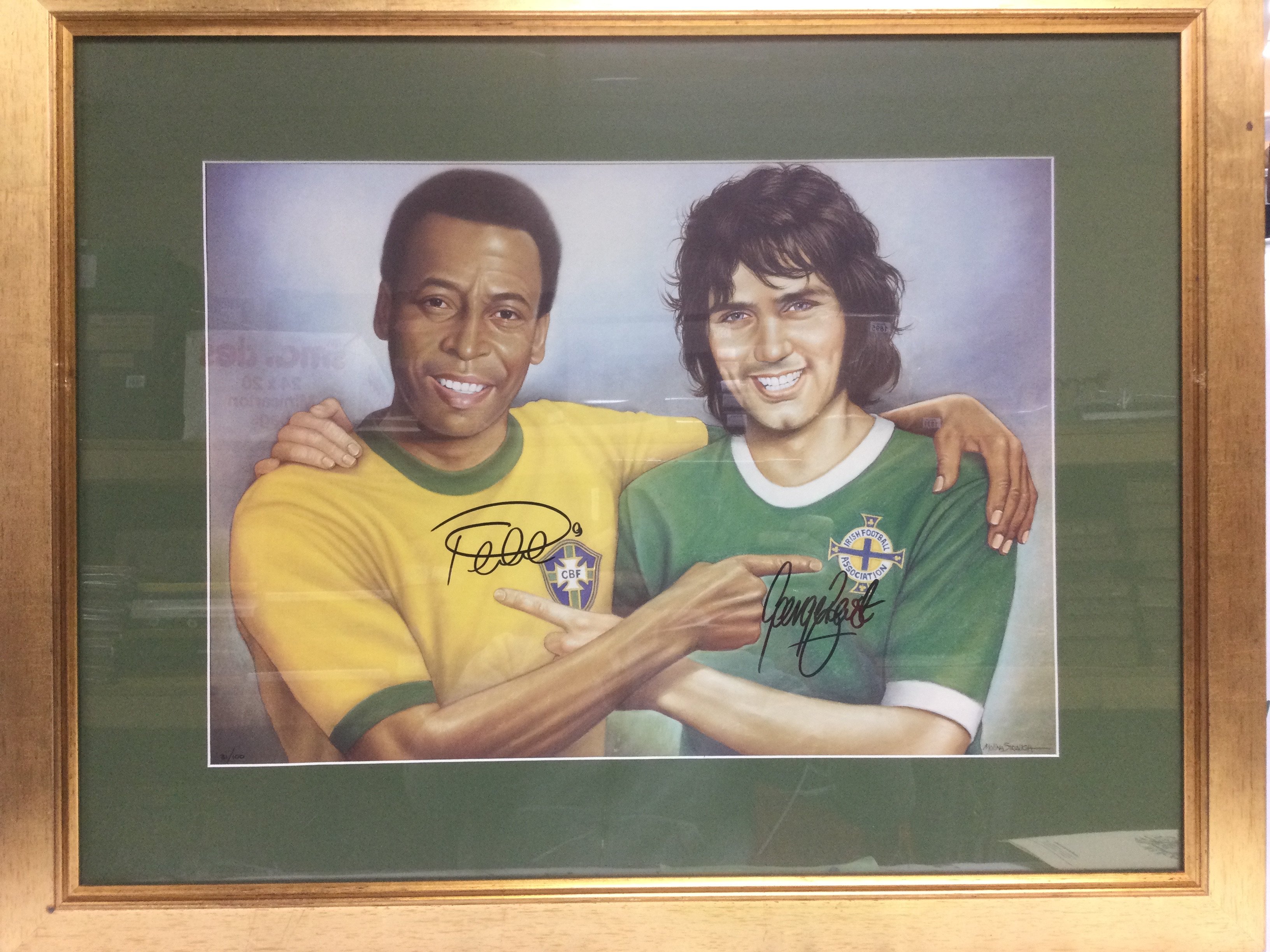 A framed and glazed sigmed print of both Pele and George Best, no COA, approx 74cm x 59cm. Shipping category D.