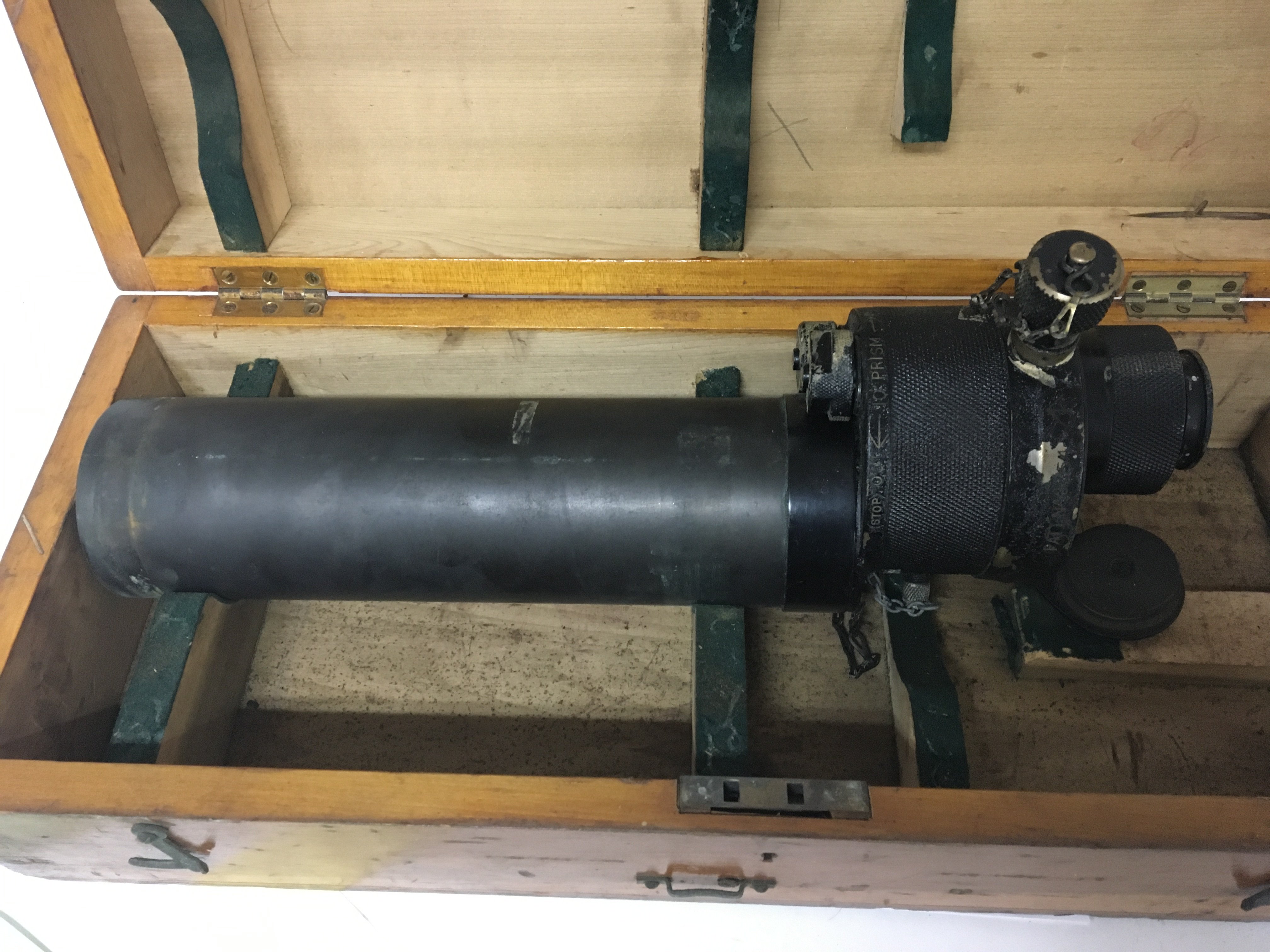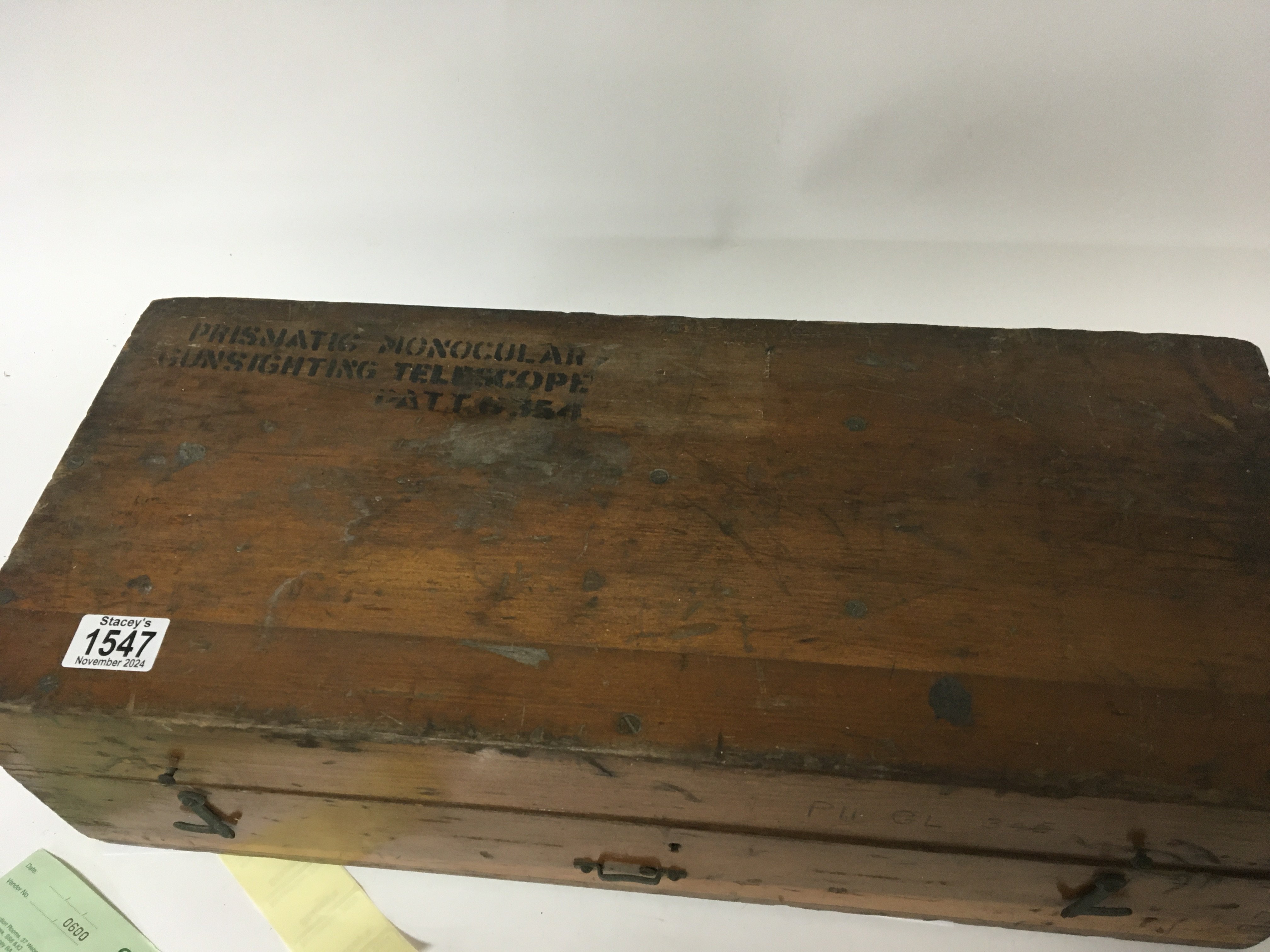 A British Military Prismatic Monocular gunsight in a fitted box.