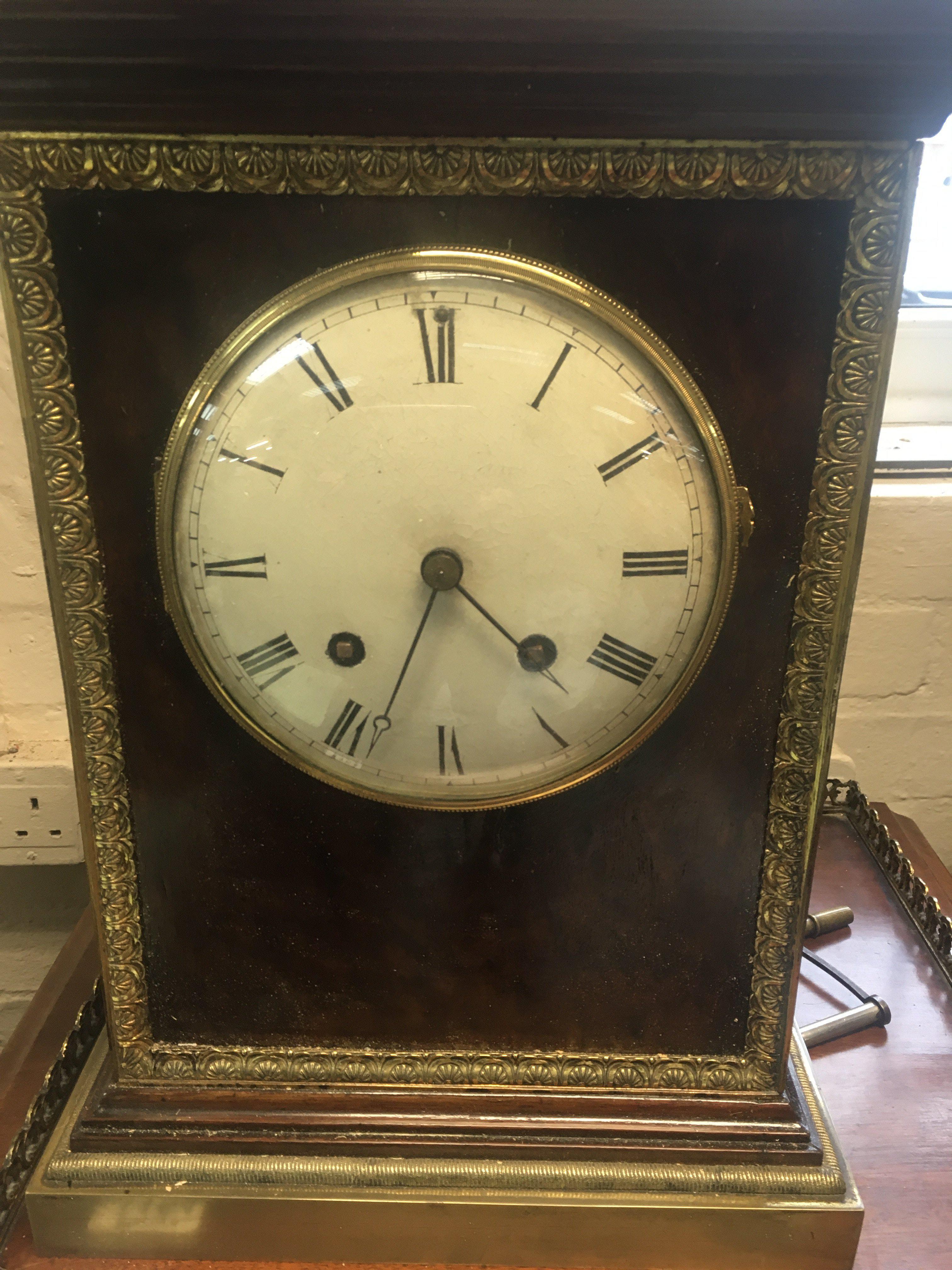 A 19h century French silk suspension table clock the bur and ormaloo cases inset with dial with Roman numerals the movement striking on a bell 43 cm .