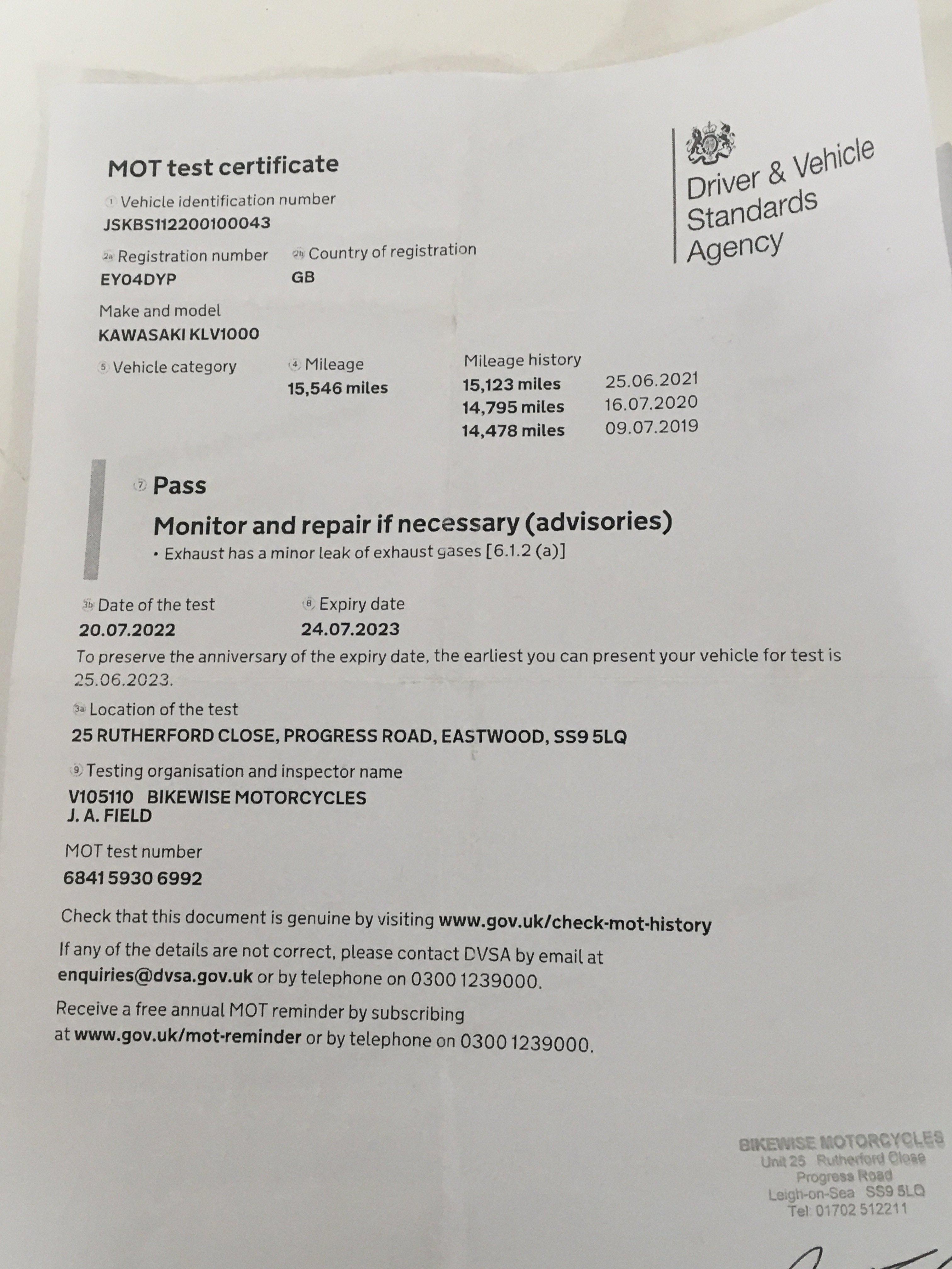 A Kawasaki KLV 1000 motorcycle Registration EY04 DYP. The bike has been garaged stored however it has just had an MOT and new battery fitted in good working order. Sold with V5. Mileage approximately fifteen thousand five hundred.
