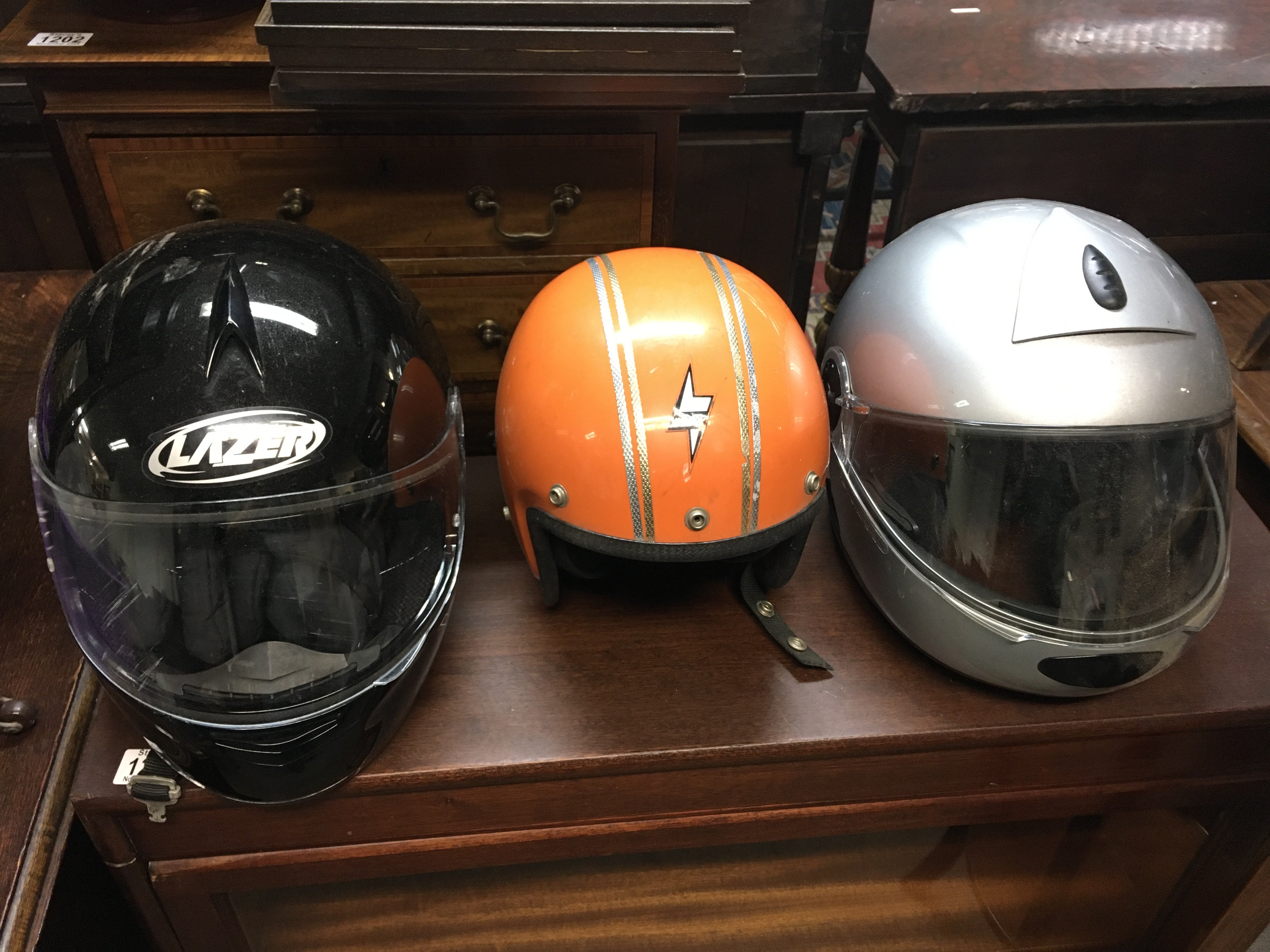 Three motorcycles helmets and a pair of riding boots. Postage C. NO RESERVE