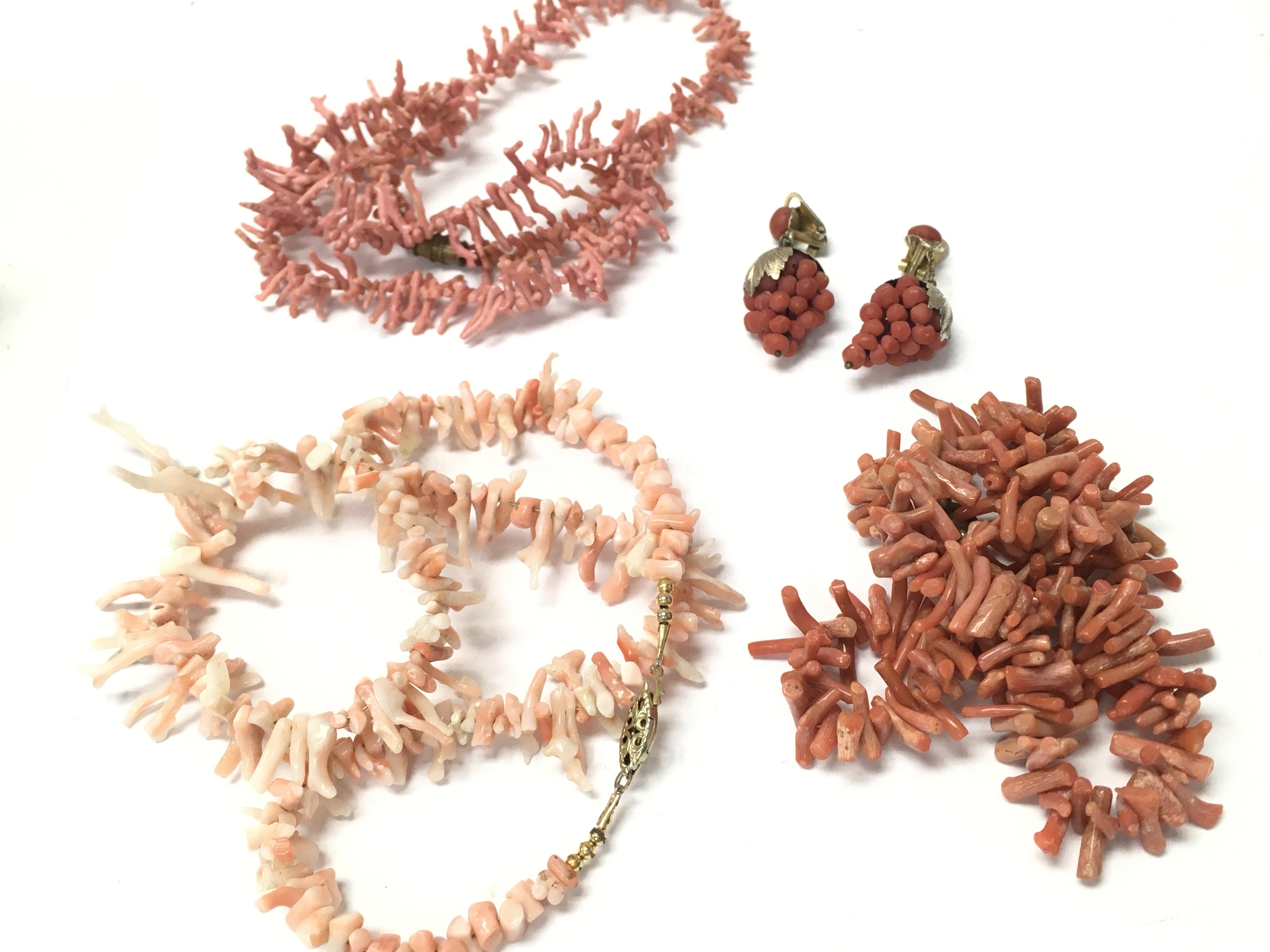 A pair of silver gilt coral bunches of grapes earrings and coral necklaces. Postage category A
