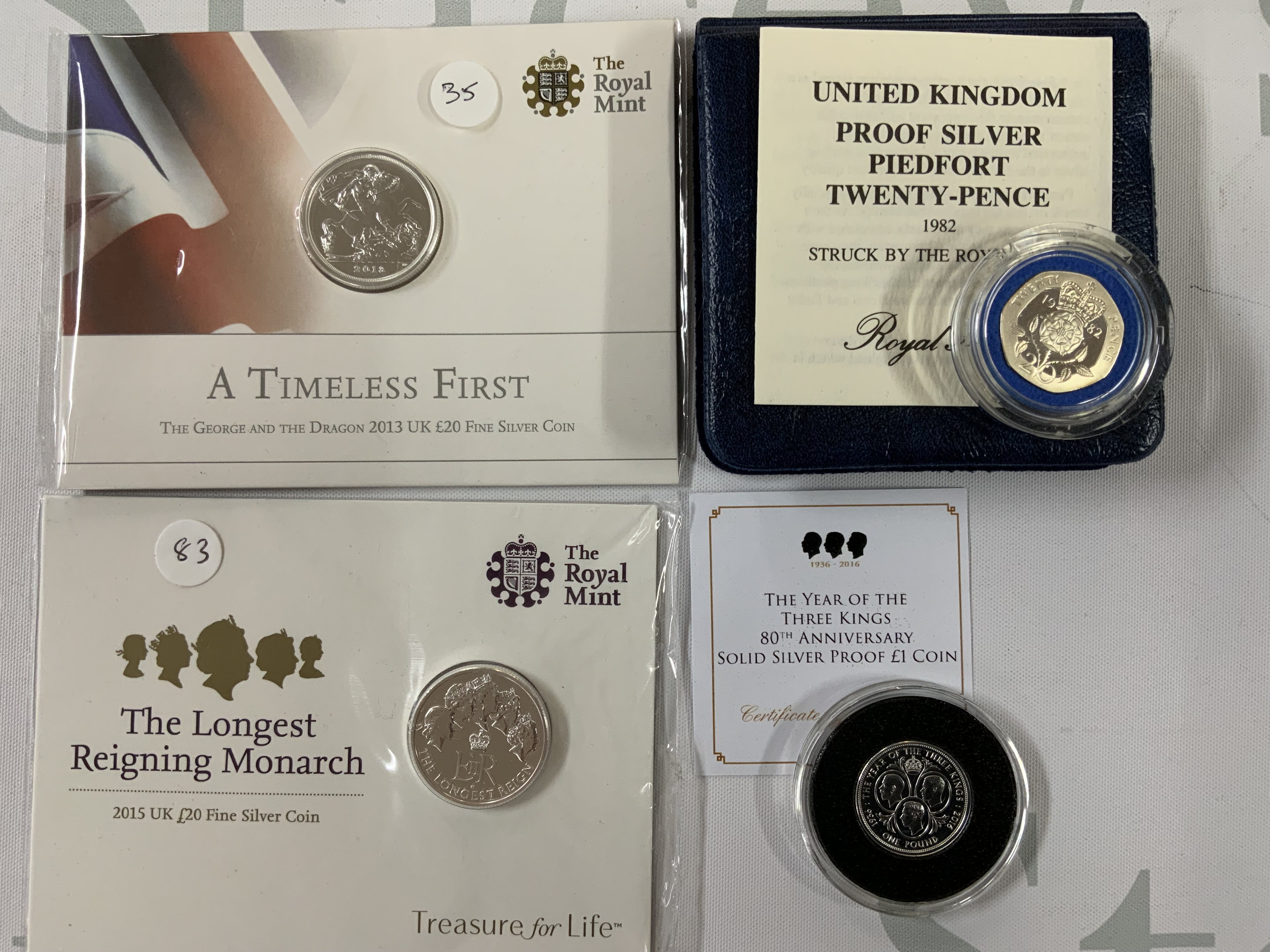 Royal mint issue 2013 UK 20 silver proof coin, 2015 silver proof 20 coin, Sterling silver 80th Anniversary 1 coin, 1982 Piedfort proof 20p. (A)