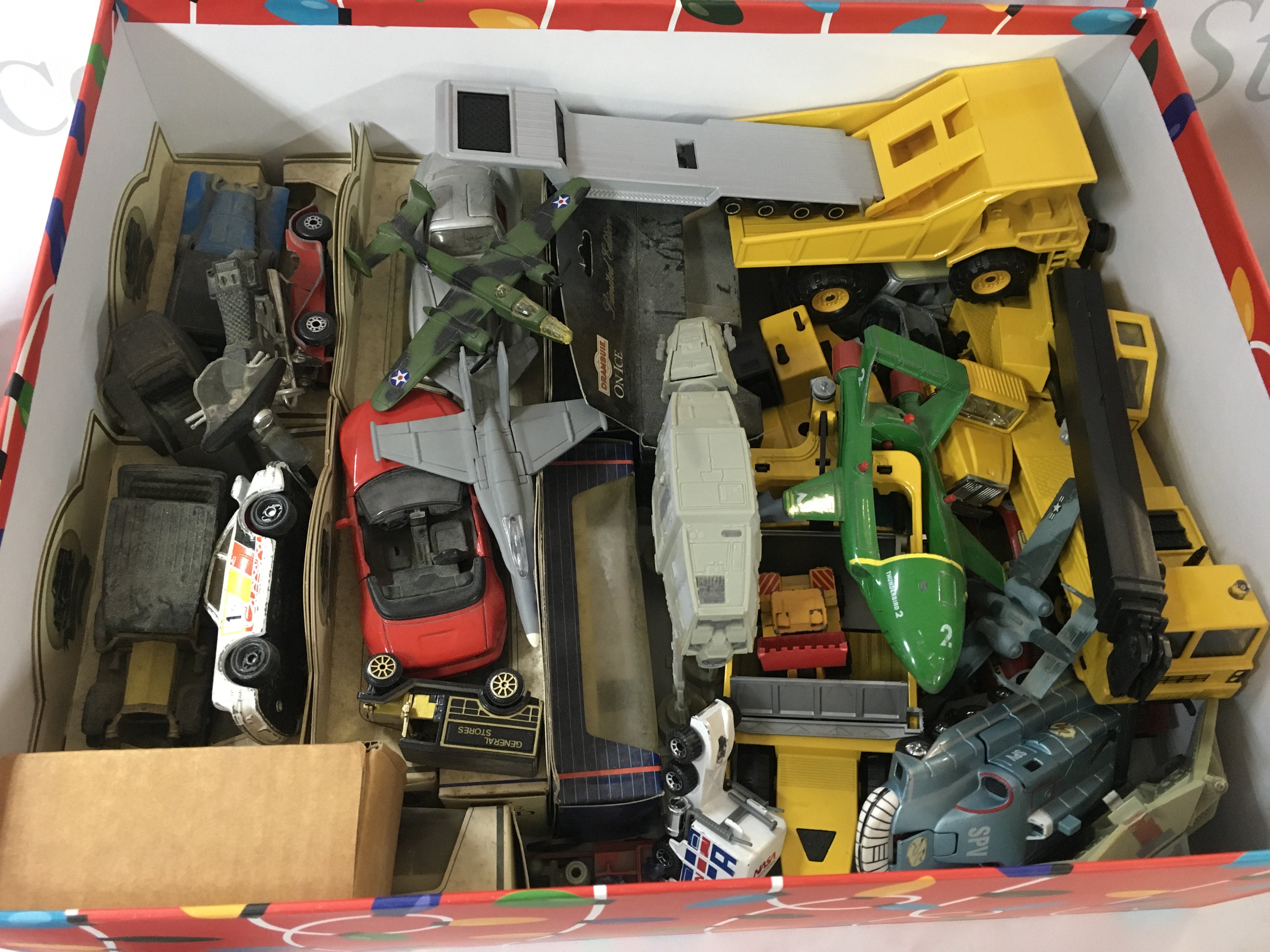 A collection of Playworn toys. Including miniature toy cars and other vehicles and a boxed helicopter.