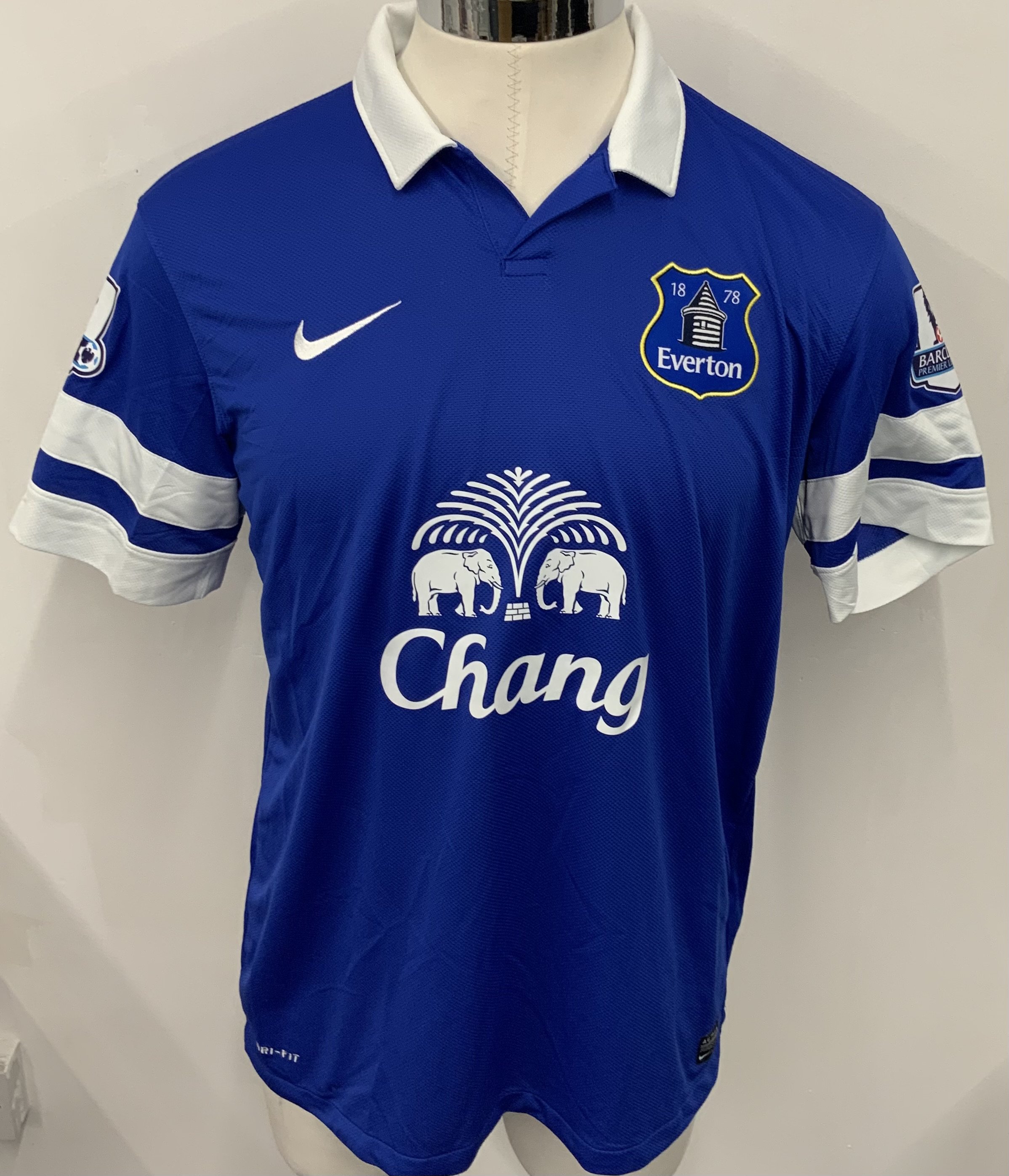 Everton 2013 - 2014 Match Worn Football Shirt: Blue short sleeve Chang sponsored with Barclays Premier League badging to arms. Number 18 Barry to rear.