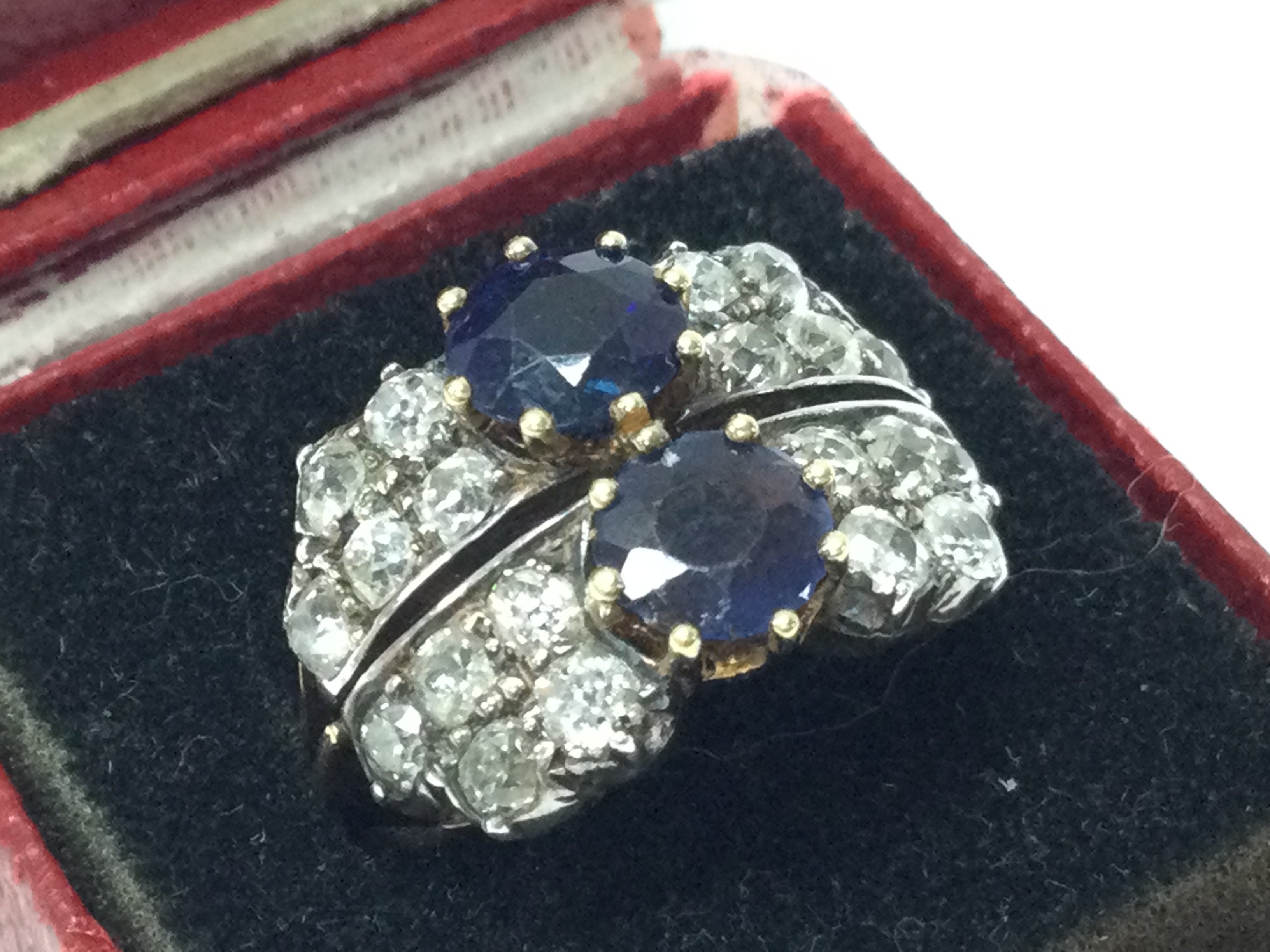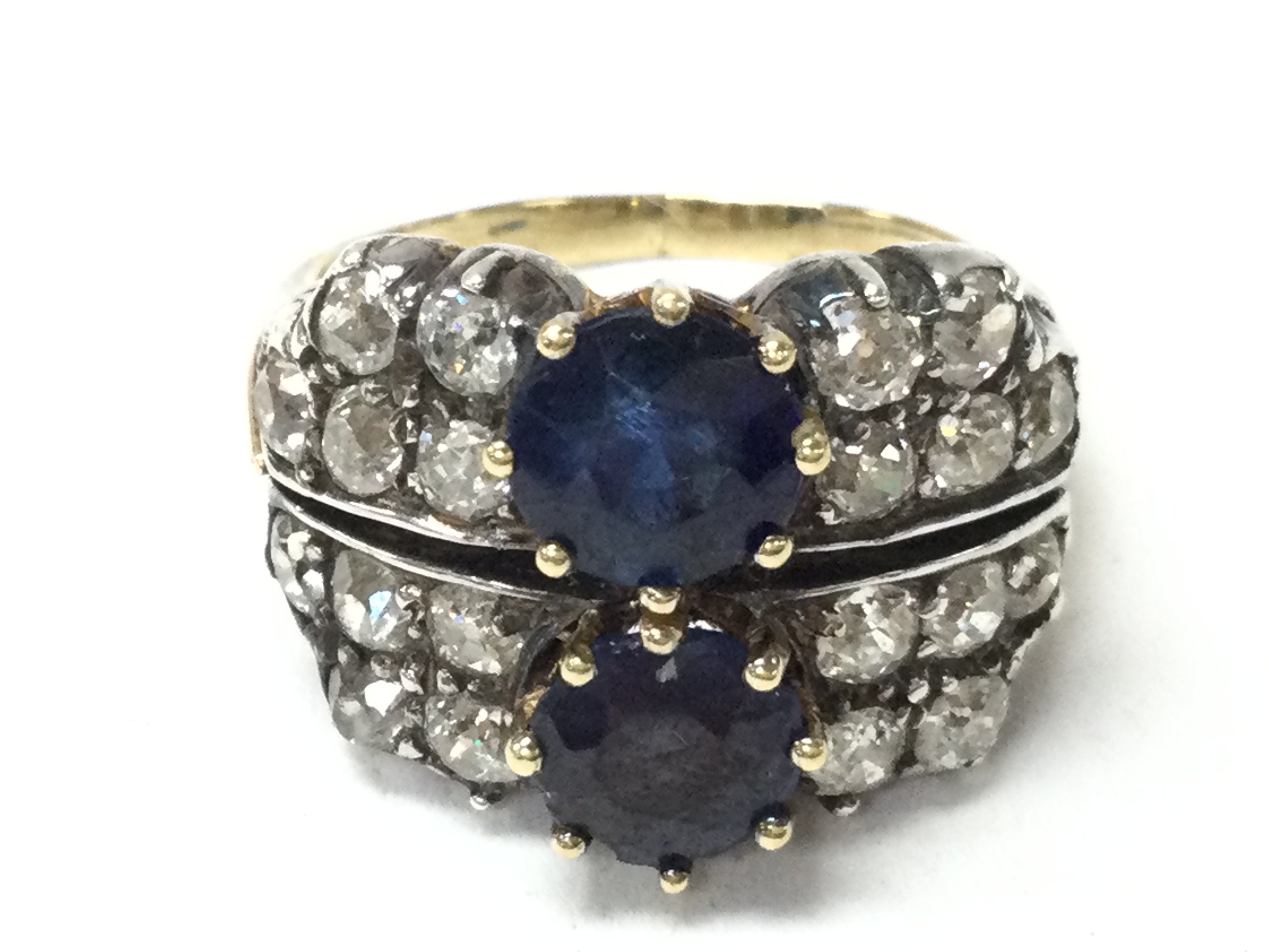An Unmarked (tested) 18ct gold two stone sapphire and diamond cluster cocktail ring (Mix of Diamonds and Moissonite) (A).