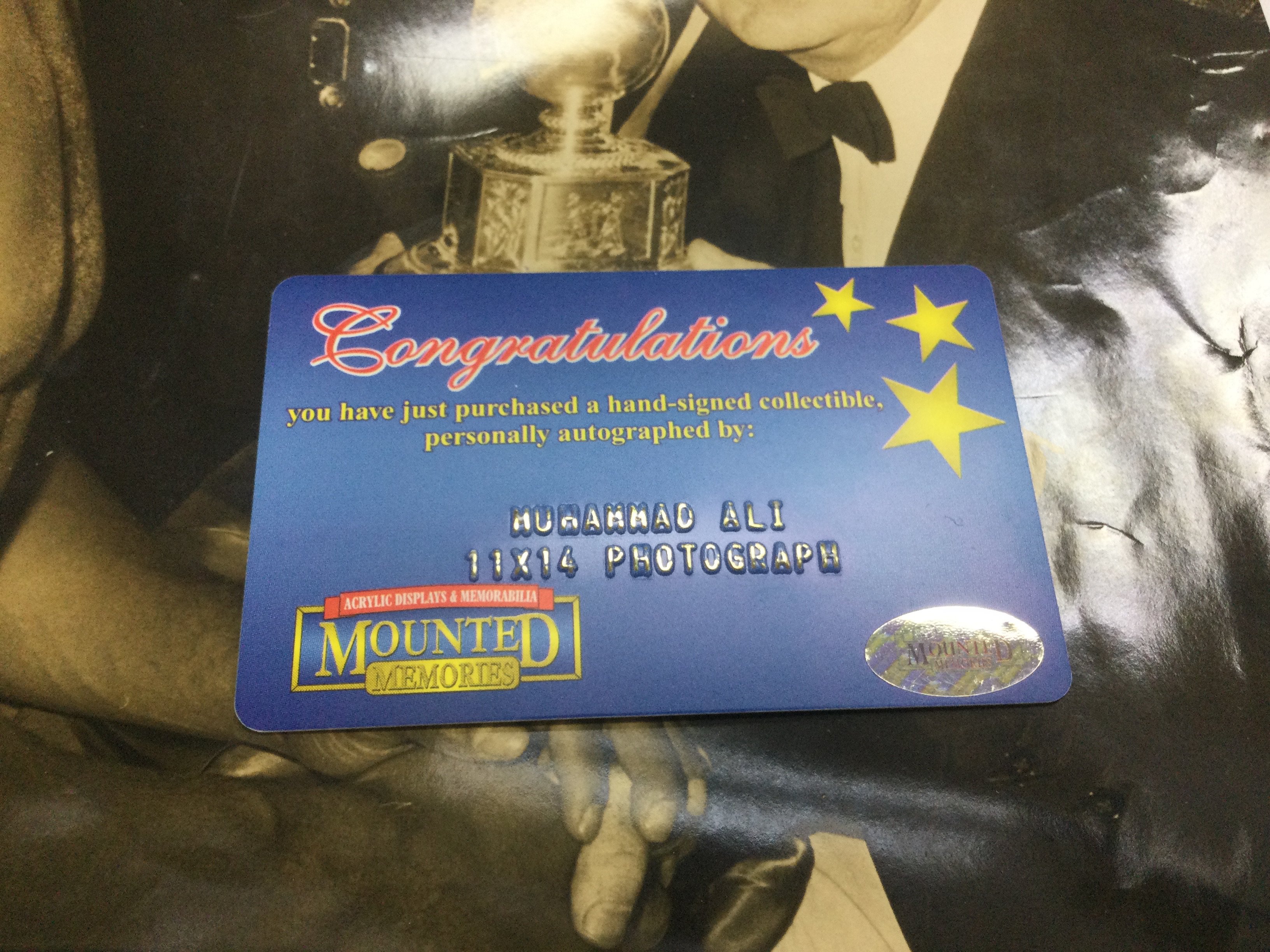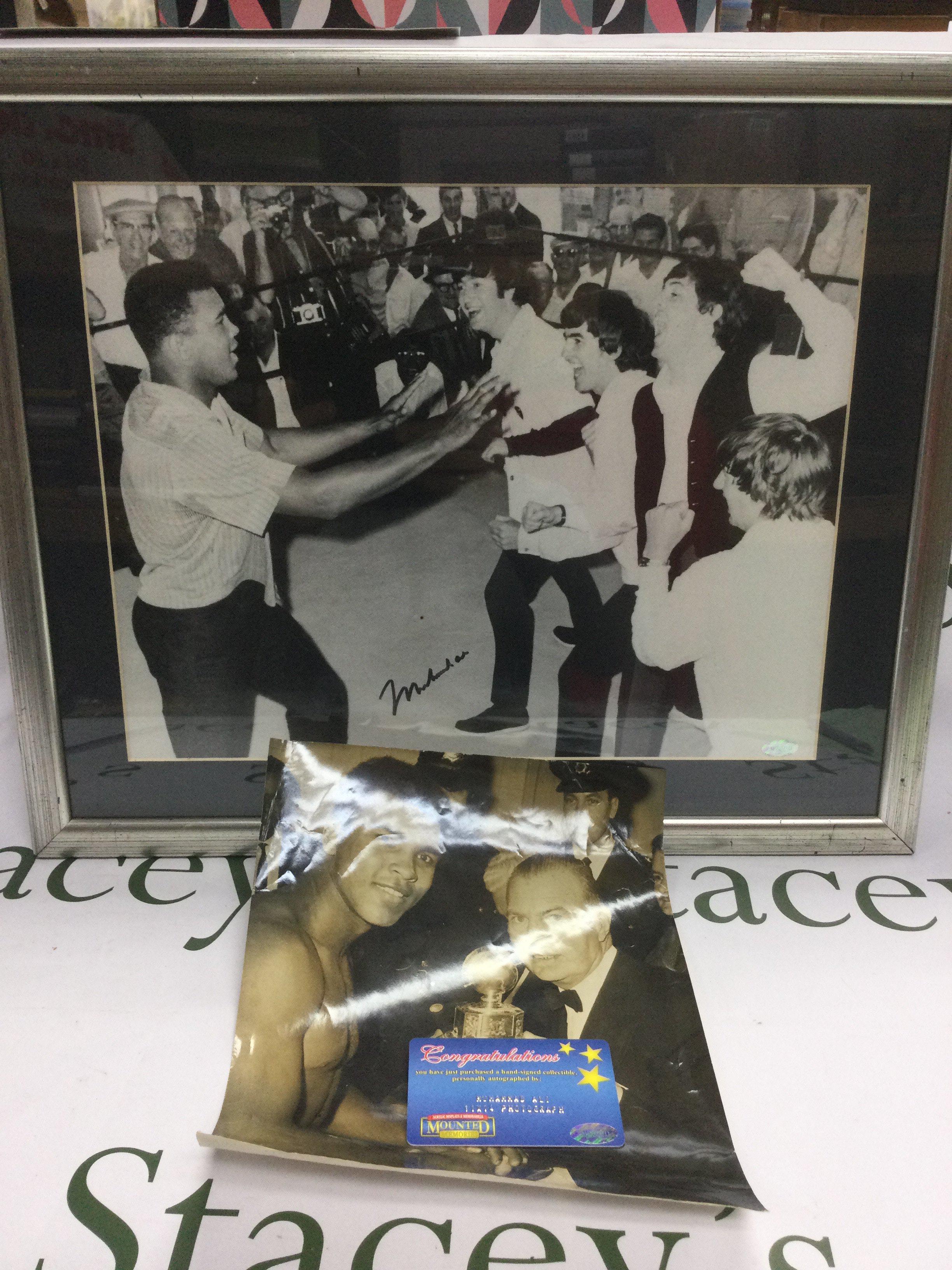 A framed and glazed signed print of Muhammad Ali with The Beatles, signed by Ali only. Comes with a further unsigned print of Ali and a COA. Shipping category D.