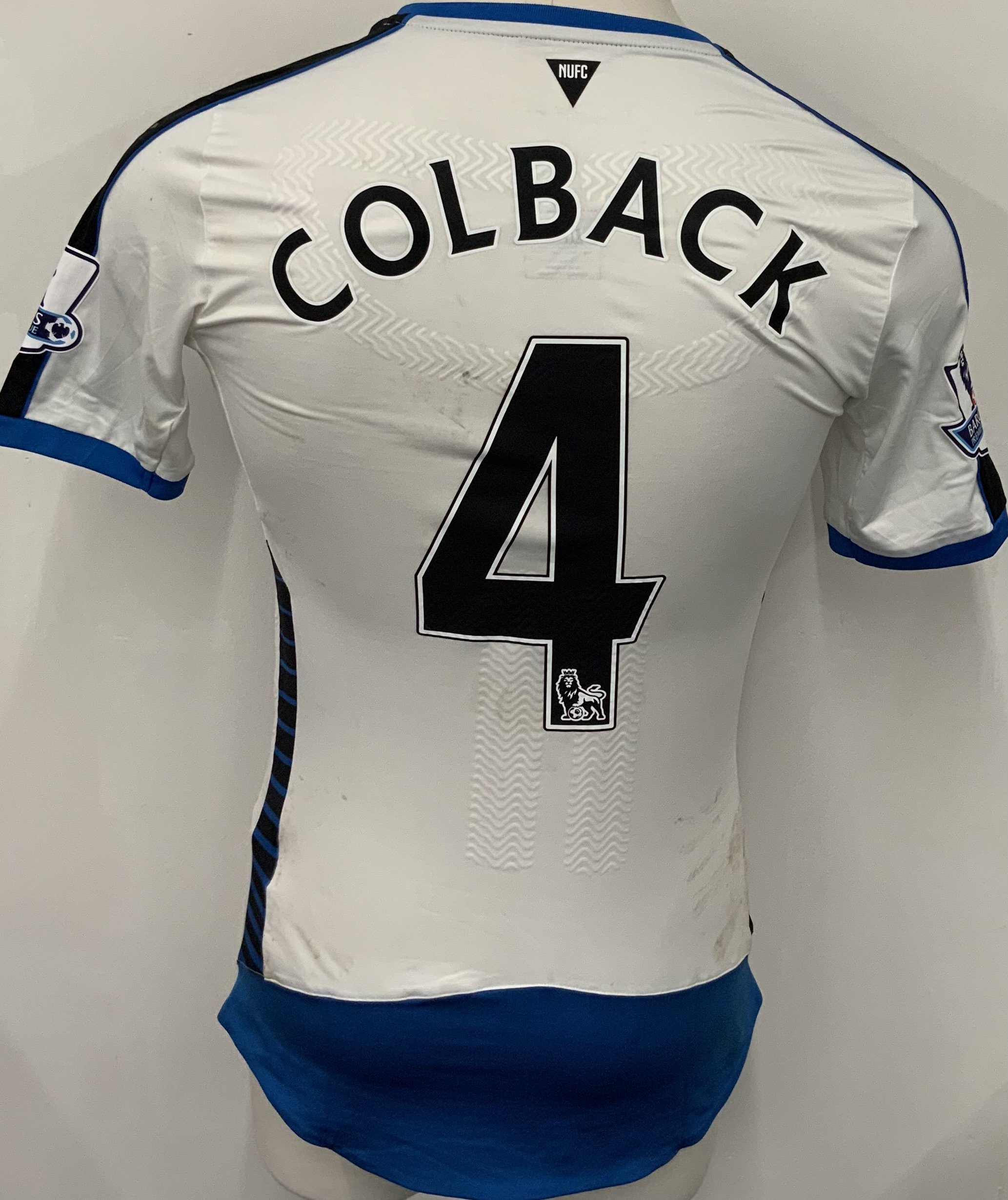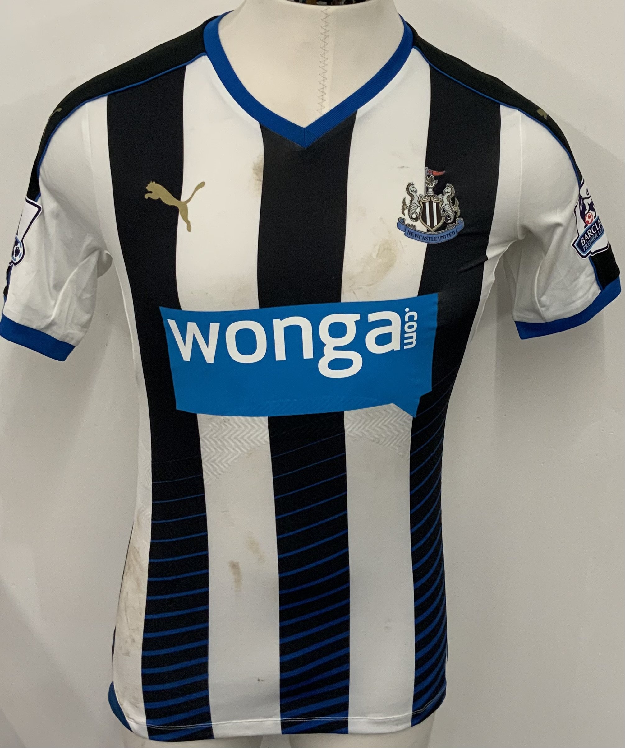 Newcastle United 2015 - 2016 Match Worn Football Shirt: Black and white short sleeve Wonga sponsored shirt with Premier League badging to arms. Number 4 Colback to rear. Unwashed.
