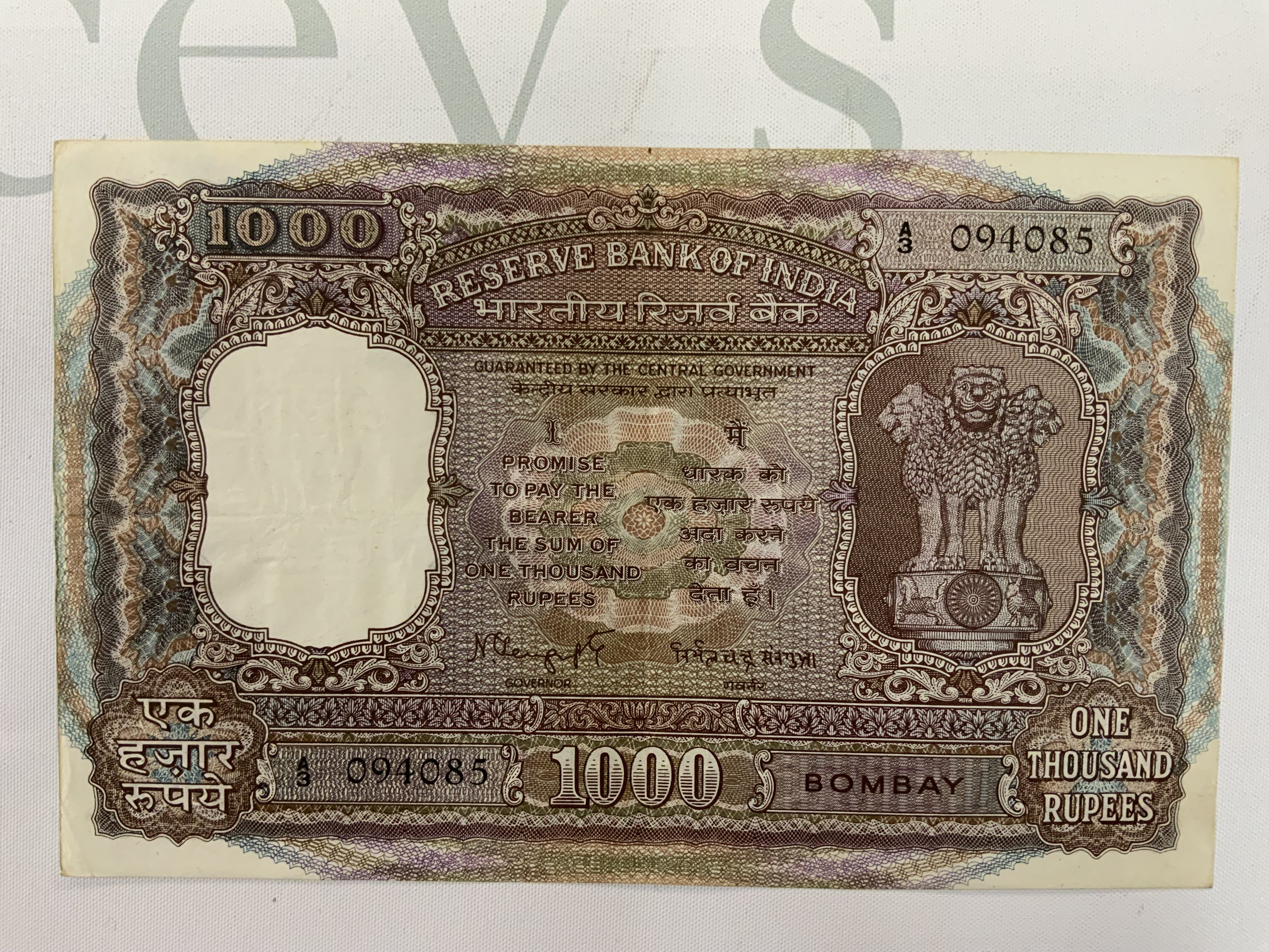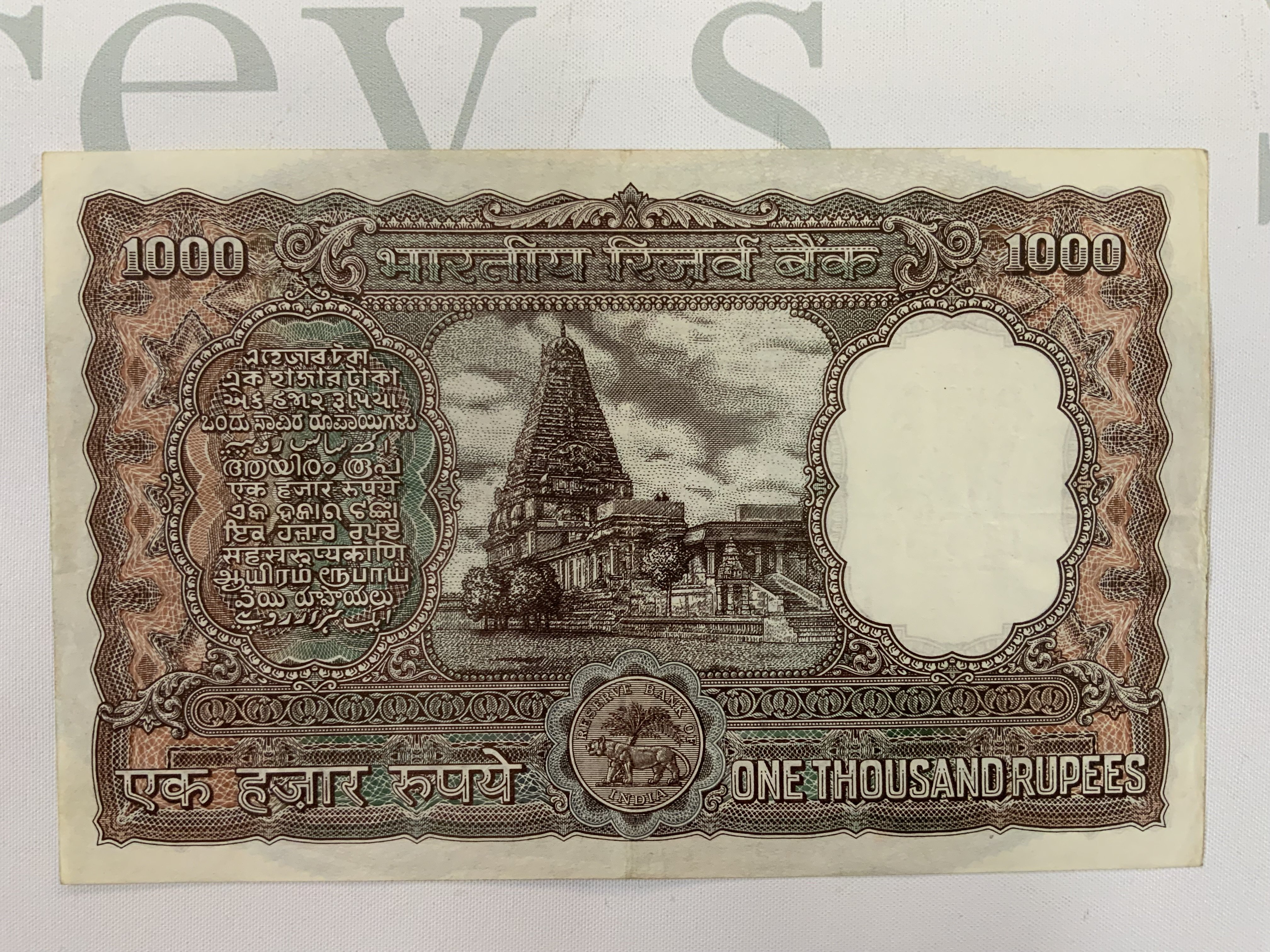 Reserve Bank of India, 1000 rupees, ND (1954-57), serial number A/3 094085, Brihadeeswarar temple at Thanjavur in Tamilnadu at centre. (A)