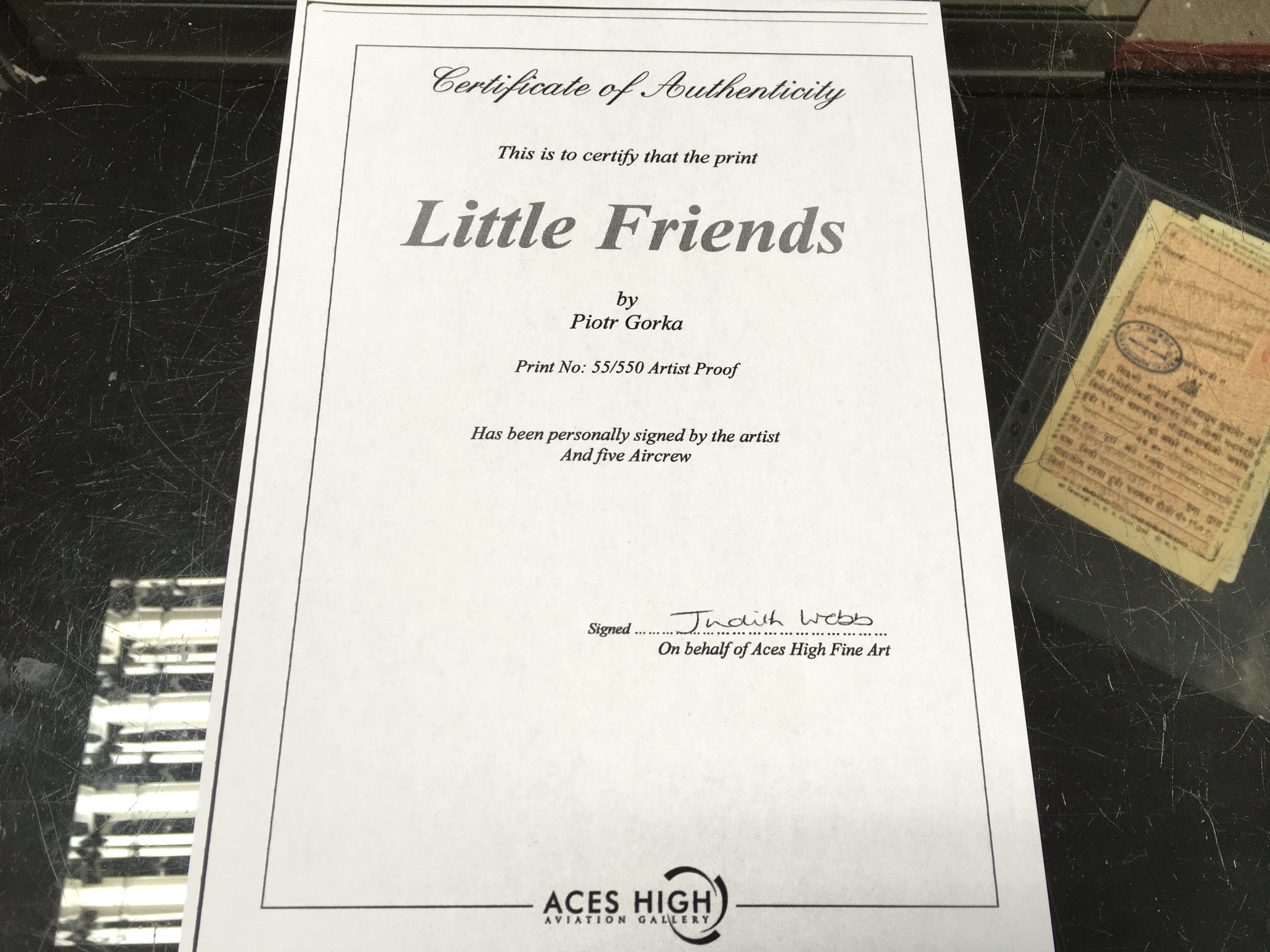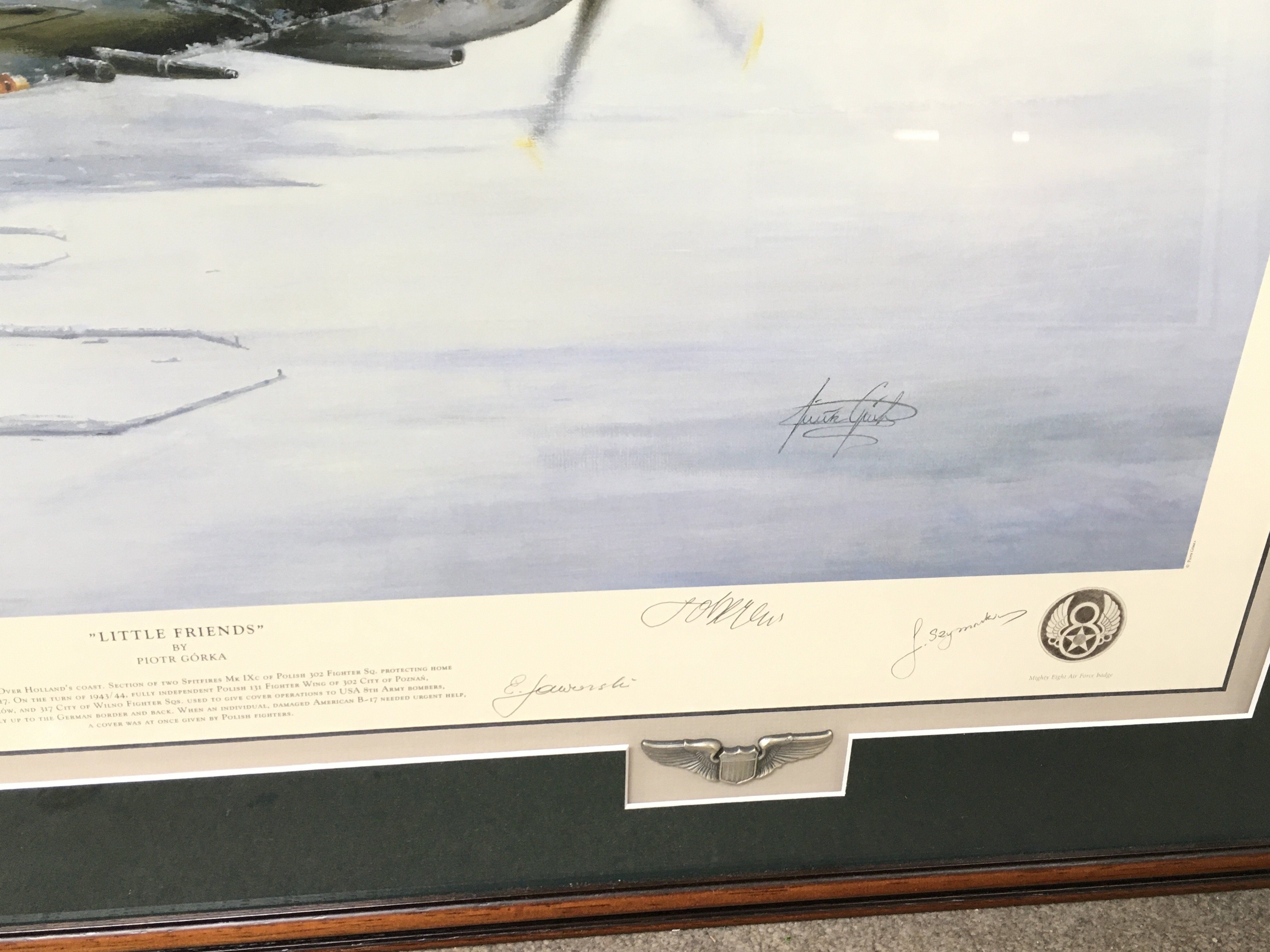 A multi signed limited edition print titled little friends. Signatures by artist and 5 aircrew. Comes with COA and in conservation frame. 103cm by 83. Postage D