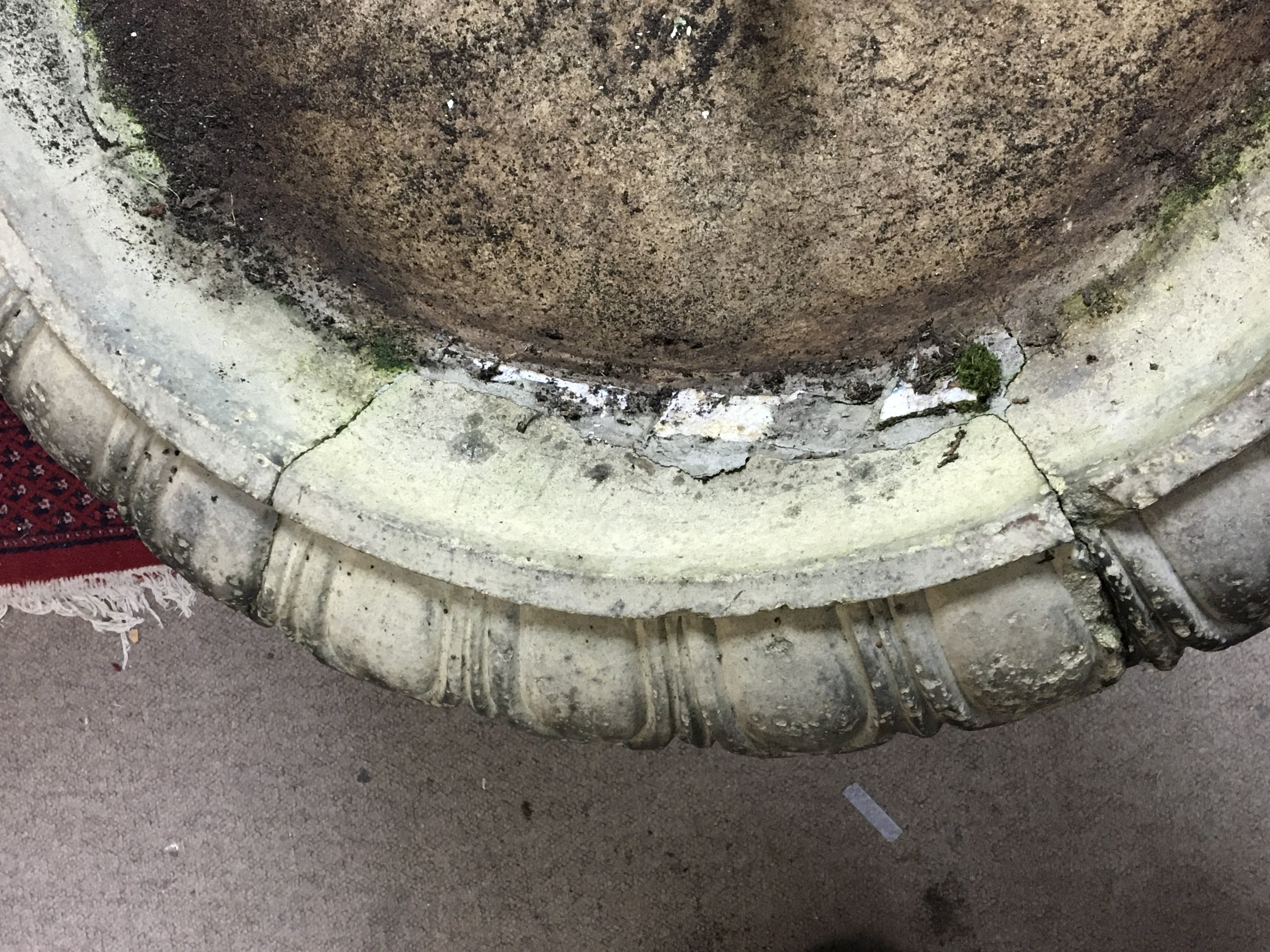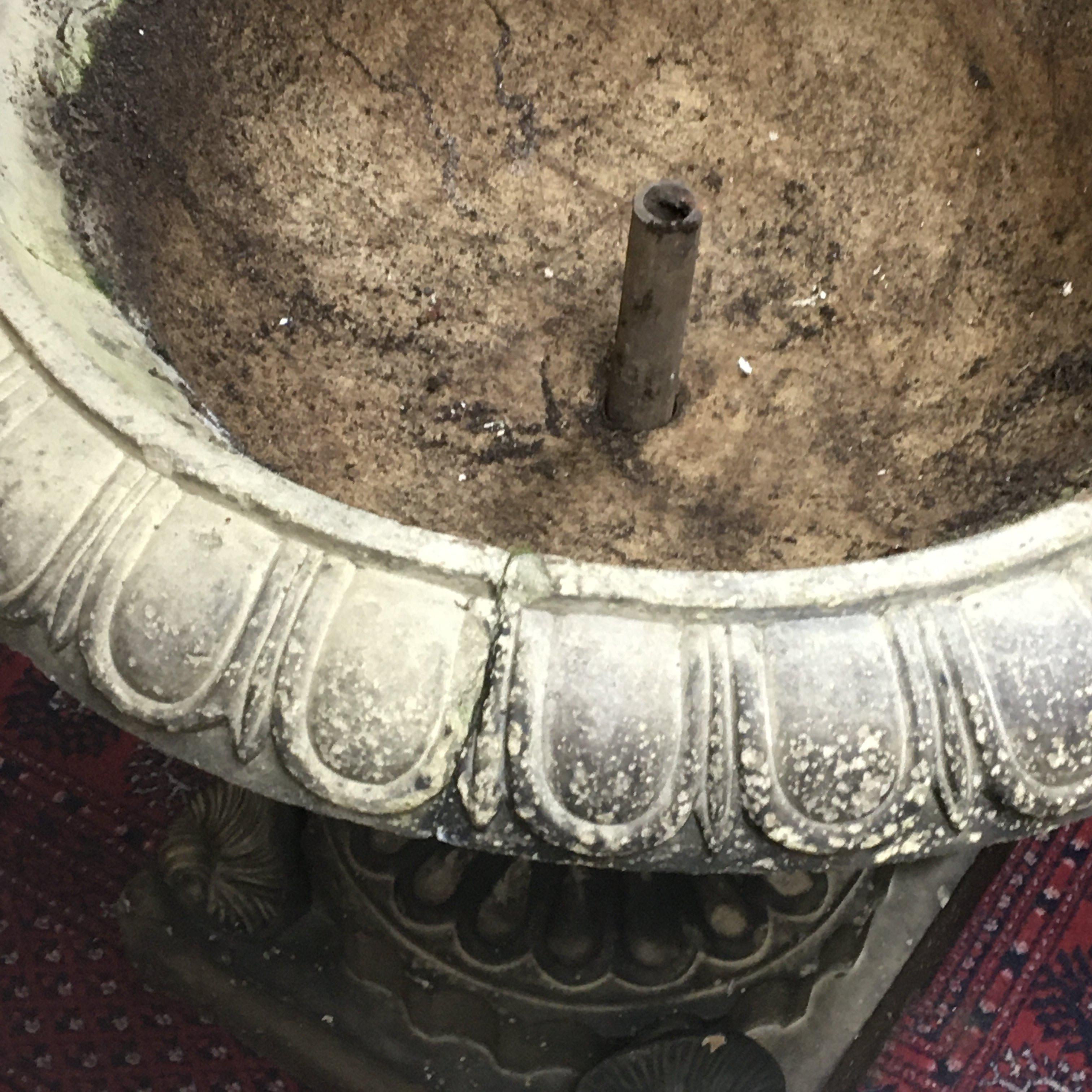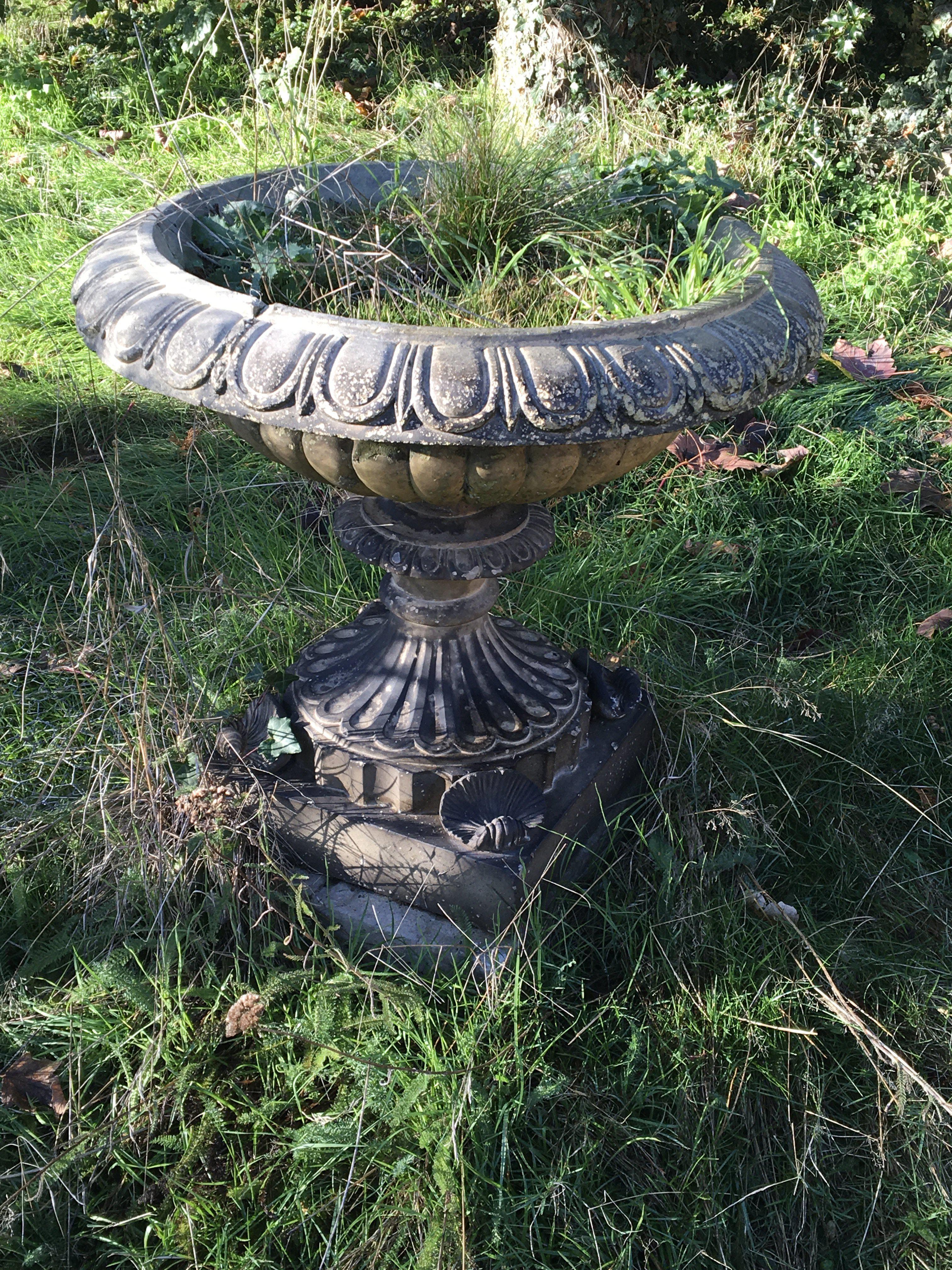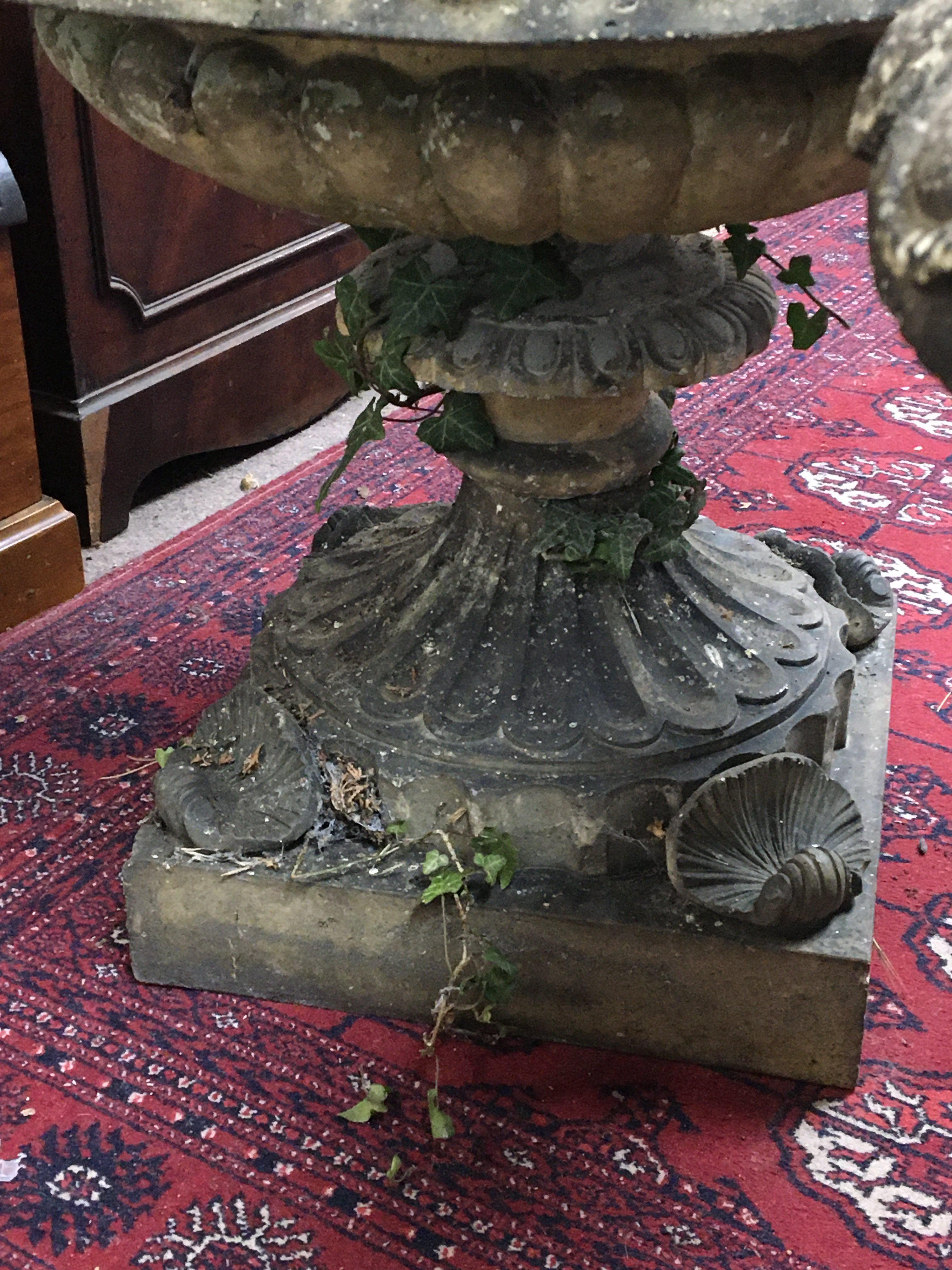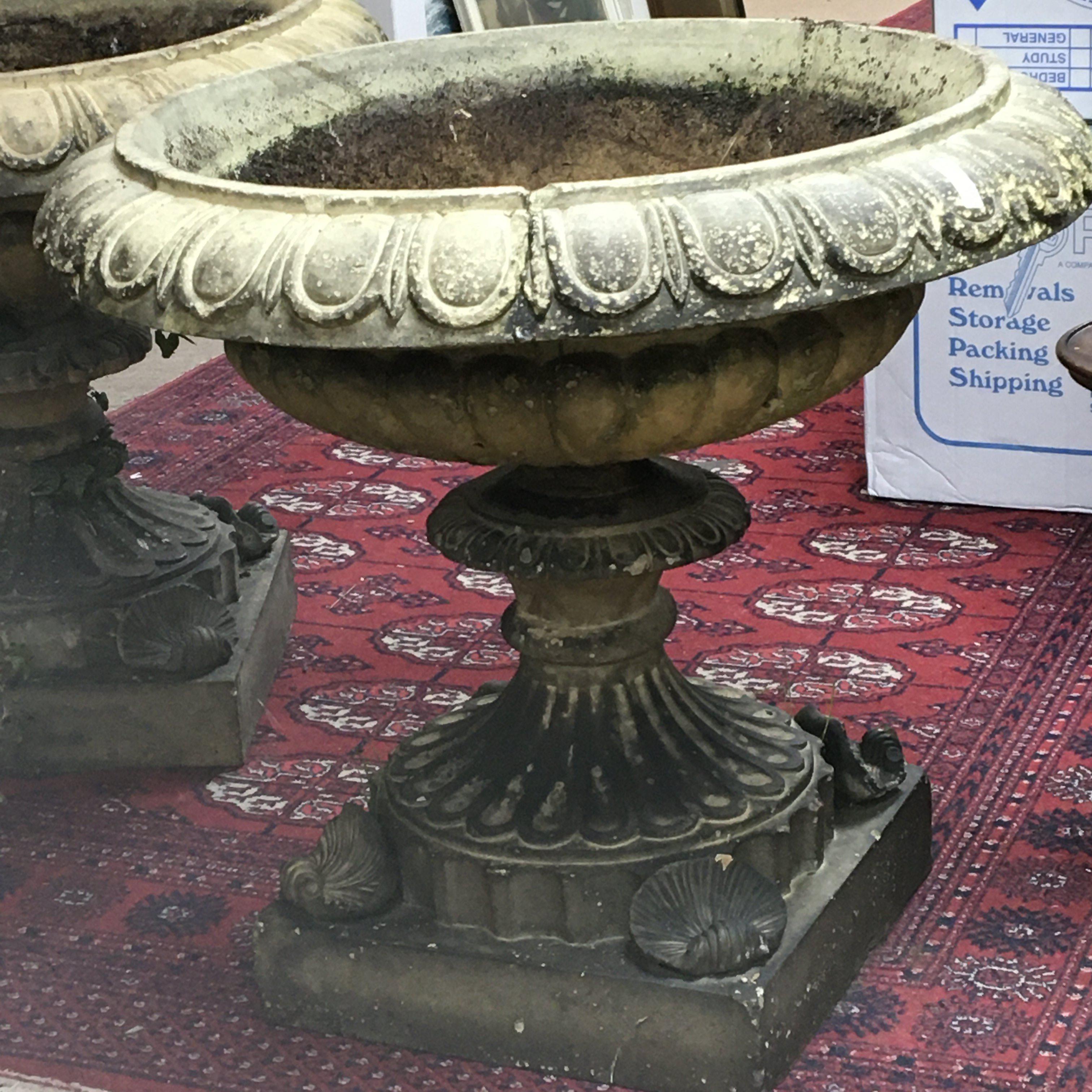 A pair of late 19th century elaborate Neo Classical garden urns composition but not concrete. the wide tops with a moulded edge on a shaped column the square bases with raised corner shell motif. Diameter 65cm height 56cm. Very slight crack see image to one edge and minor chips.