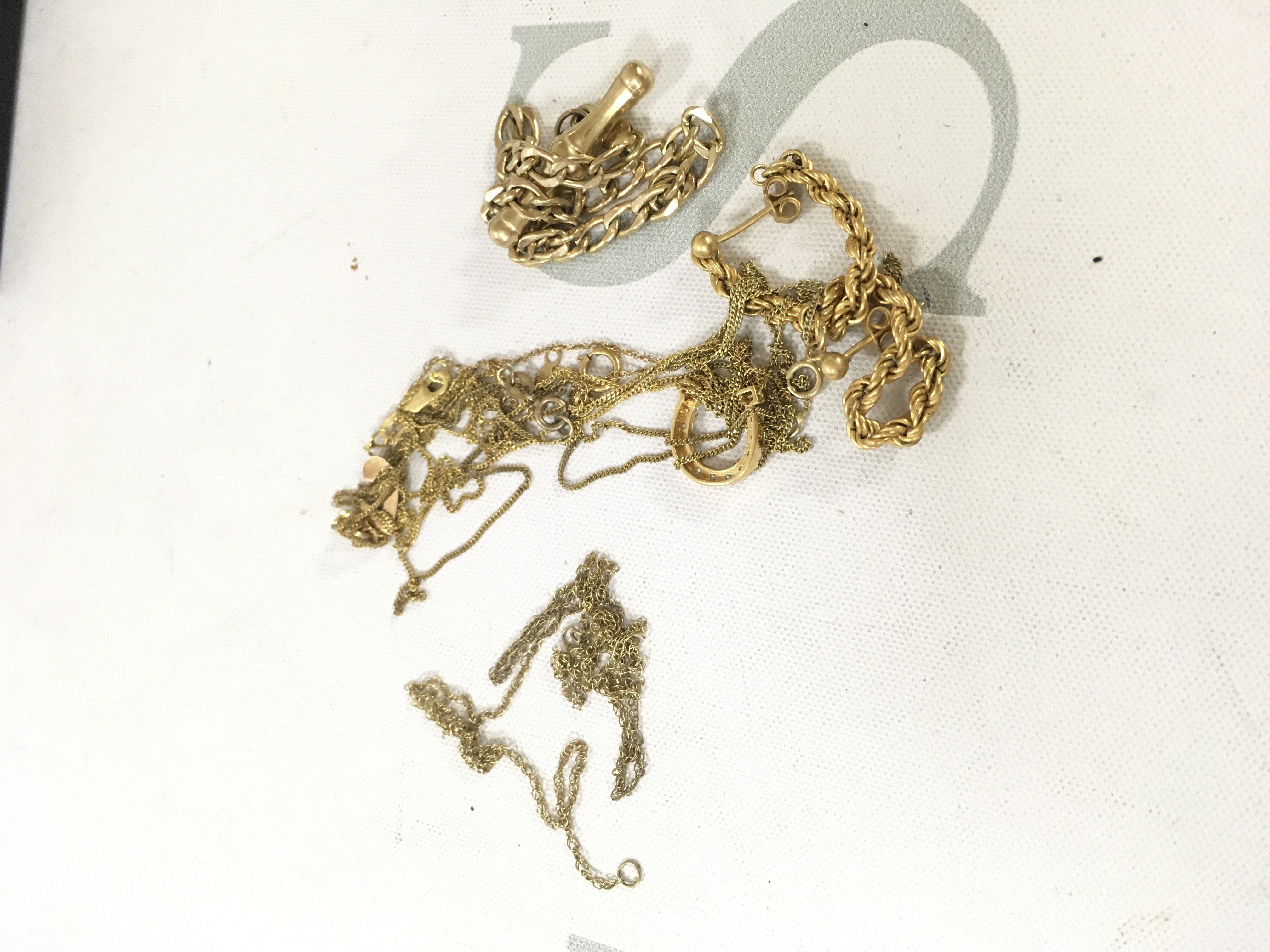 A collection of 9ct gold and yellow metal items including chains, bracelets and a pair of earrings.