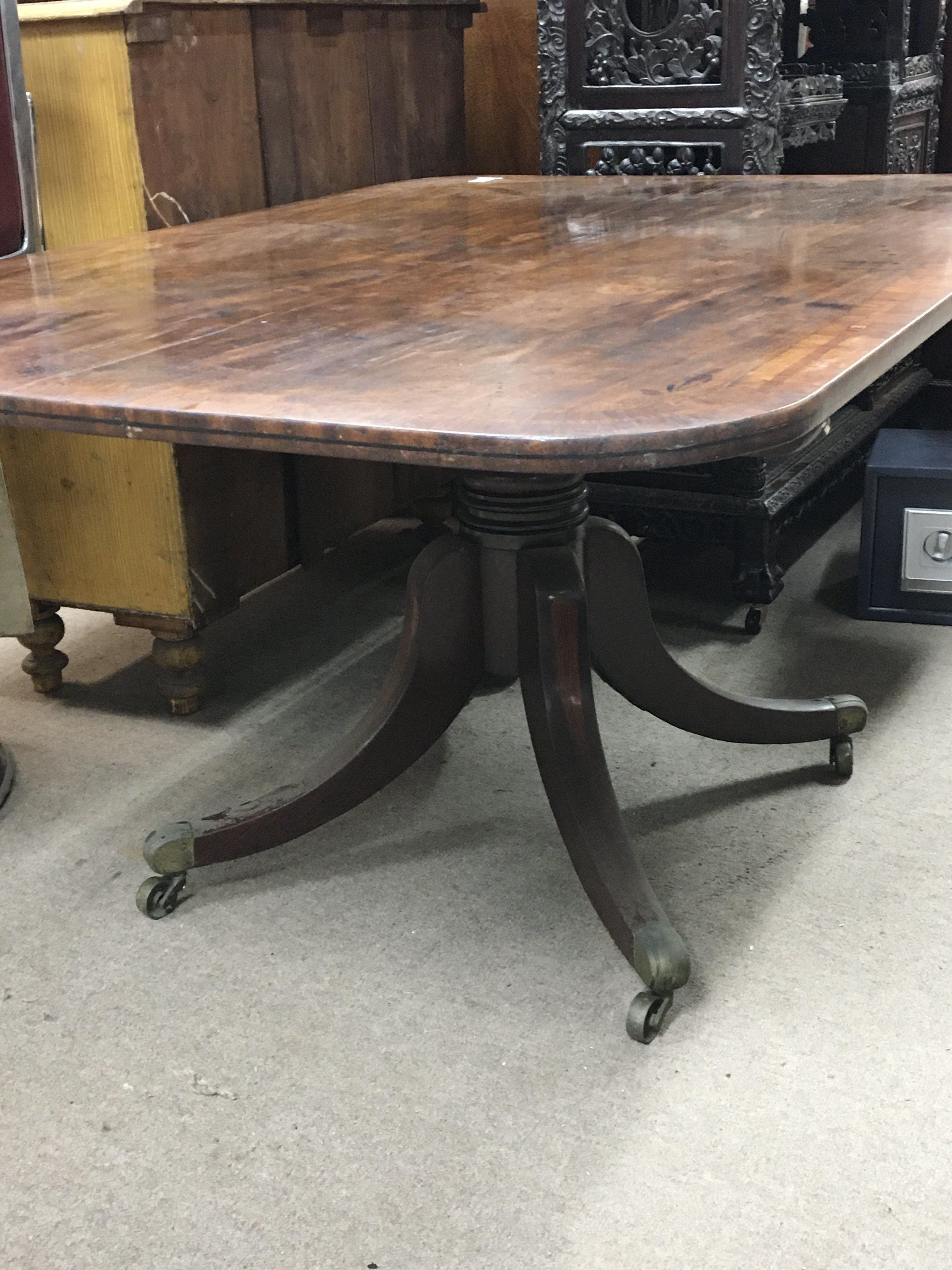 A George III mahogany tip action dining table with a cross-banded edge on splayed inlaid legs terminating in brass cap and caster 148cmx100cm